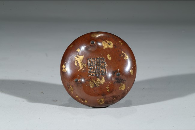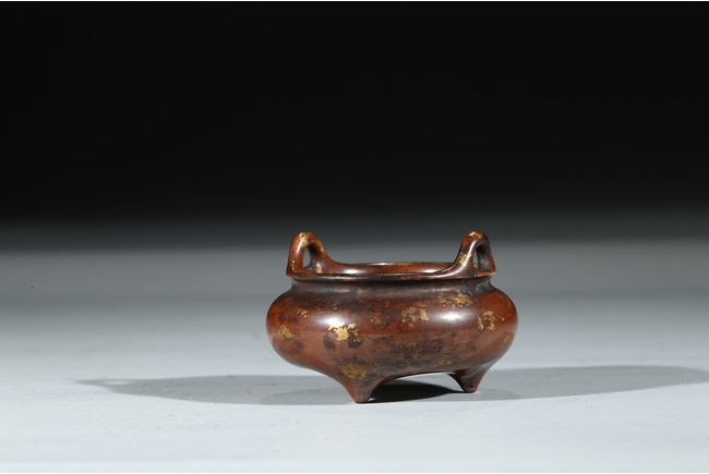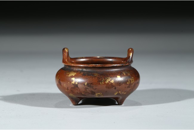 Of bombé form supported on three triangular feet and set with two D-shaped handles at the rim, covered overall in a brown glaze suffused with gilt speckles, the base with six character Qianlong mark. Qing Dynasty period.