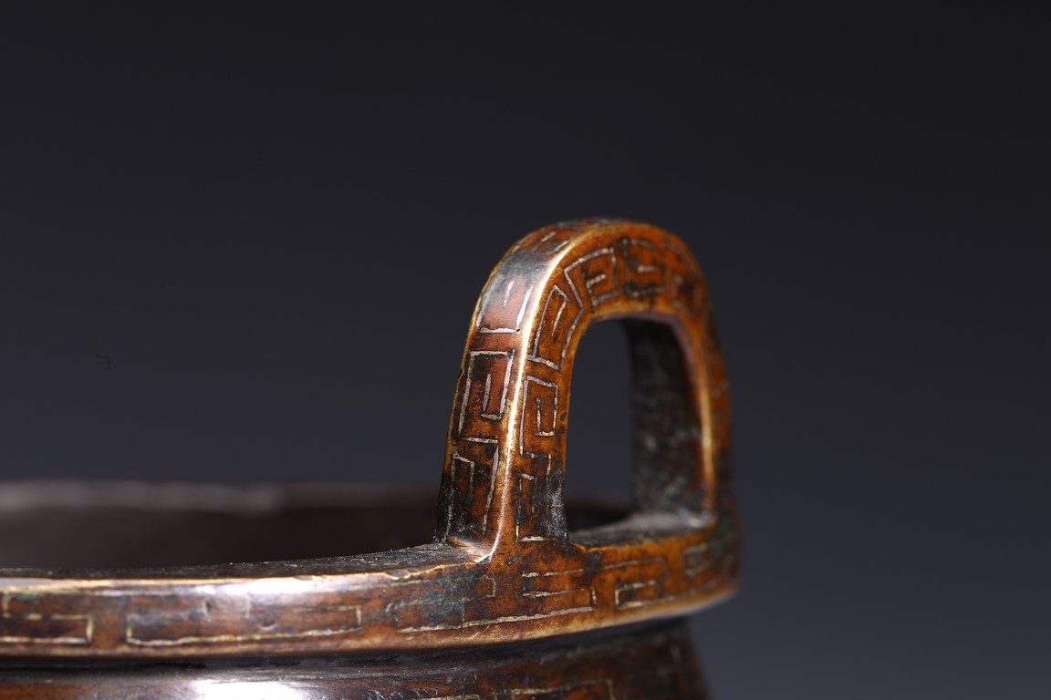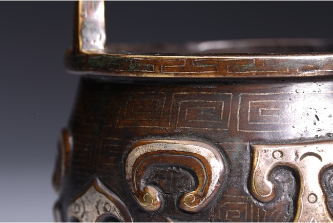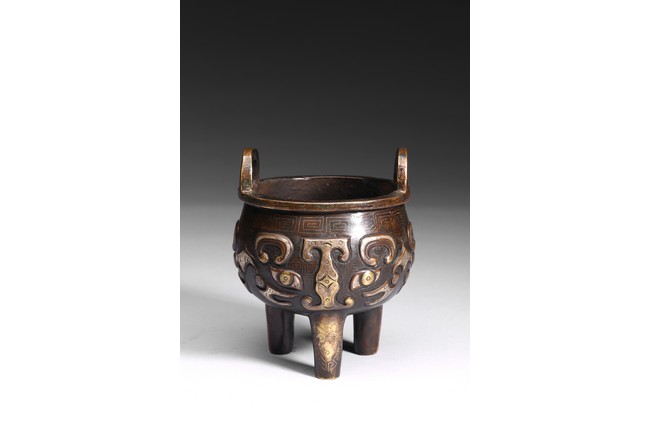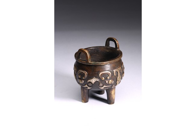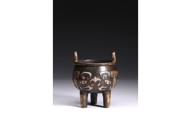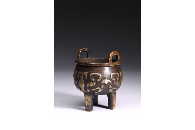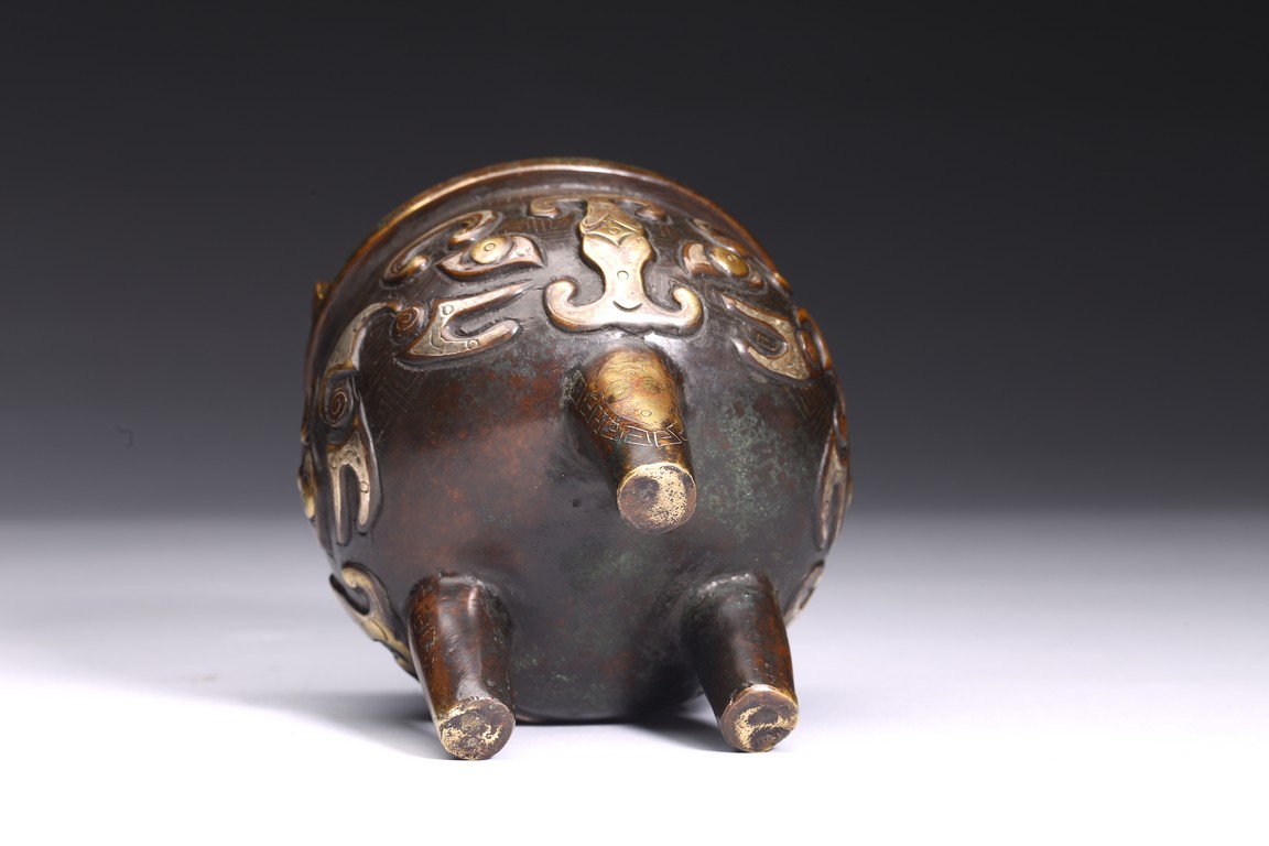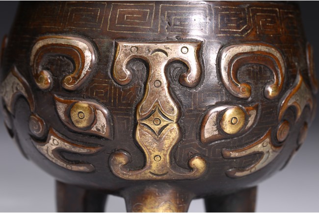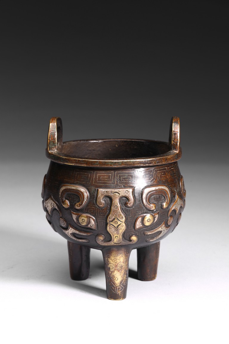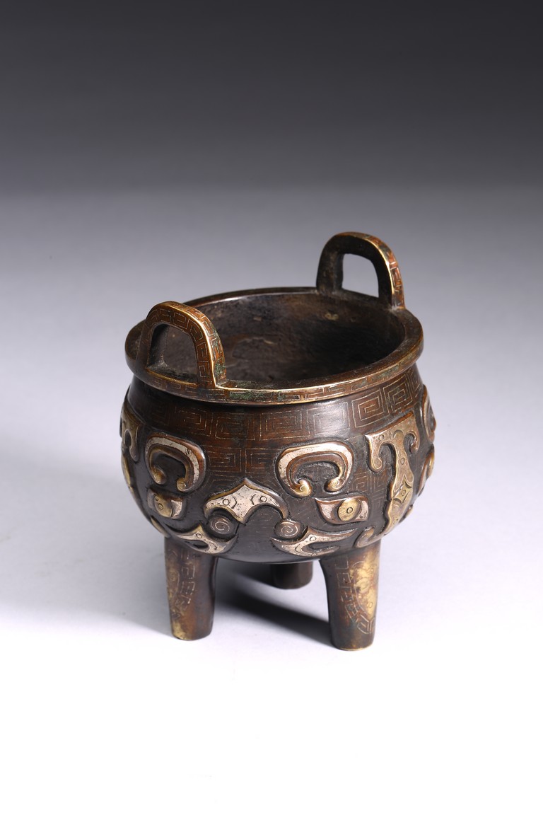 The censer is decorated in silver wire to the exterior of the body with a raised archaistic taotie mask to each side, surrounded by geometric key-fret designs. The tall legs are each inlaid with a stylised leaf pattern. Qing Dynasty period.