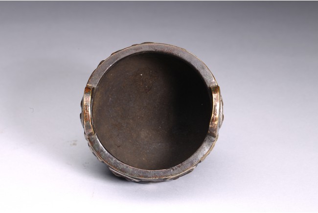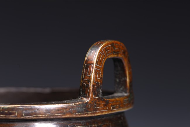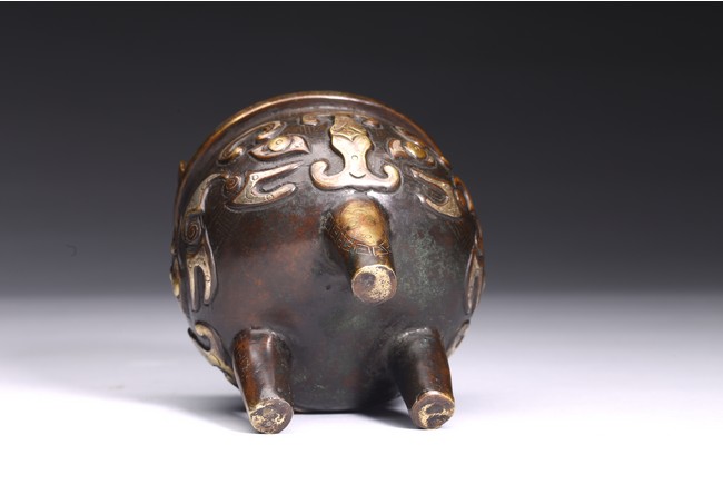 本件器物造型敦實厚重,雙耳衝天耳,腹部渾圓,三柱足,腹部飾“迴紋”“饕餮紋”,紋飾華美,工藝精湛。