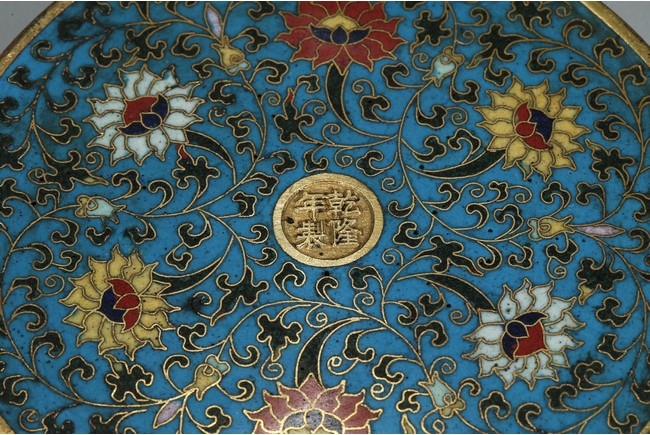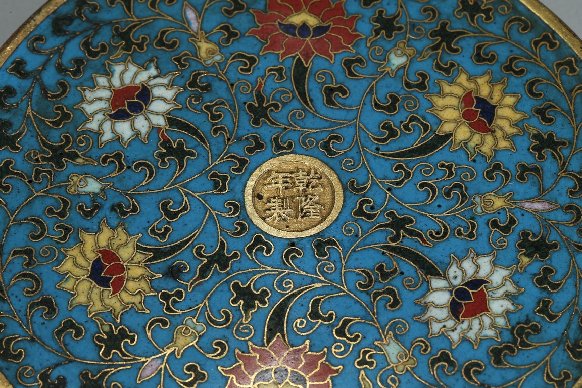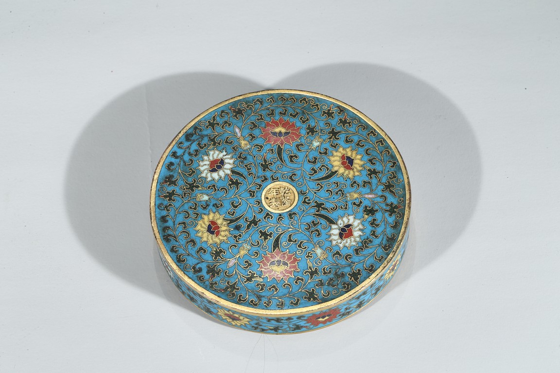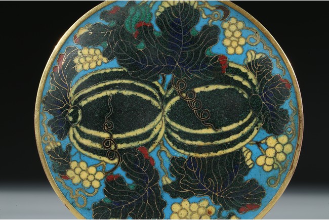 Of circular form, the box enamelled with two large melons and fruits borne on leafy branches, the side decorated with lotus scrolls, the base with four character Qianlong mark, all reserved on turquoise ground. Qing Dynasty period.