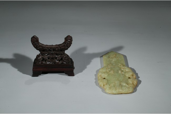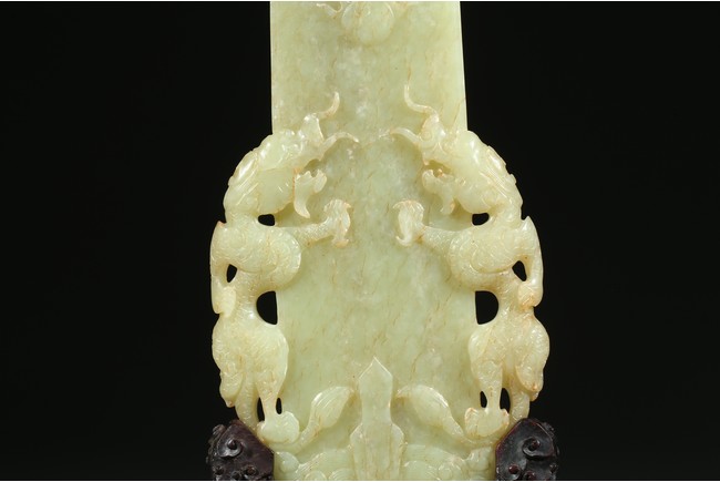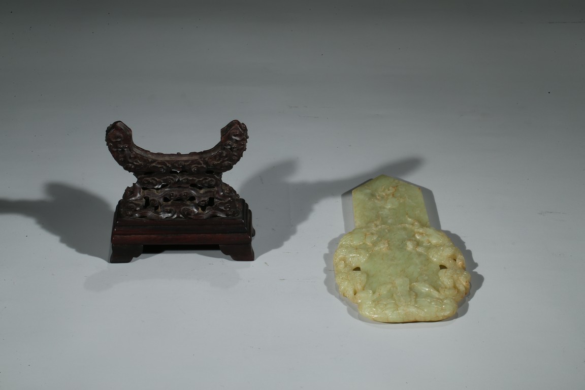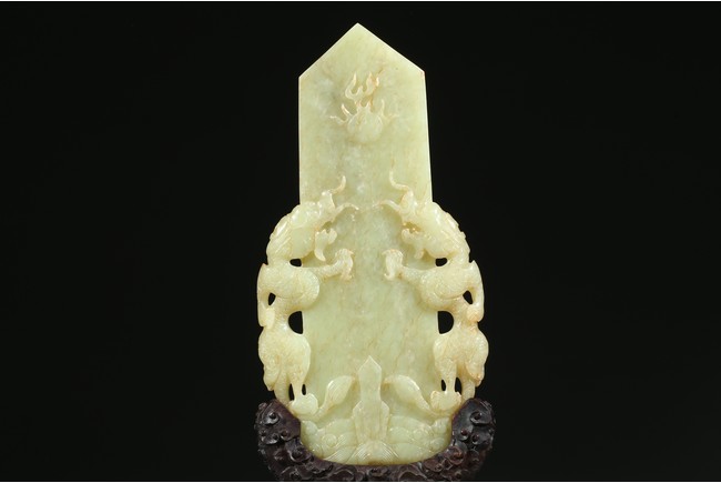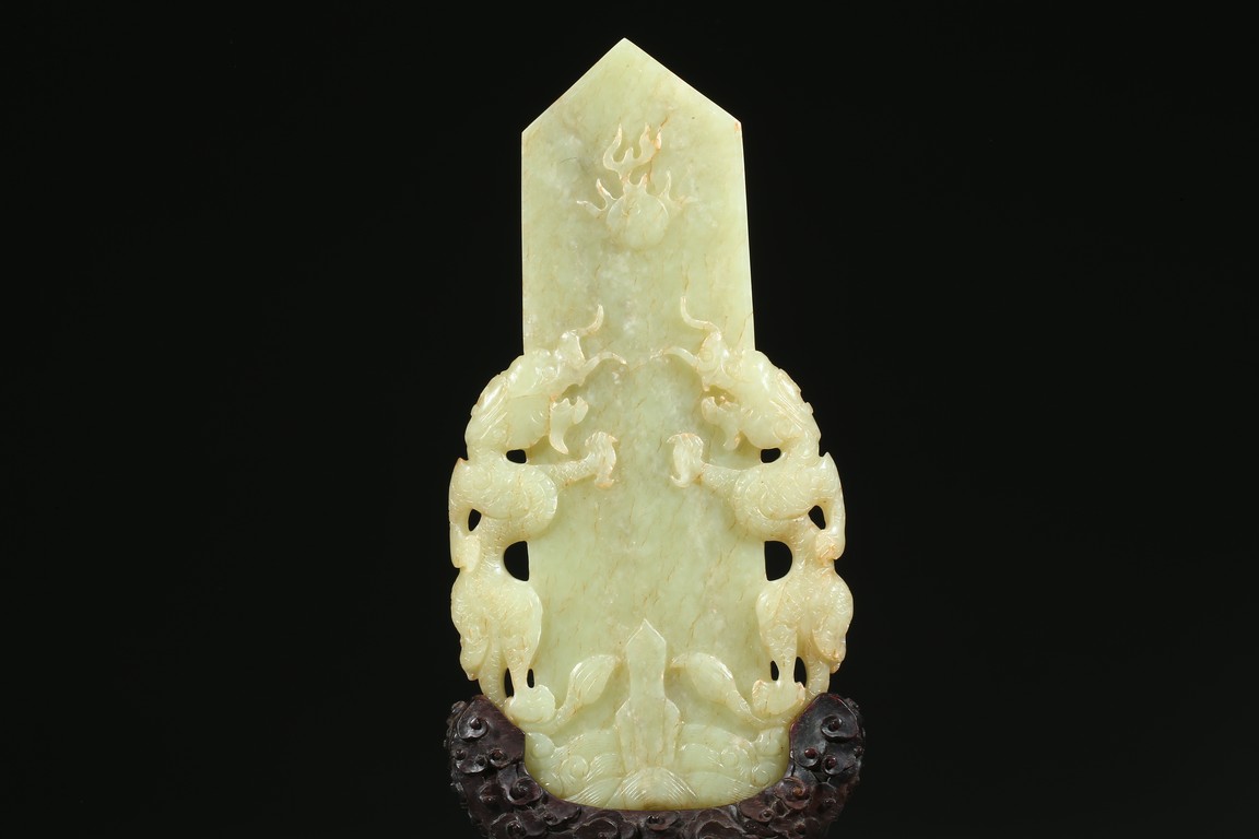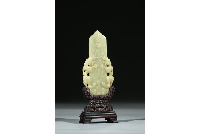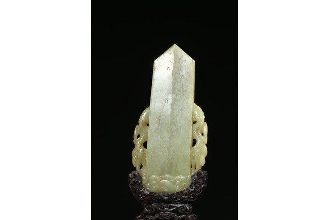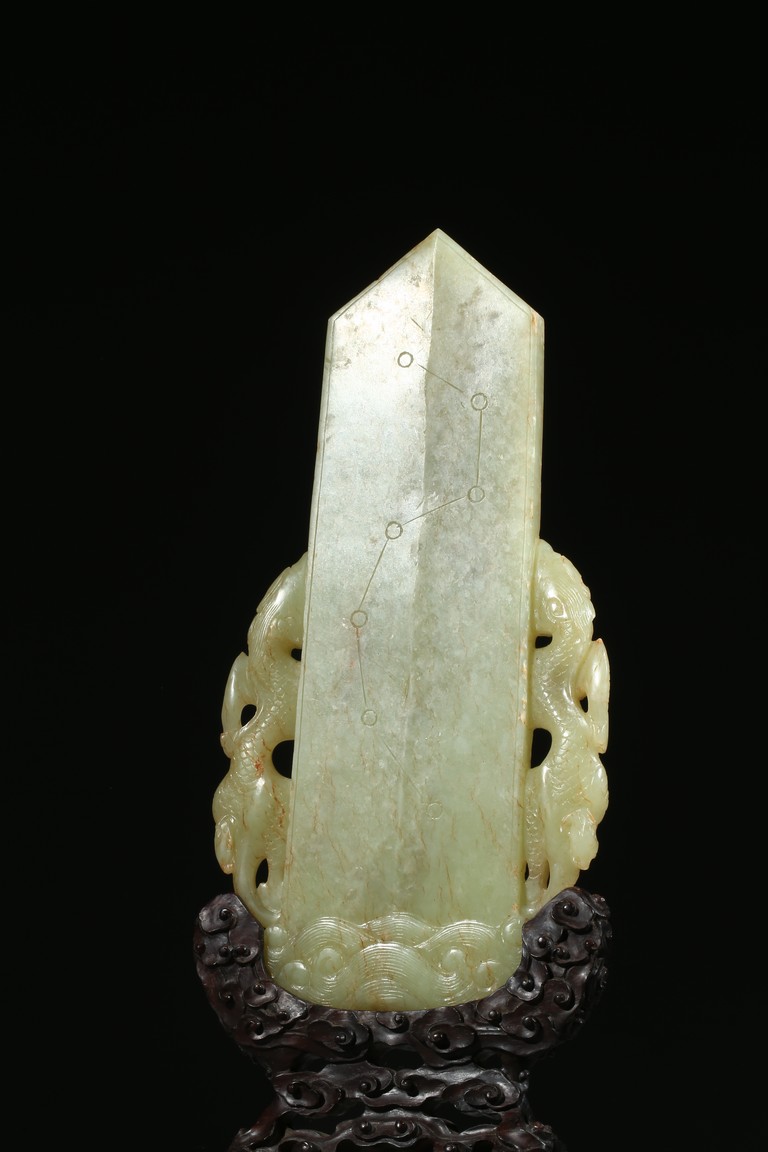 Carved in the form of gui scepter flanked by two ferocious dragons emerging from turbulent waves chasing a flaming pearl on the top, the reverse inscribed to depict the big dipper constellation, all supported on a hardwood stand. Qing Dynasty Qianlong period.