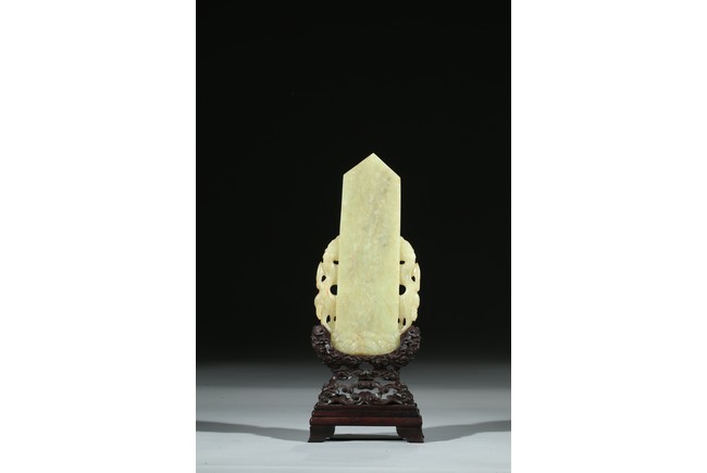 明代《古玉器》提到:"玉以甘黃為上,羊脂次之。以黃為中色,且不易得,以白為偏色,時以有之故耳"。圭為禮器,在傳統的用玉體系中,禮器用玉佔有相當重要的地位。圭亦作珪,古代祭祀、朝會用玉器,古為瑞信之物。被廣泛用作朝覲禮見標明等級身份的玉。以整料珍貴黃玉雕制而成,用料碩大,玉質溫潤如脂。正中的尖圭,呈長方條狀,頂部琢為尖鋭三角之型,圭體向兩側傾斜並凸出中間的脊線。正面上端浮雕寶珠,左右浮雕相對雙龍,形神威嚴,底部淺浮雕海水江崖紋飾,背部陰刻北斗七星紋飾。此件黃玉圭璧即為乾隆時期宮廷仿古器之典範,用料奢貴,造型古樸。配有靈芝卷雲紋紫檀座,工藝精致。