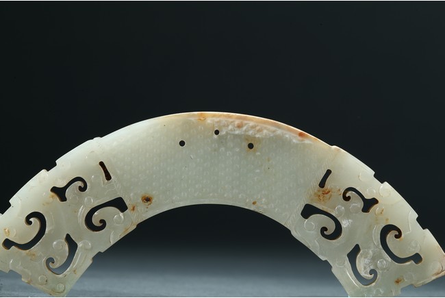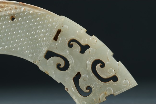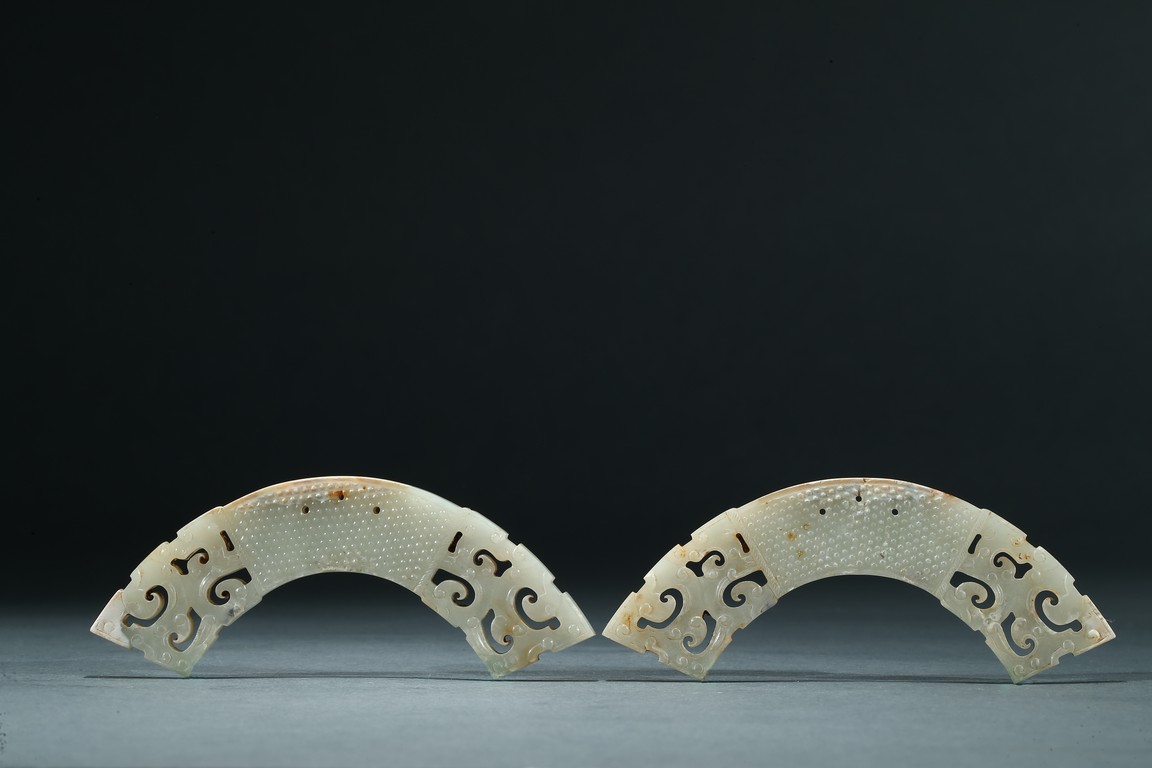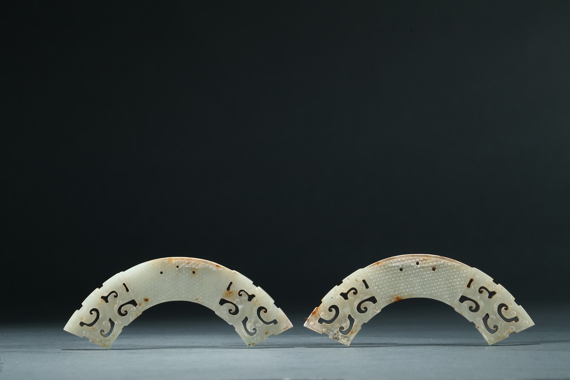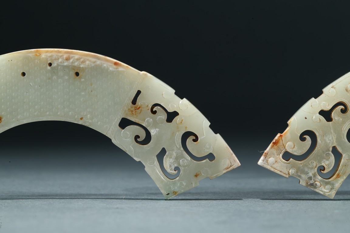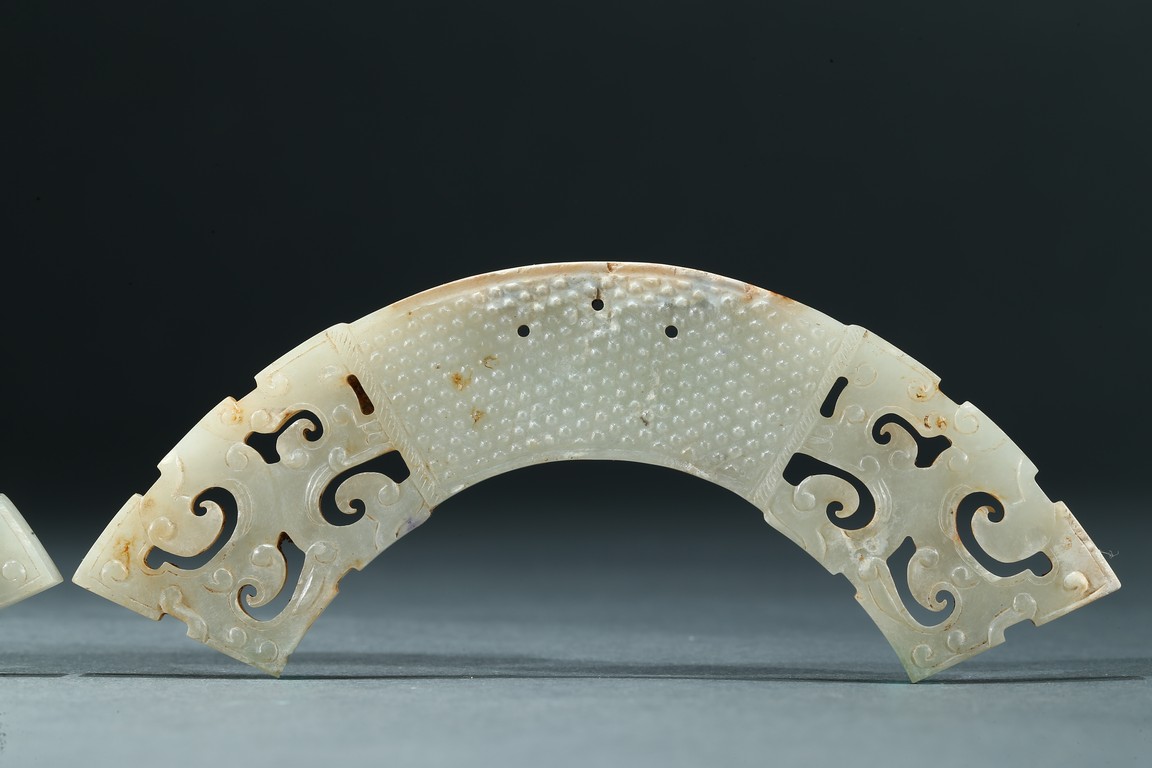 Of arched form, each center finely carved with small commas to front and reverse, with three small circular opening for suspension, terminating with openwork stylized scrolled pattern, the stone is of pale white tone with minor russet inclusions here and there. Warring State period.