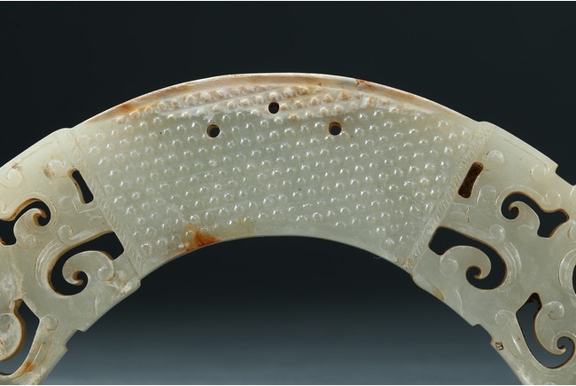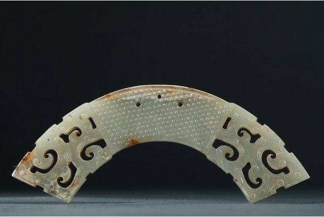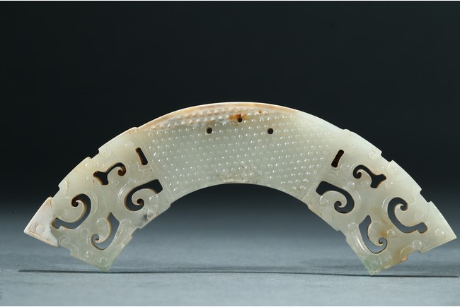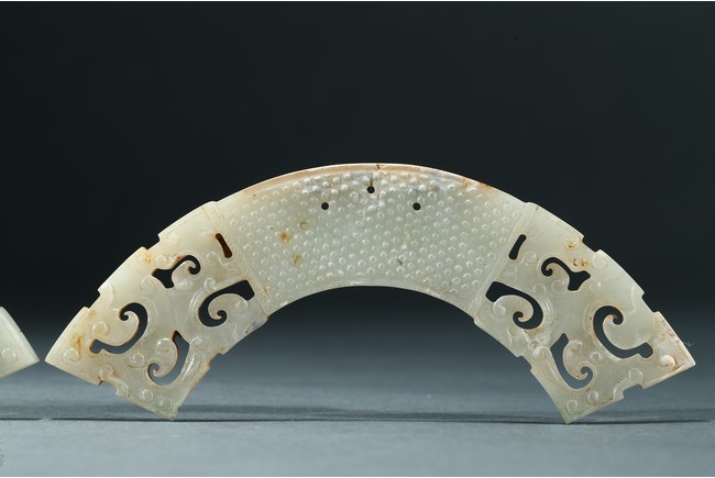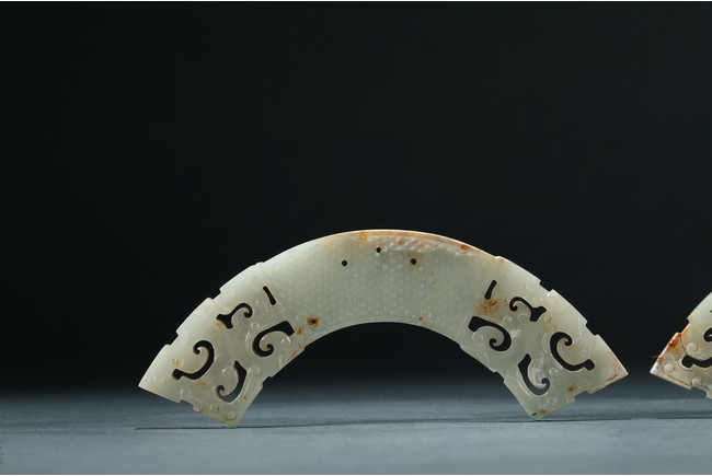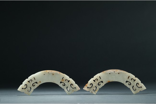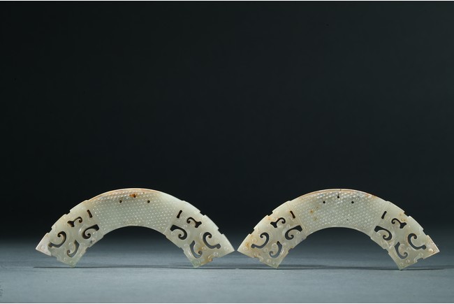 玉璜為白玉質,扇面形,兩頭採用鏤雕工藝,中心飾乳釘紋,排列疏密有序,玉璜上部有三孔以作懸掛。整體形制古樸凝重,雅觀大方,成對罕見。