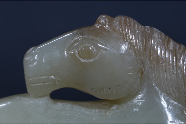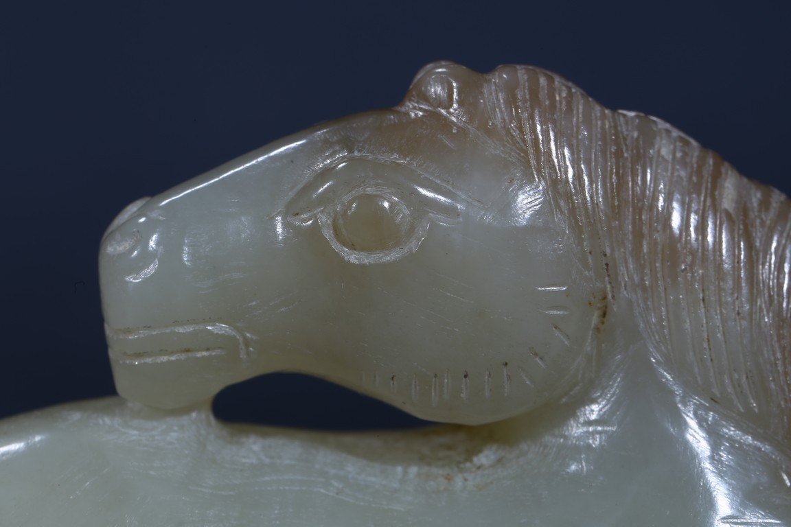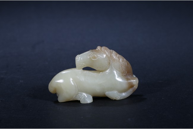 Carved as a recumbent horse with head turned back, mane detailed with incised lines. Ming Dynasty period.