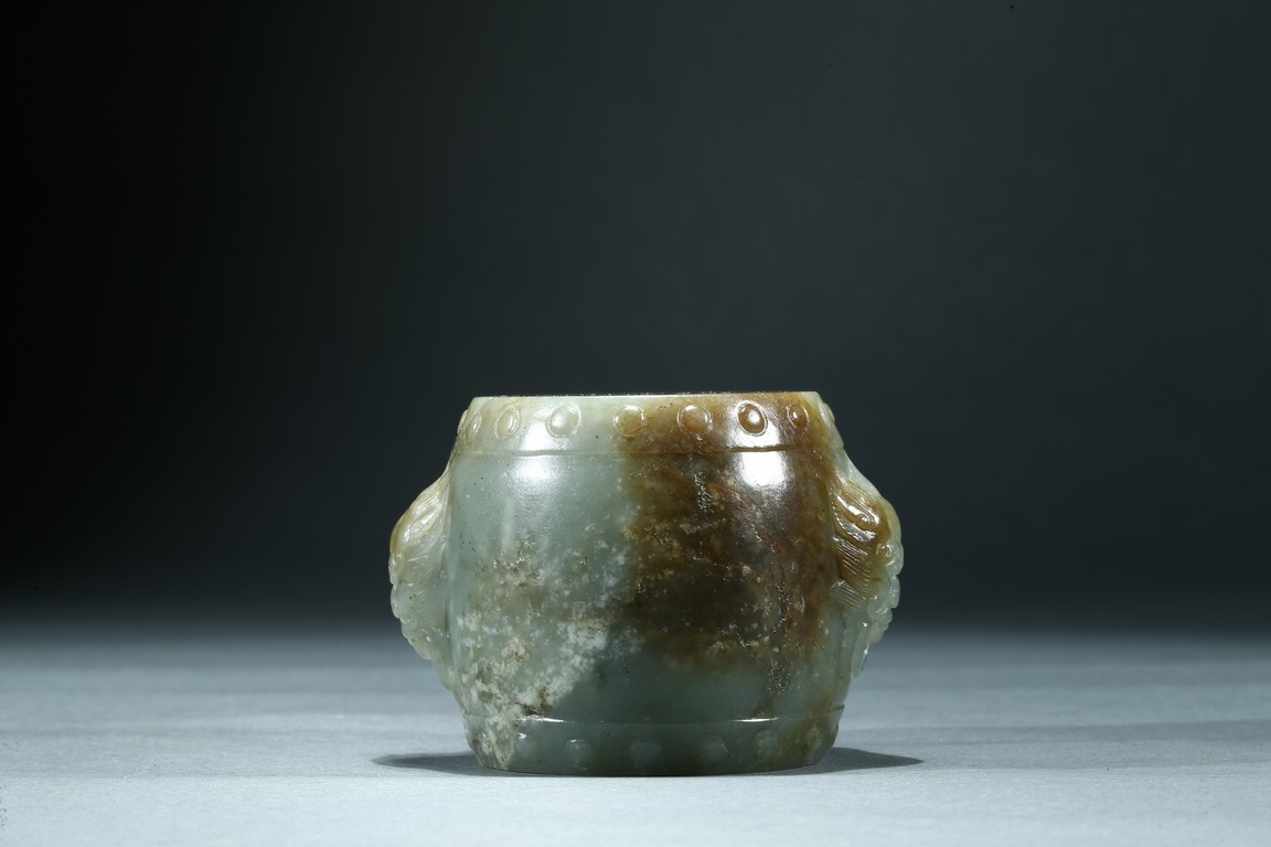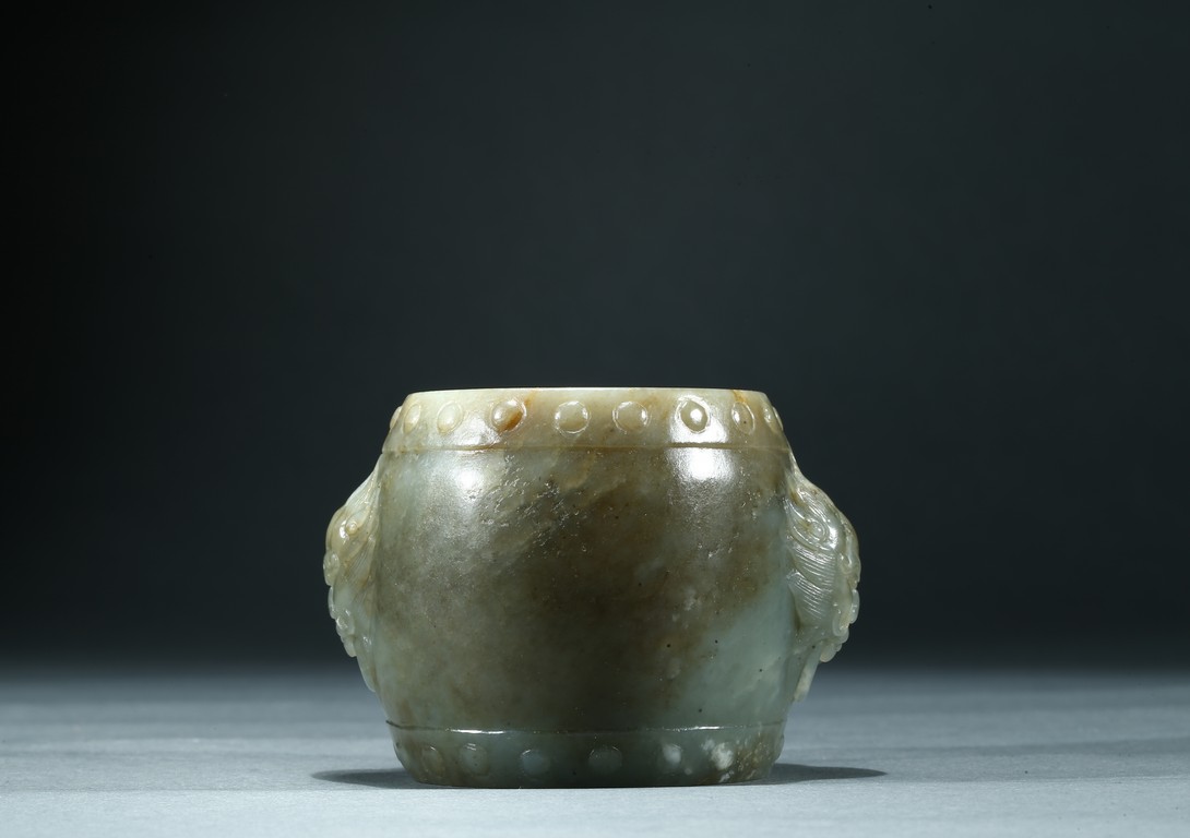 Of drum form with swelling sides rising to a flat top, both sides carved with mythical beast mask with mouth agape, all between two double-bands of studded bosses. Qing Dynasty period.
