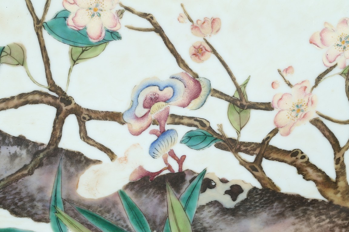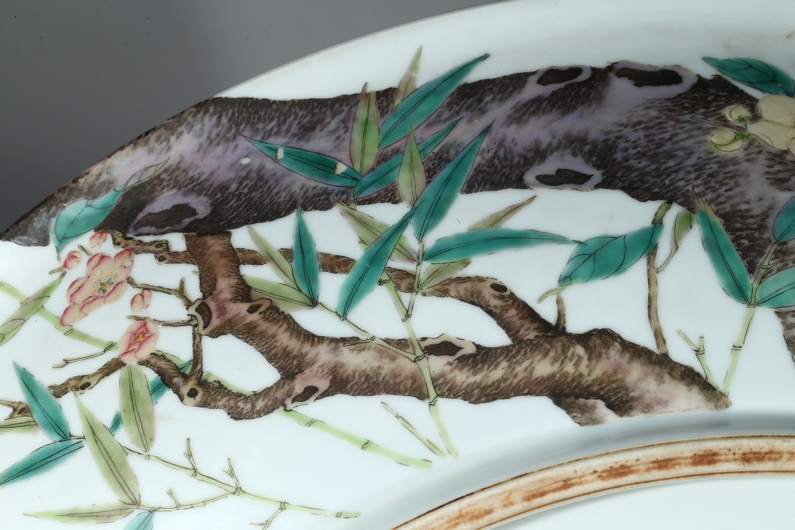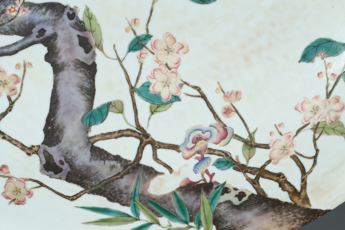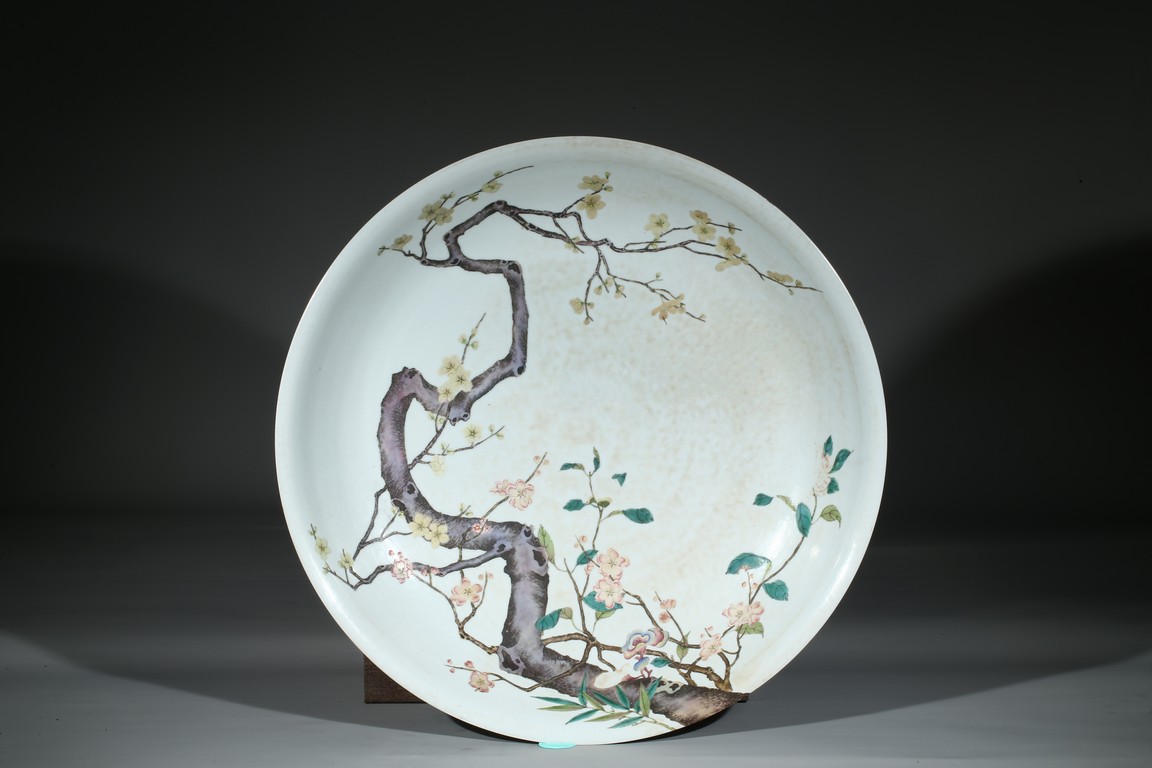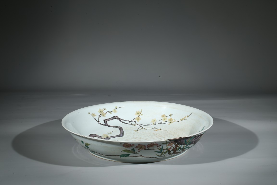 The rounded sides rising from a short tapering foot to an everted rim, finely enamelled to the exterior with two gnarled branches of magnolia and prunus, extending around the curve of the dish and over the rim into the interior, entwined with a smaller flowering rose and lingzhi sprigs, the base with six-character Yongzheng mark in underglaze-blue. Qing Dynasty period.