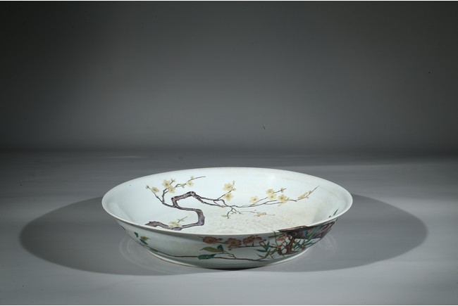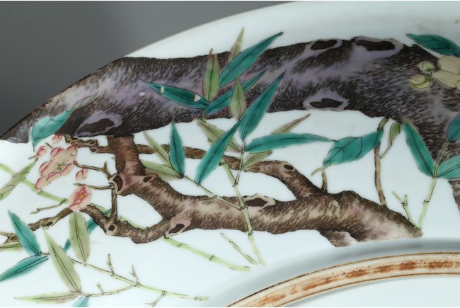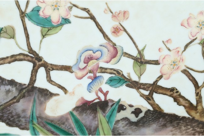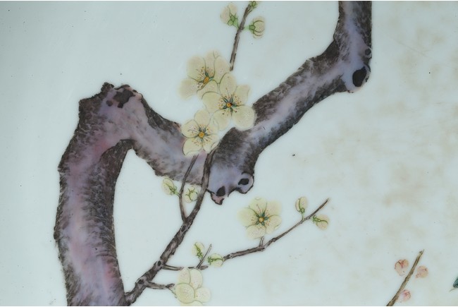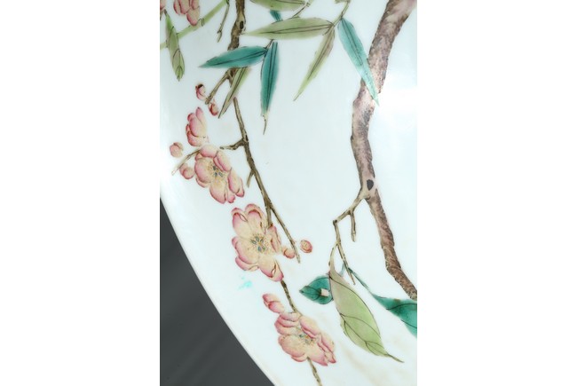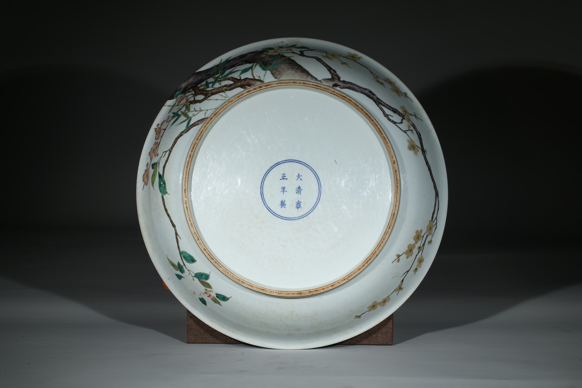 Provenance: private New York collection 粉彩器在雍正時期已成為彩瓷的主流產品,其造型多樣,裝飾紋樣豐富,繪製精湛。裝飾圖案常見山水、人物、花草、蟲蝶紋等。施彩柔麗,構圖疏雅簡潔,紋飾纖柔,繪製工細,畫風深受惲南田沒骨法的影響,達到了“花有露珠,蝶有茸毛”的程度。“過枝花”是一種瓷器特殊構圖方式,器內外壁或器身與器蓋的紋飾相連,渾然一體,似花枝越過牆頭,故稱為“過牆花”,裝飾技法新穎別緻,有獨特藝術風韻。此盤體型碩大,撇口,淺腹,胎體輕薄,釉色瑩潤。 來源: 紐約私人藏家收藏