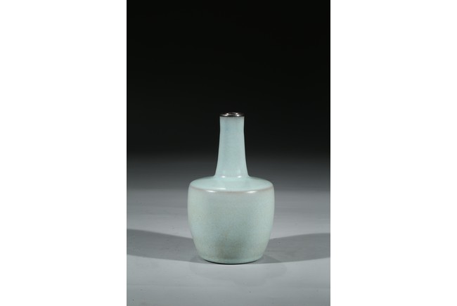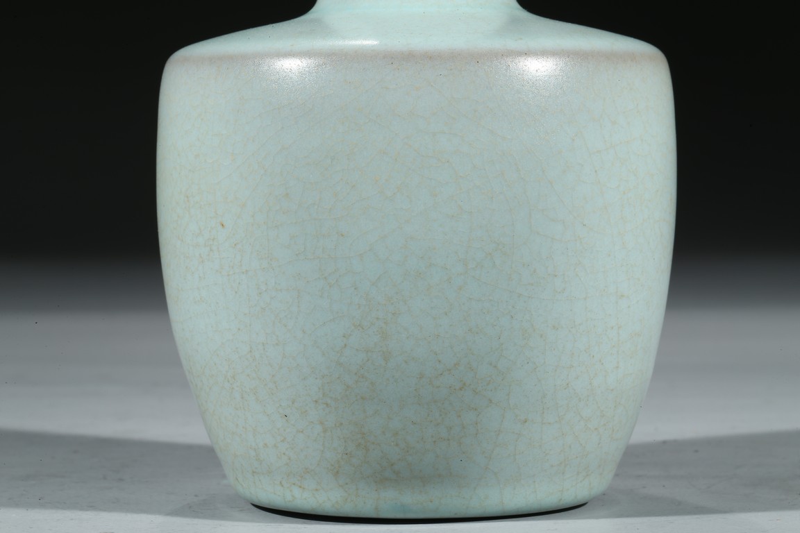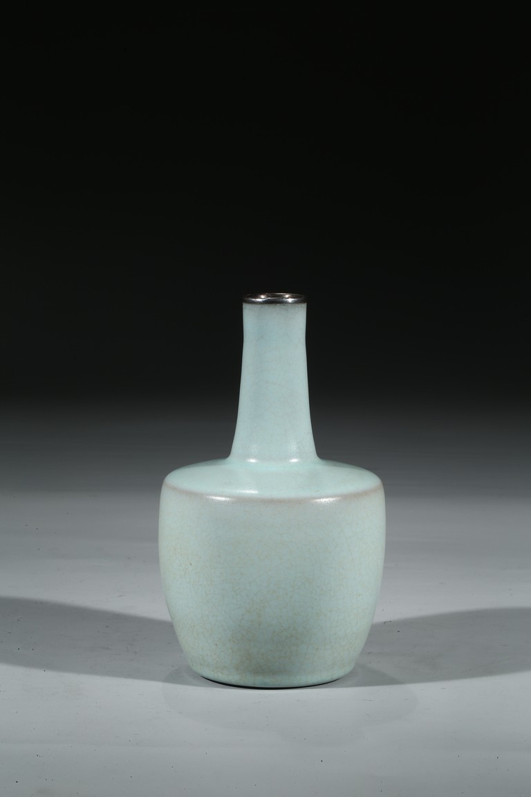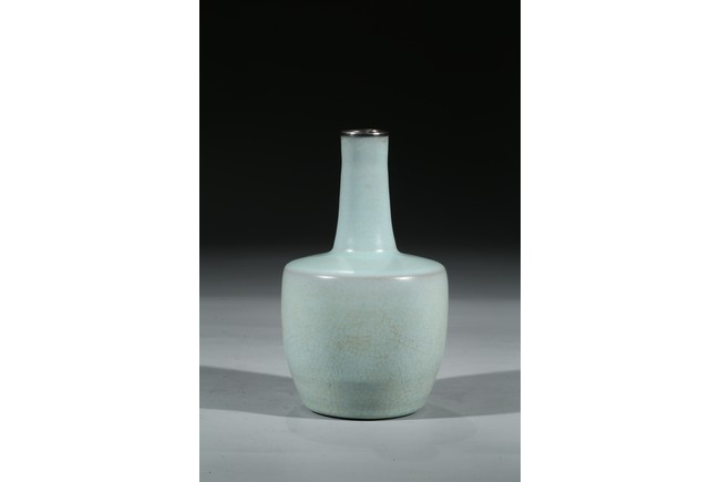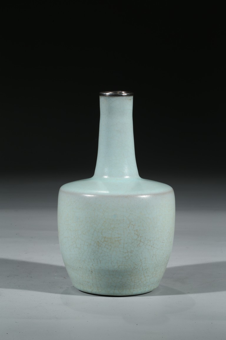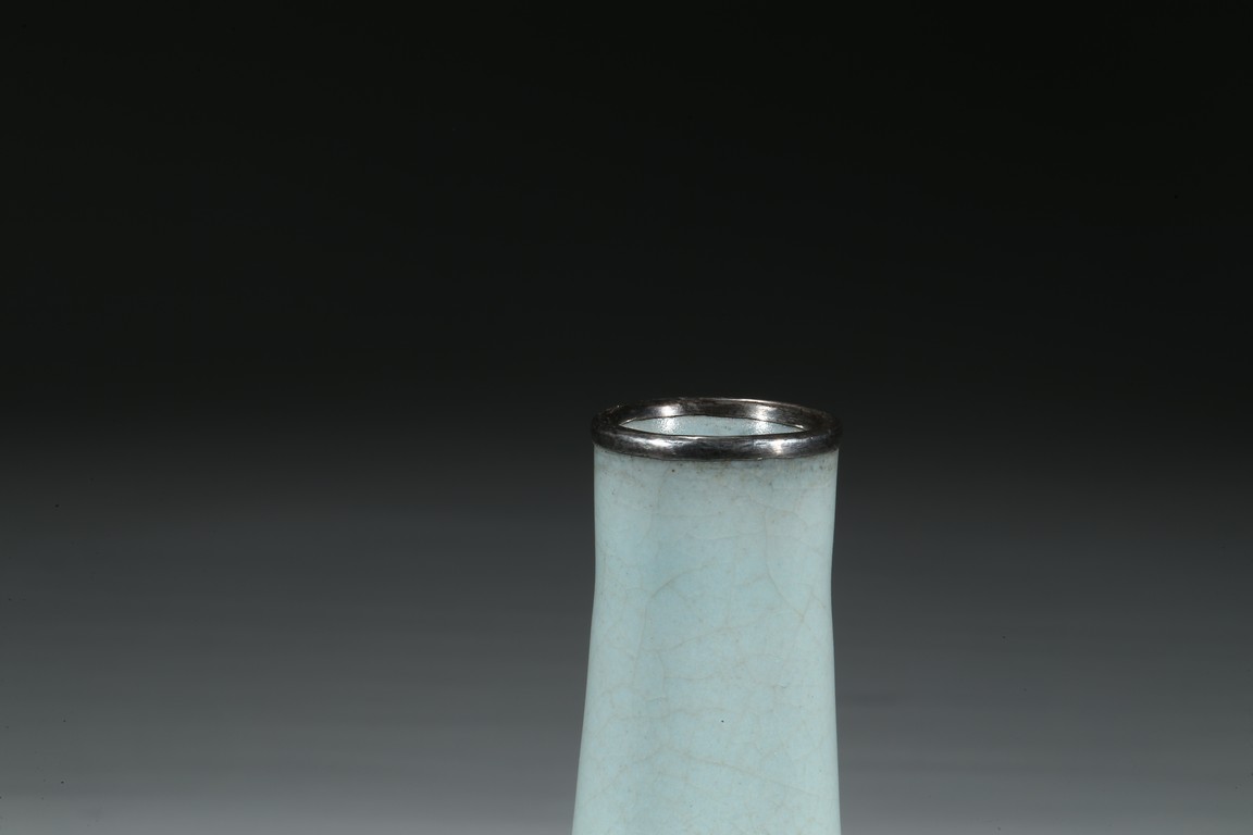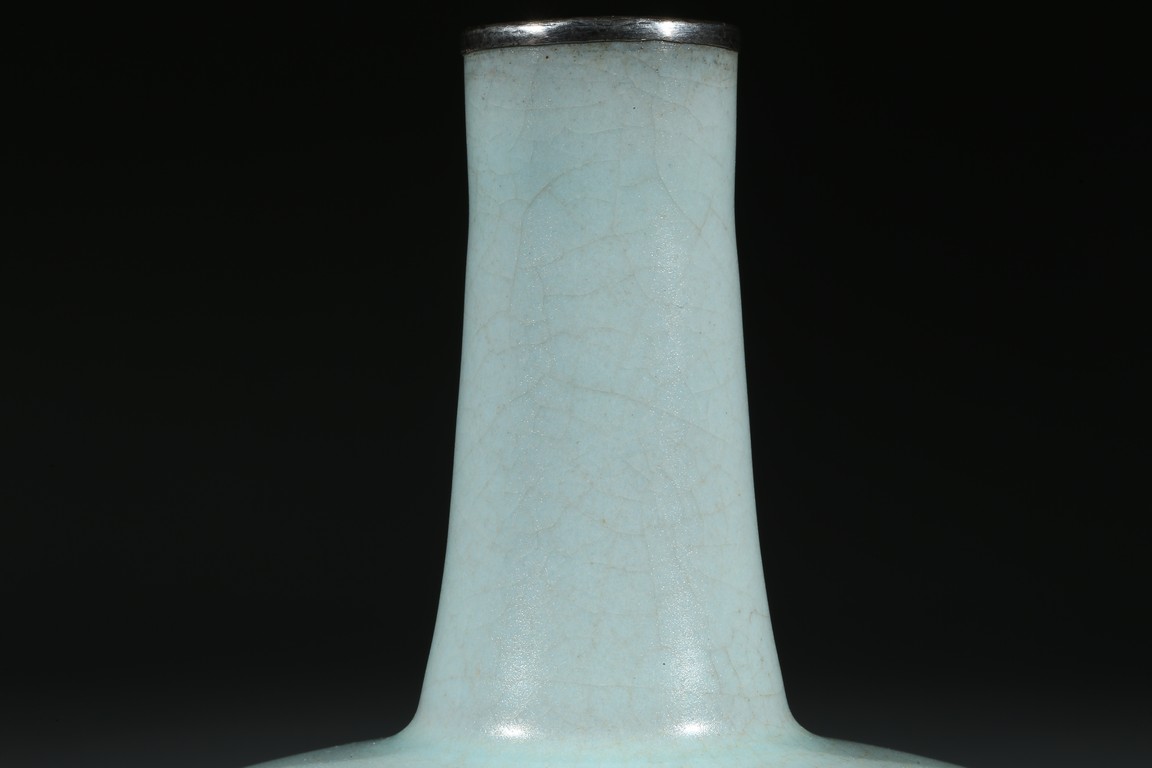 The vase is finely potted with a mallet-shaped body, with sides tapering slightly from the canted shoulder towards the foot. The tall neck is surmounted by a slightly flared mouth with silver wrapped rim. The base carved in gilt with inscriptions and two seal marks. The vase is covered overall with an attractive blueish green glaze suffused with network of light ice crackles. Song/Yuan Dynasty period.