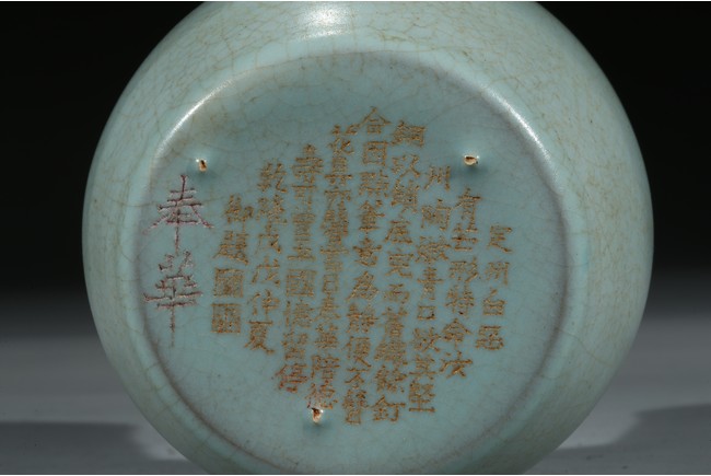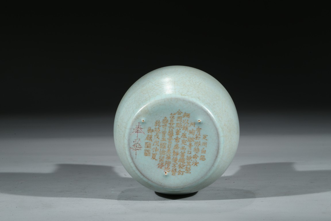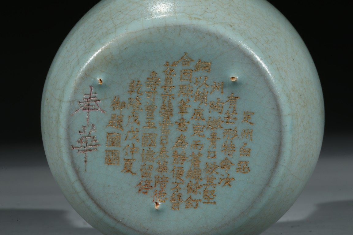 Provenance: Property from a private collection, San Francisco 此瓶採用支釘支燒法,瓷器底部留下細小的支釘痕跡。器、物本身製作上胎體較薄,胎泥極細密,呈香灰色,製作規整,造型莊重大方。口部包銀,細長頸,折肩,微弧形腹,底足刻有“乾隆御題詩”,“奉華”二字。 來源:三藩市私人藏家收藏