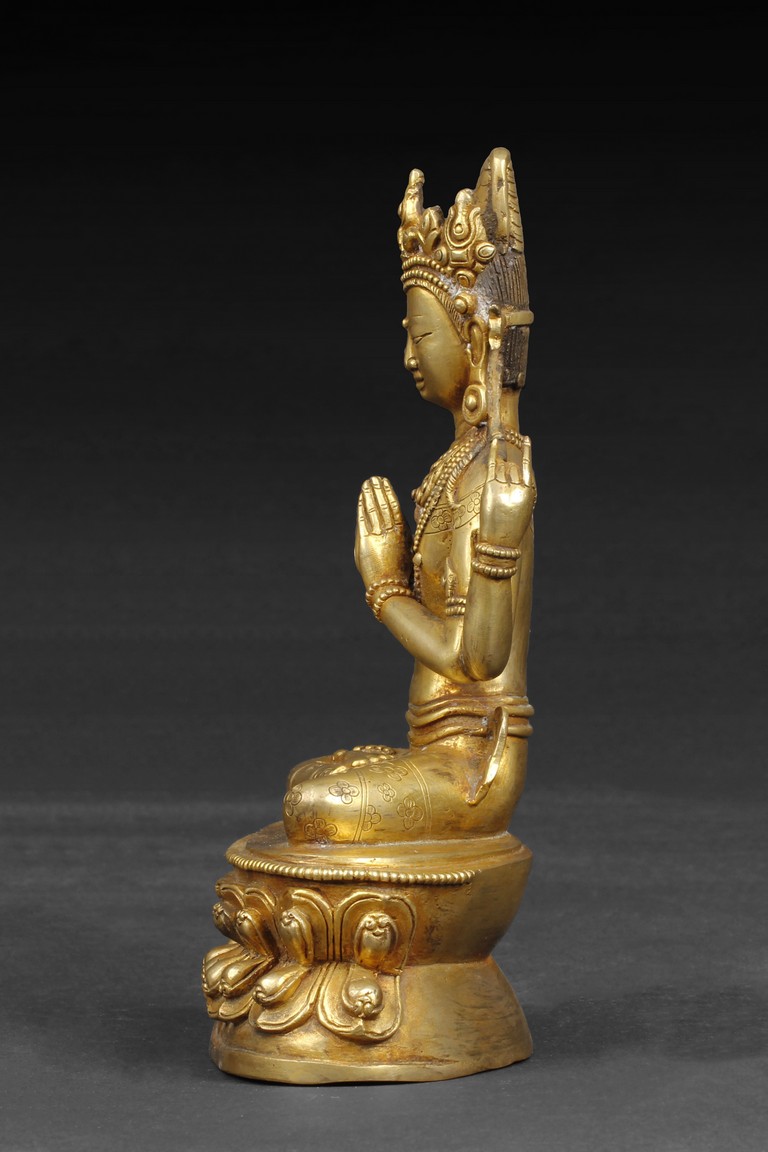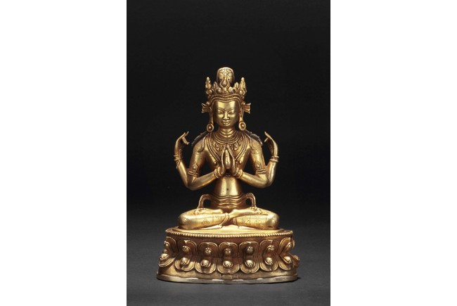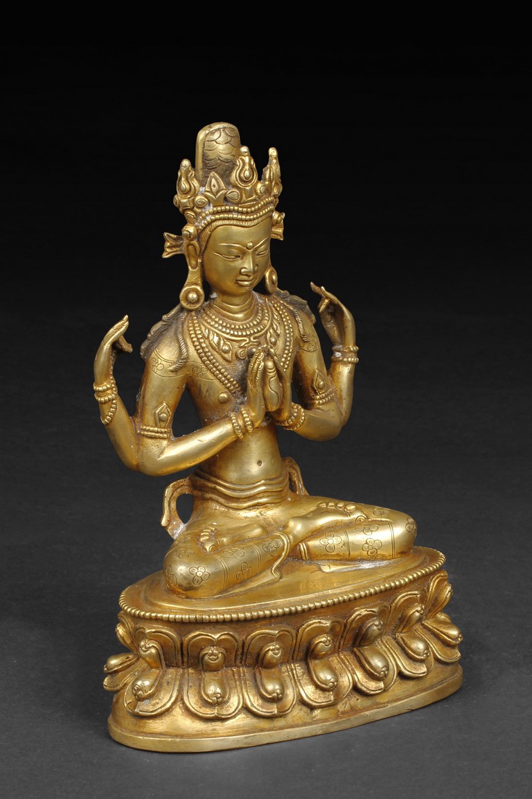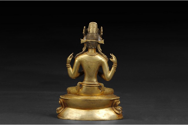 Seated in dhyanasana on a double lotus throne, two hands clasped together with a ritual ornament in-between, other two hands in apana mudra, wearing many ornated bead strands around neck and arm, the Avalokitesvara with a stern expression. Qing Dynasty period.
