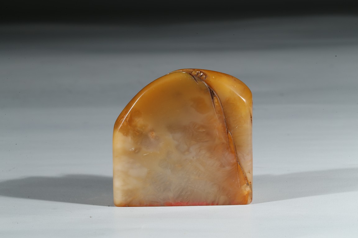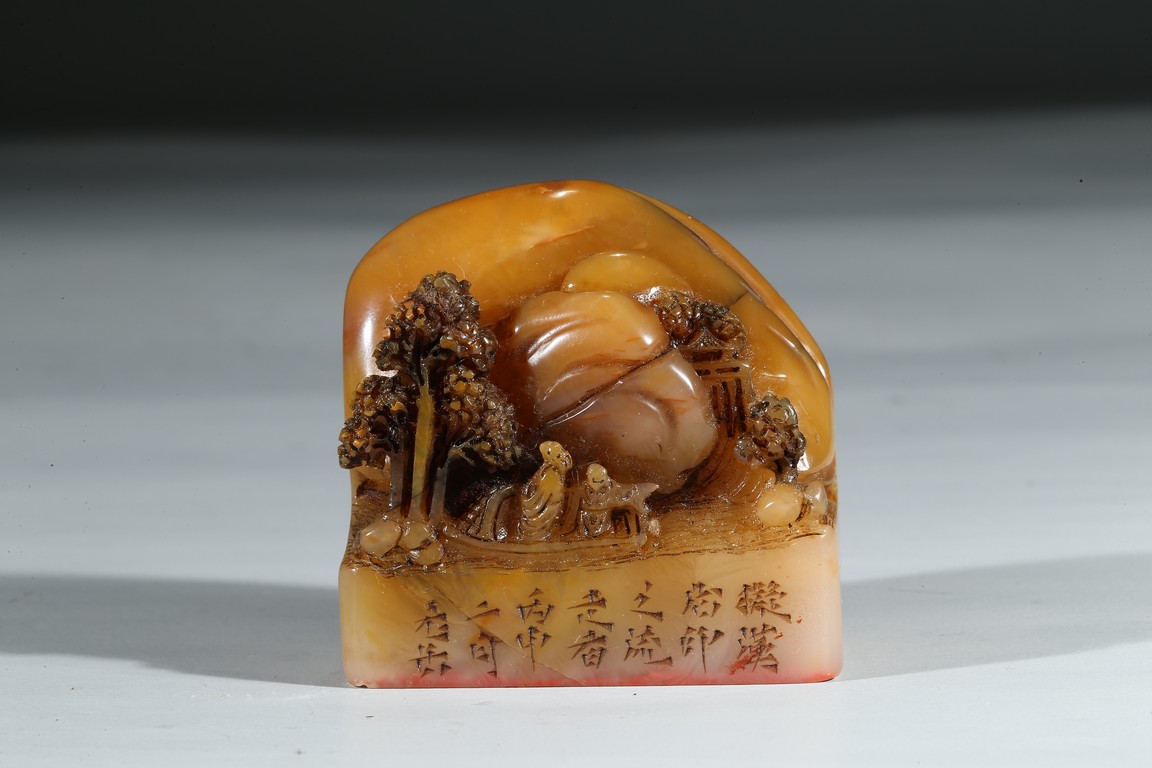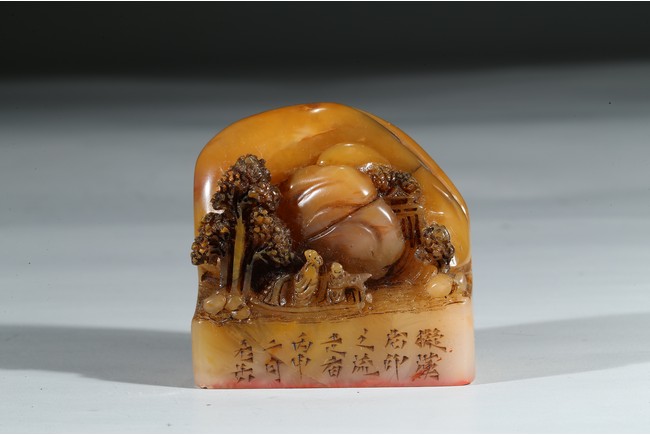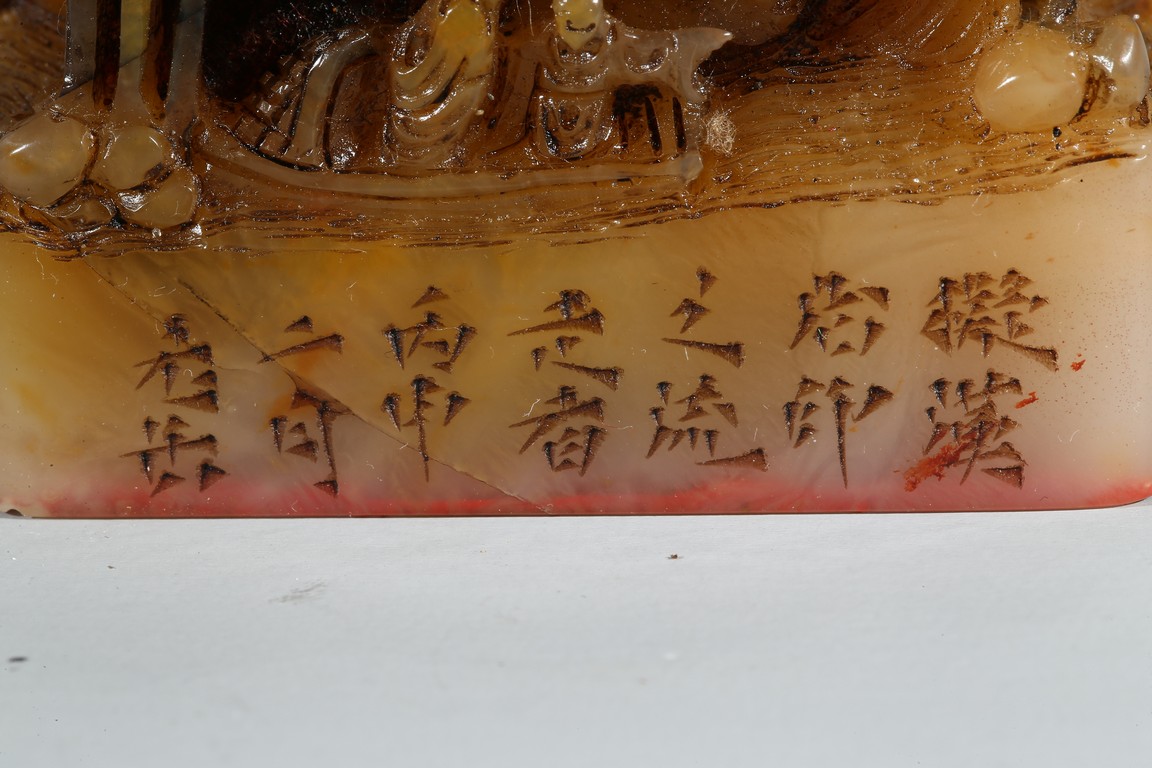 Carved to the top with high relief landscape, the side with inscription, base with six character mark.