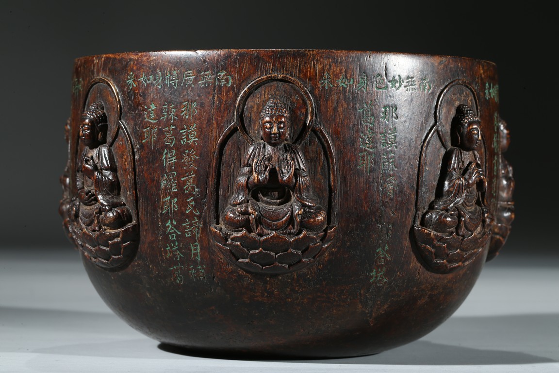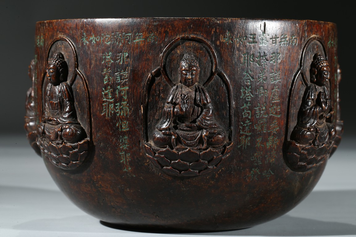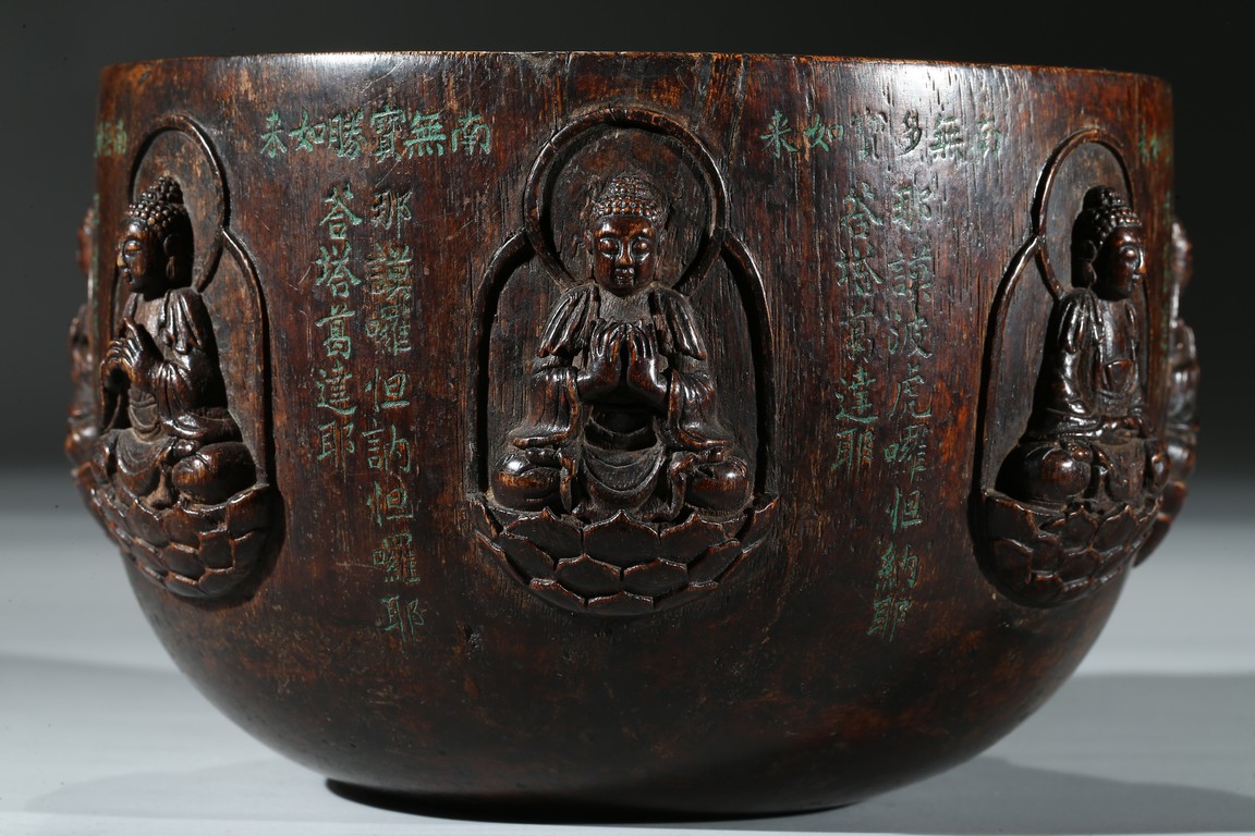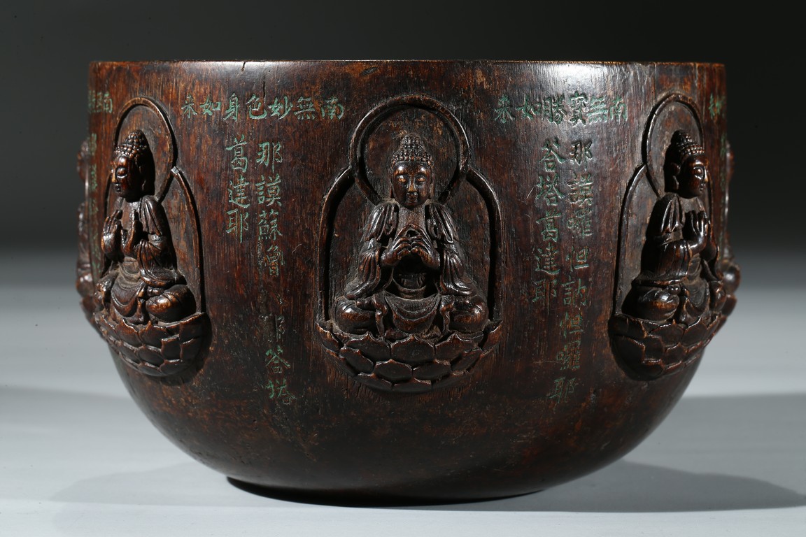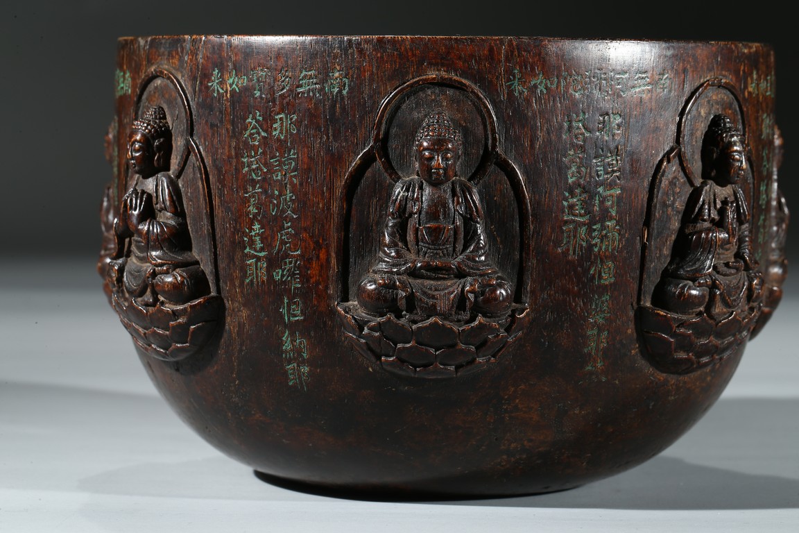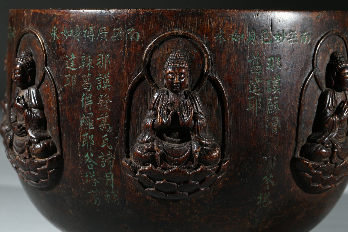 Rising from concave base to straight rim, the exterior body finely carved in high relief with seven seated buddha figures, each rested upon lotus throne and with hands in different mutra, flanked and below buddhist inscriptions in green pigment. The wood is of characteristic aroma of aloeswood. Qing Dynasty Qianlong period.