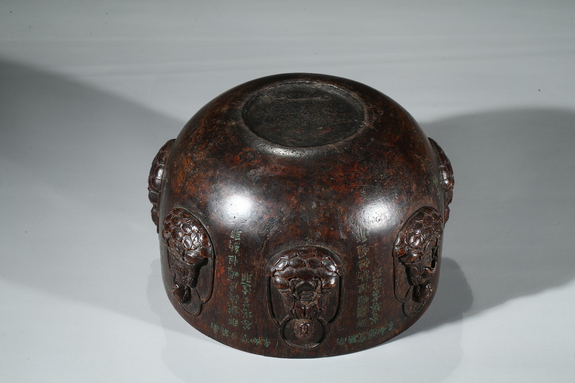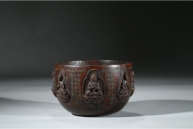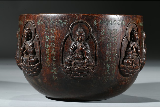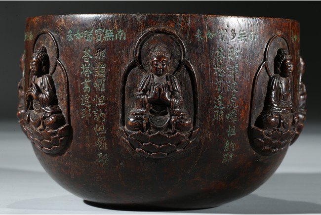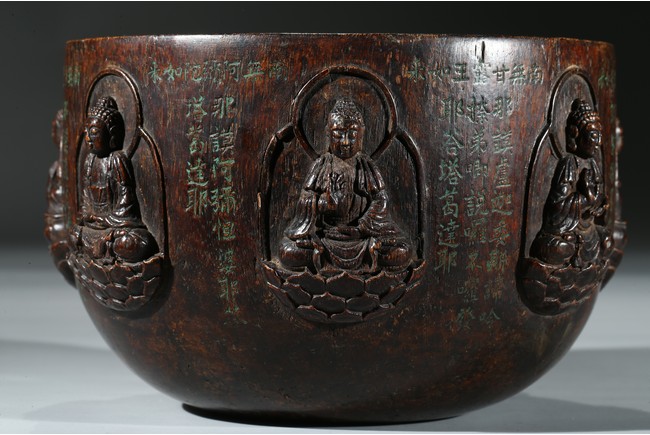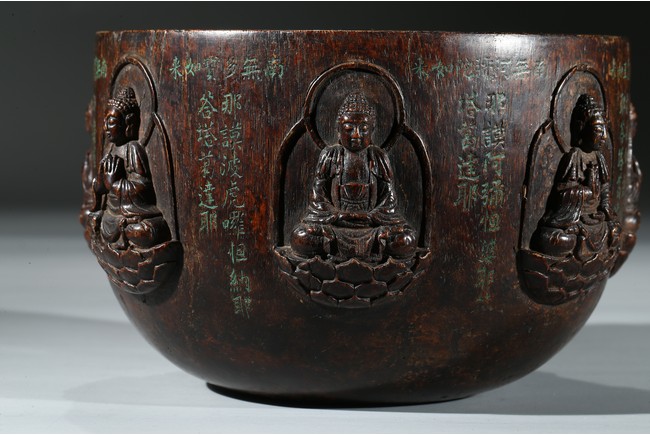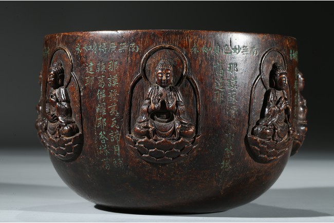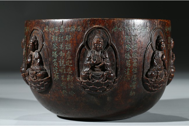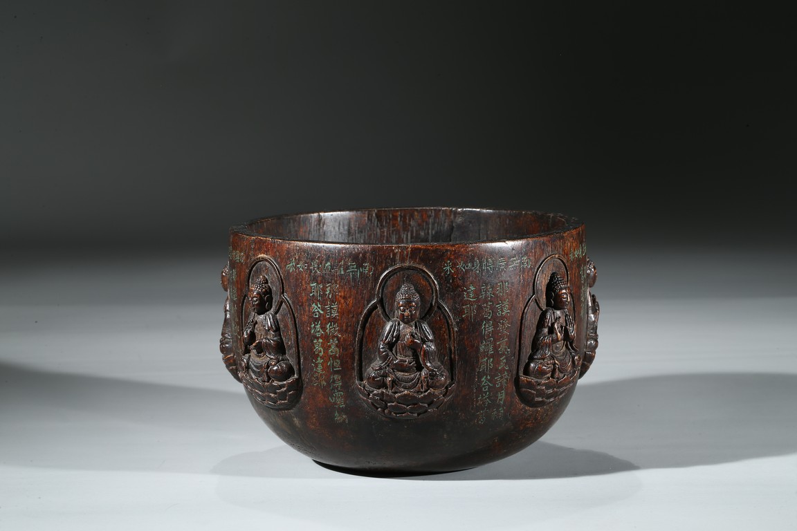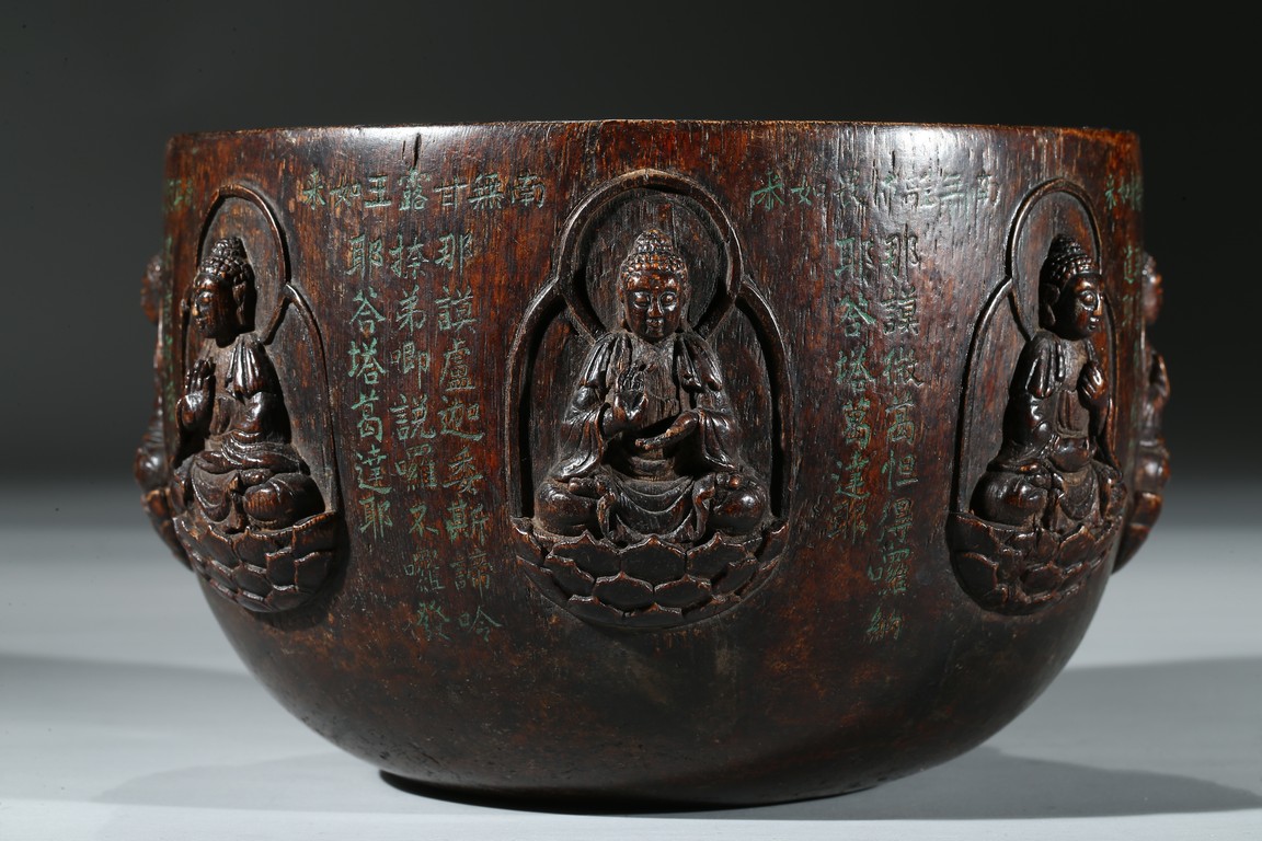 Rising from concave base to straight rim, the exterior body finely carved in high relief with seven seated buddha figures, each rested upon lotus throne and with hands in different mutra, flanked and below buddhist inscriptions in green pigment. The wood is of characteristic aroma of aloeswood. Qing Dynasty Qianlong period.