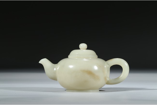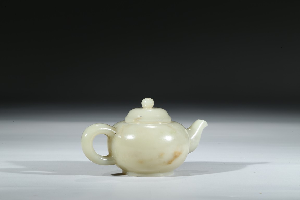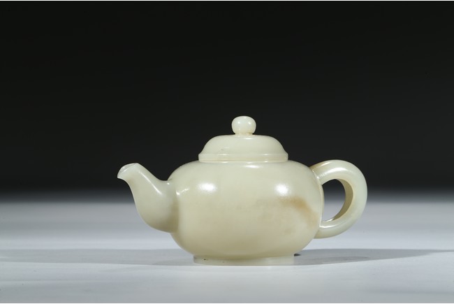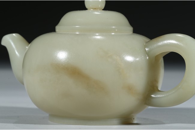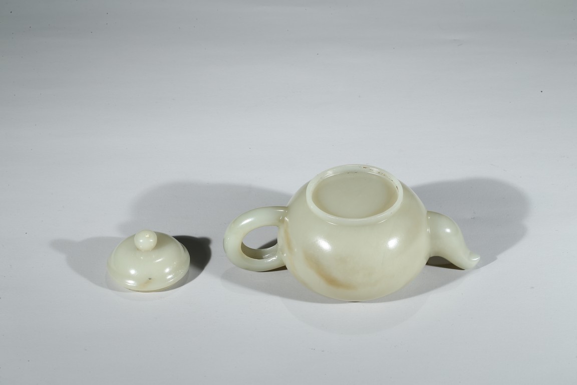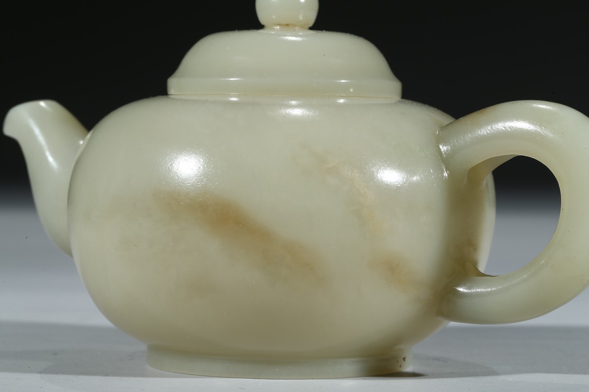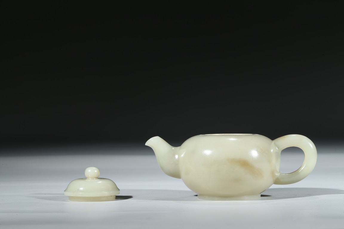 Worked from a lustrous and even white stone with a compressed globular body resting on a short foot, the spout issuing from one side across arched handle, the domed cover topped with spherical knop. Qing Dynasty period.