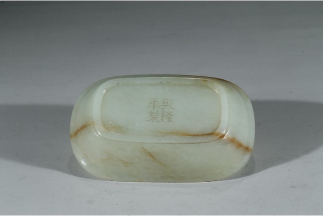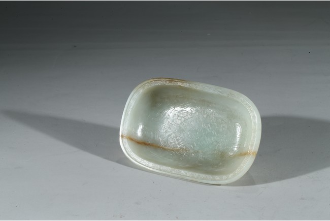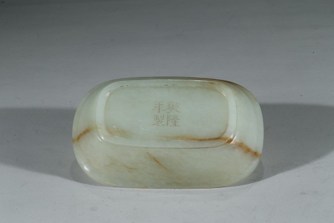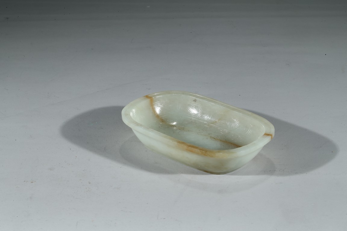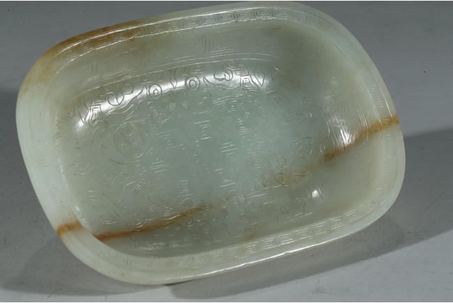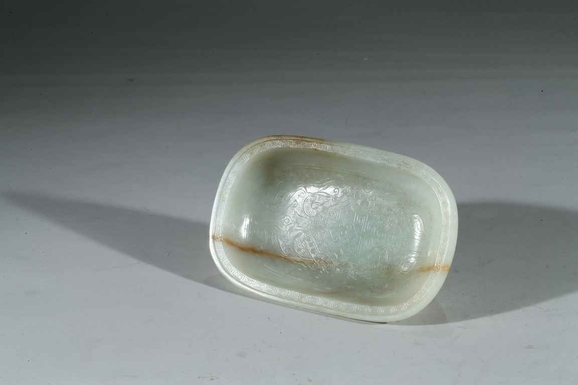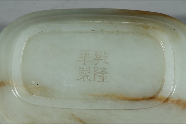 此洗敞口,沿口外伸,腰身下收。沿口飾回紋壹周,洗心內飾如意紋,底部“乾隆年制”款識。整器用料精美,局部帶褐紅色沁色,包漿醇熟,頗為難得。
