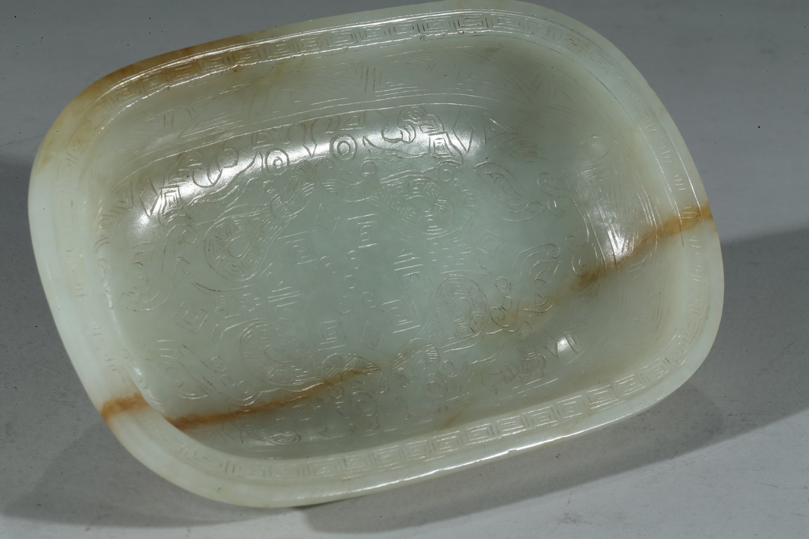 The interior carved with archaistic scrolled pattern, base with four character Qianlong mark. Qing Dynasty period.