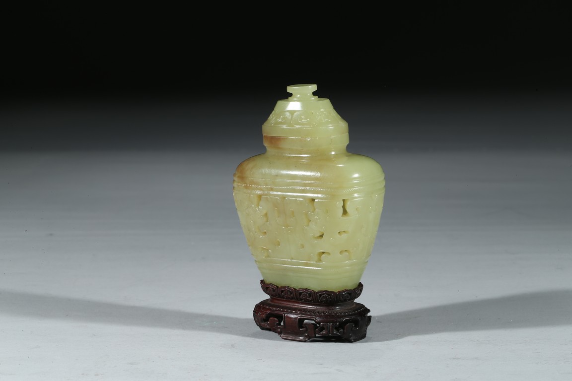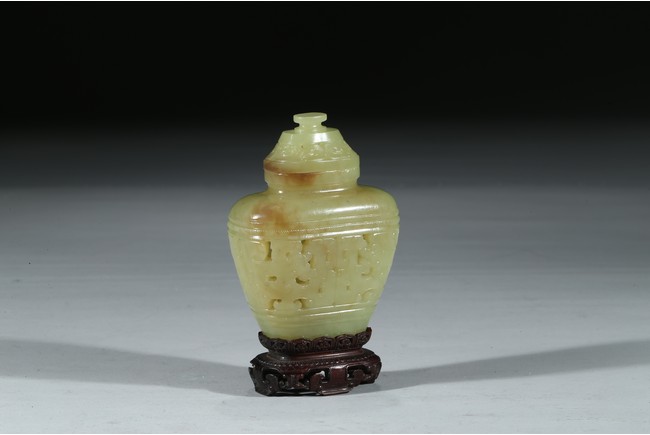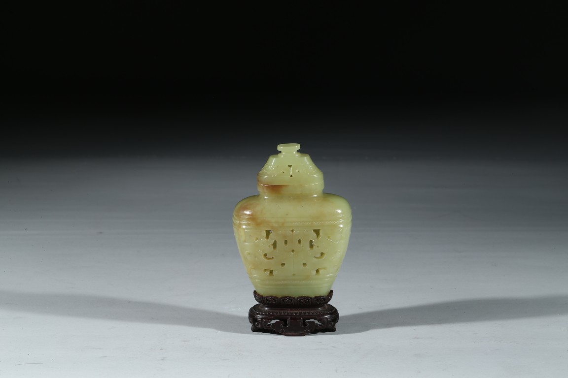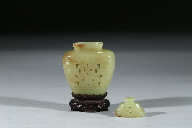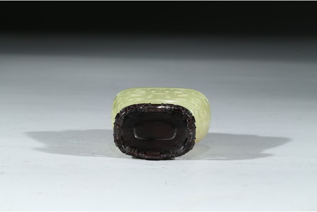 本品造型別緻可愛,玉瓶選料精良,玉質溫潤細膩,瑩澤光亮,局部有褐黃色沁色。呈扁形,分器、蓋兩個部分,子母口緊密相合,器身鏤雕夔龍紋,對稱式構圖,古意盎然,頗為特殊,為藏家賞玩佳器。配紫檀座。