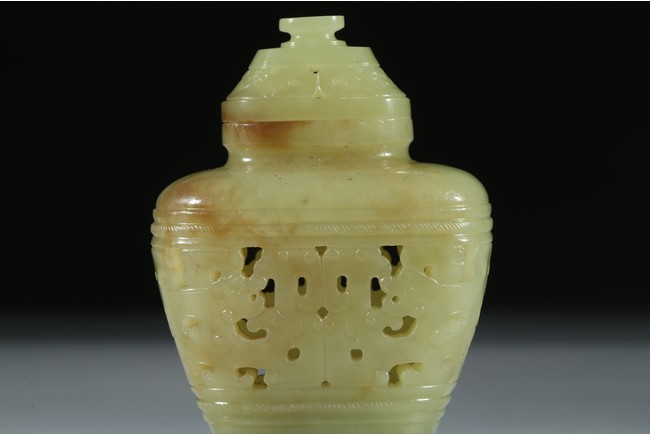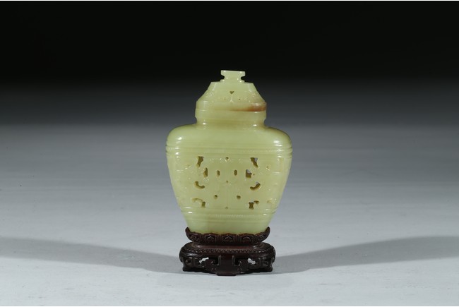 The vase carved and pierced to depict two confronting stylized kui dragon set between raised lines, fitted with a similarly reticulated cover with circular finial, all supported on hardwood stand. Qing Dynasty period.