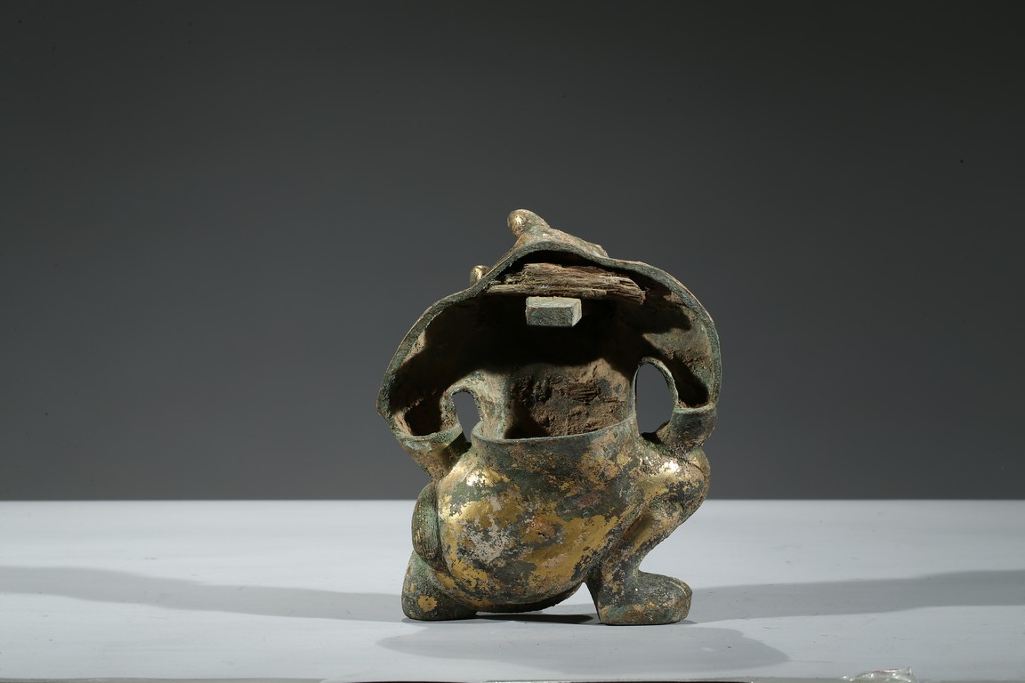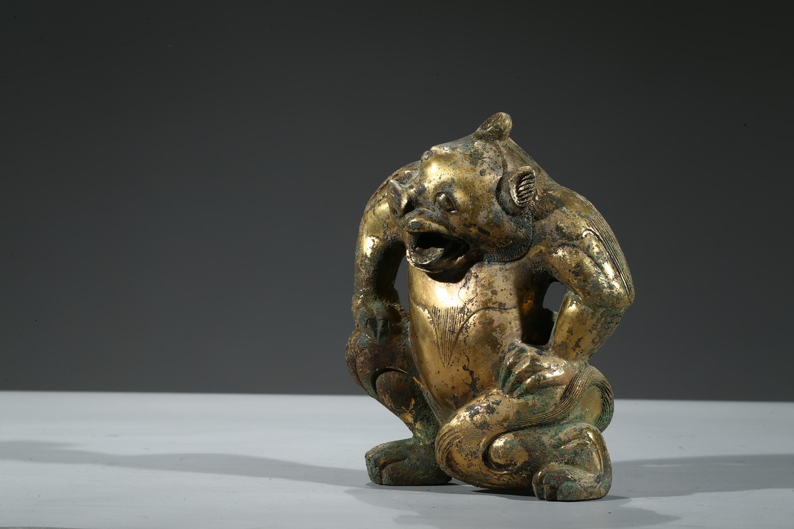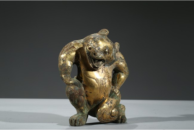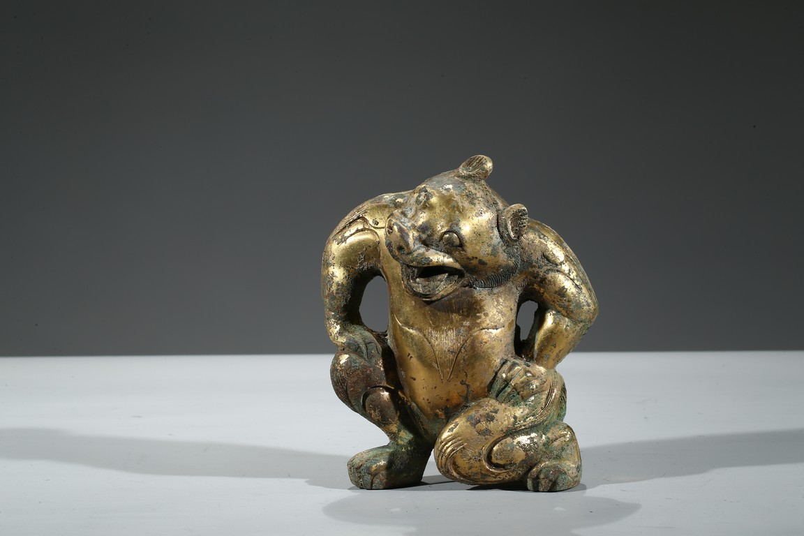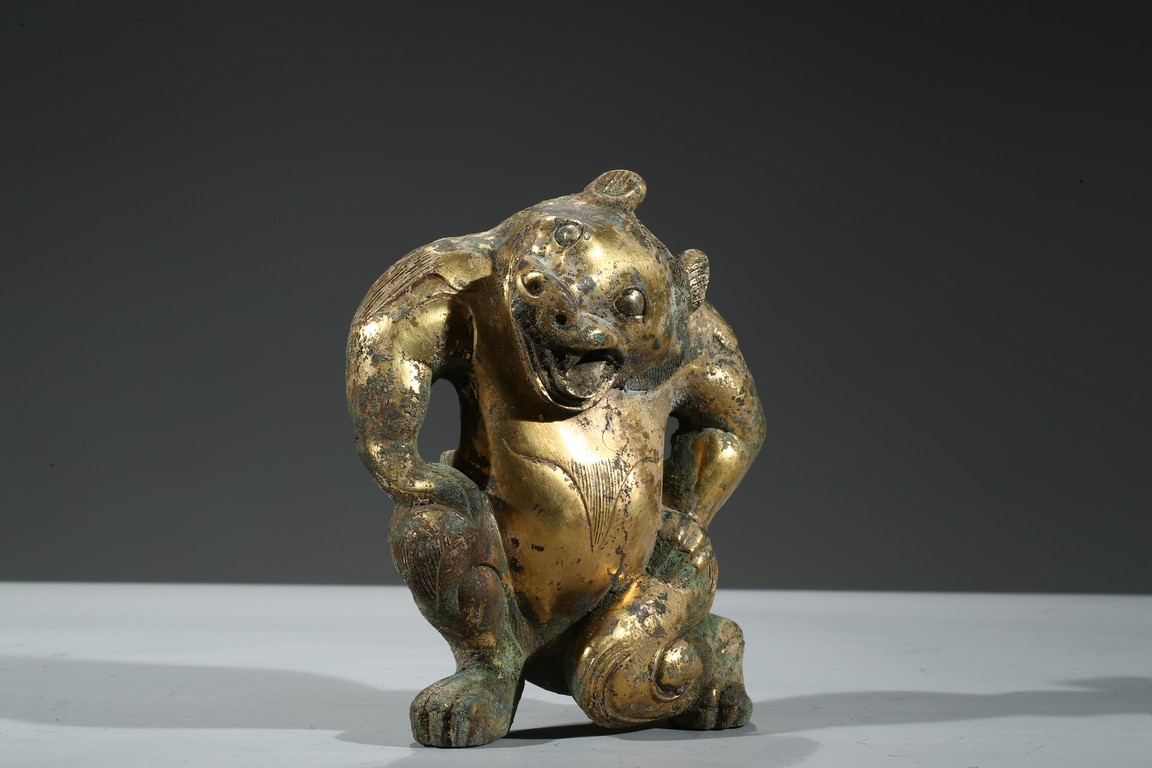 Provenance: Property from a Nevada private collection 銅鎏金熊擺件以銅為材,鎏金保存尚好,金彩奕奕。熊全身線條流暢優美,四肢粗壯,肩背豐隆,作半跪狀,雙手扶胯,怒目圓睜,口大張,齒牙亦可見。此熊神態生動,將熊負重之態表現得淋漓盡致。 來源: 內華達州私人藏家提供