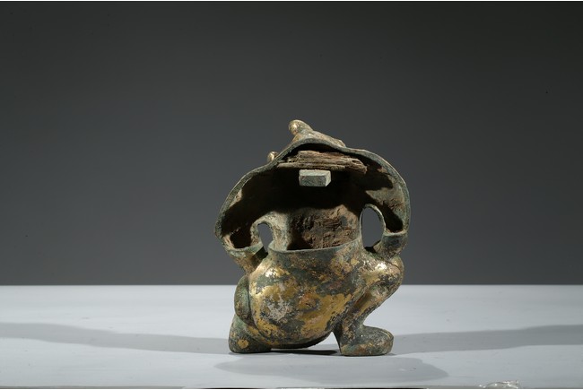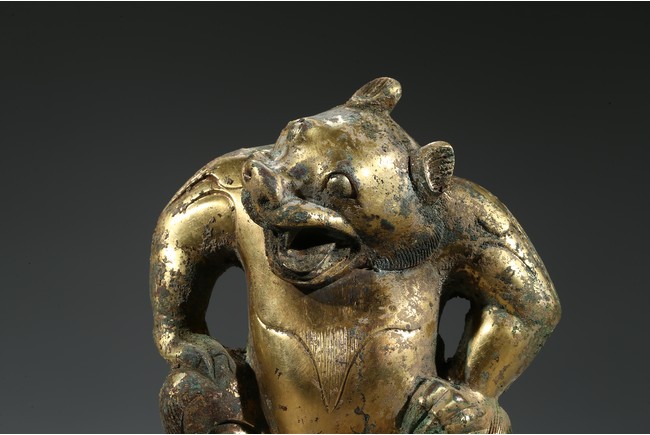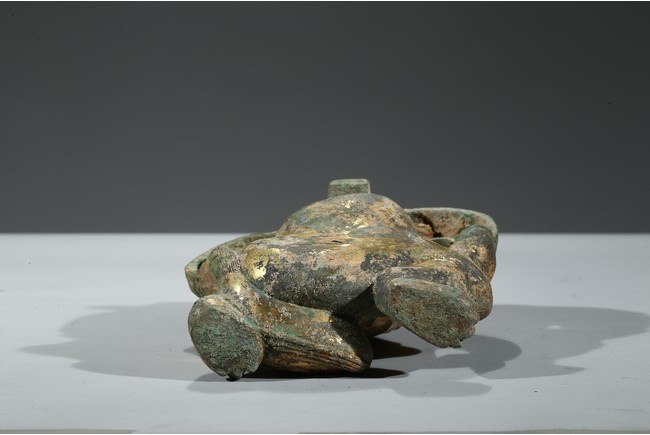 Cast in the form of a bear with mouth agape and both hands resting on the thighs, with green patina and encrustation. Han Dynasty period.