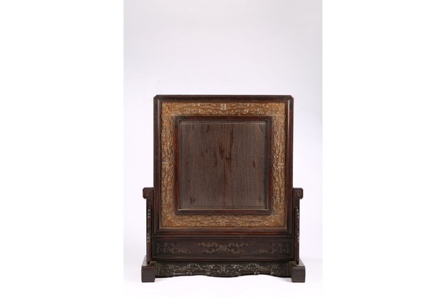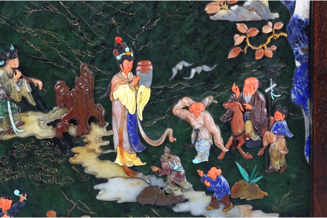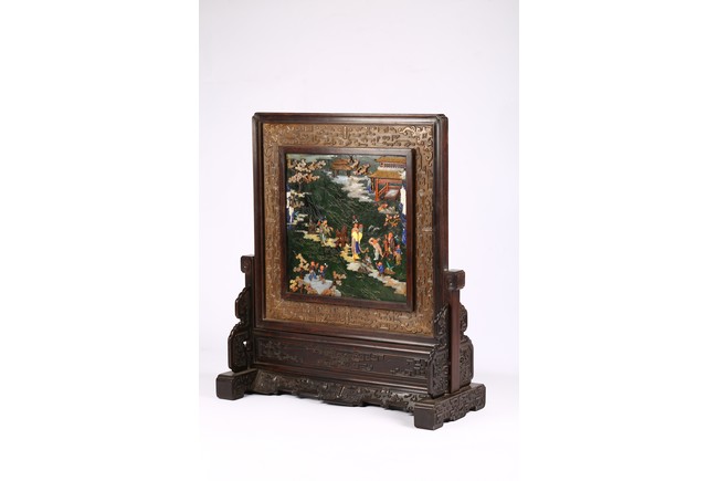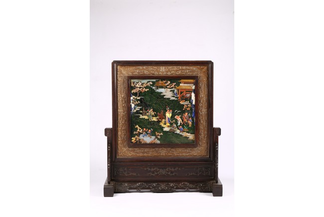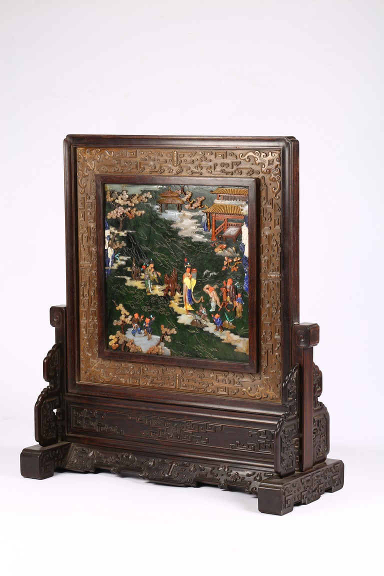 插屏是一種陳設性傢俱,放於廳堂之上,起裝飾作用。屏心以綠松、青金石、珊瑚、硨磲、孔雀石、翡翠構成人物、山石、亭台樓閣、雲蝠。整體生動傳神,氣韻清逸。邊框滿飾勾雲紋,規整細緻。整體雖體積碩大,但工技藝精湛,章法嚴謹,繁而不亂。