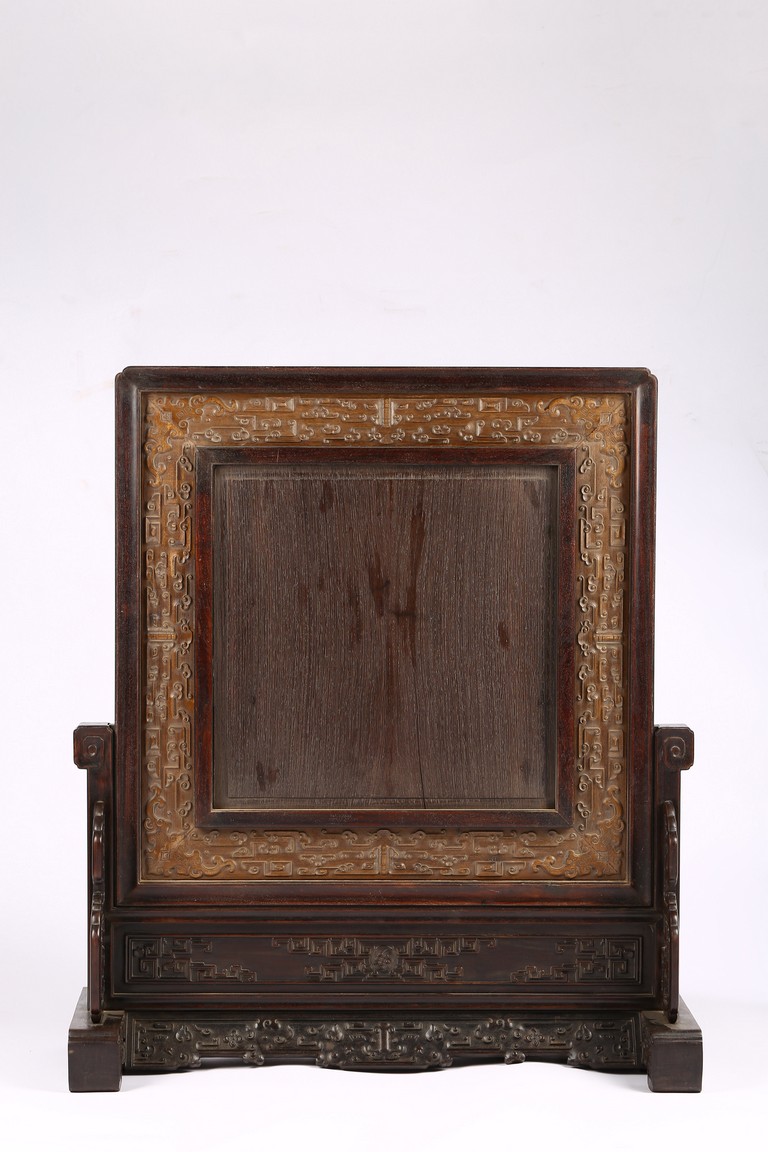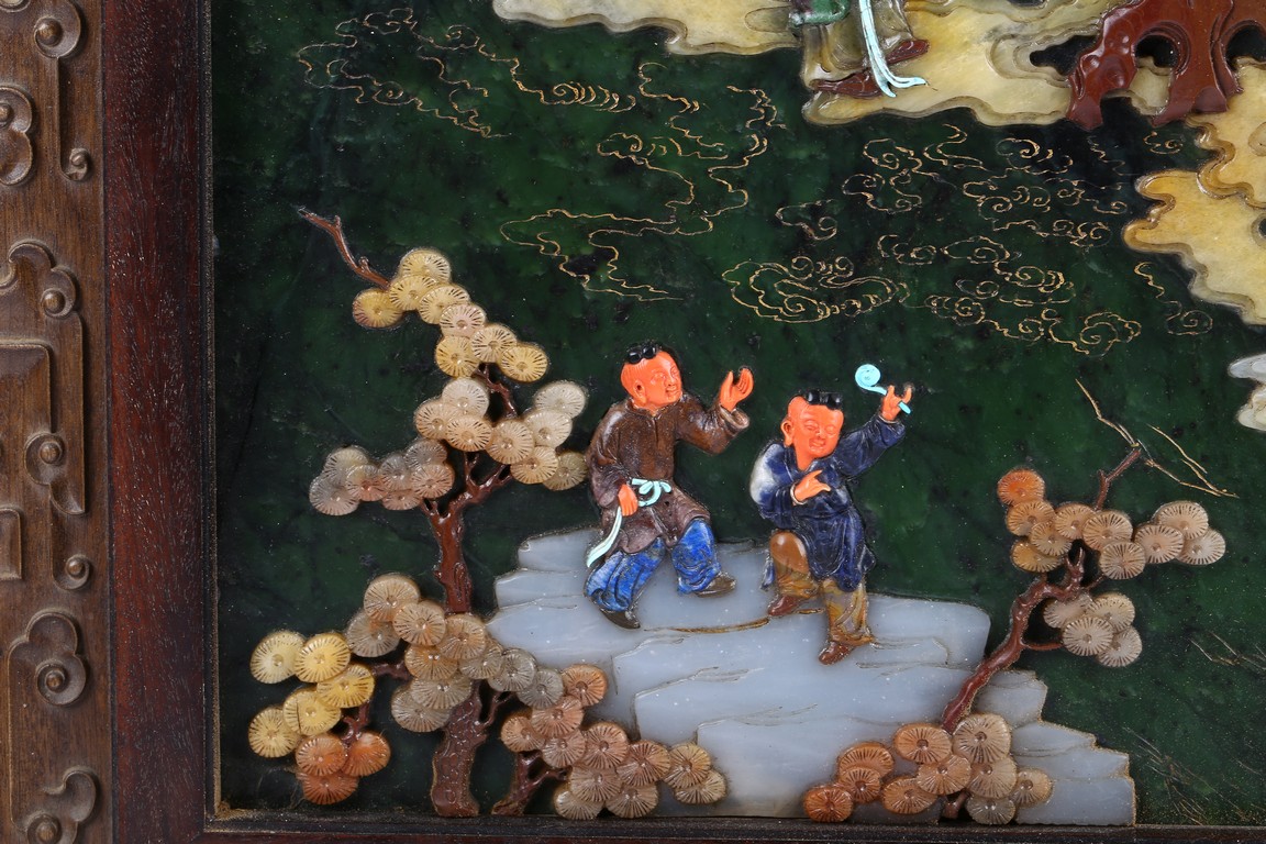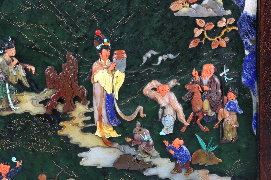 The square green jade panel finely inlaid in various gems including agate, white jade, lapis lazuli, mother-of-peark, turquoise, etc to depict deities and immortals in a celestial palace setting, all fitted on a large rosewood stand decorated with key-fret pattern.