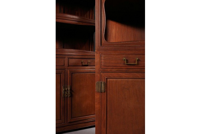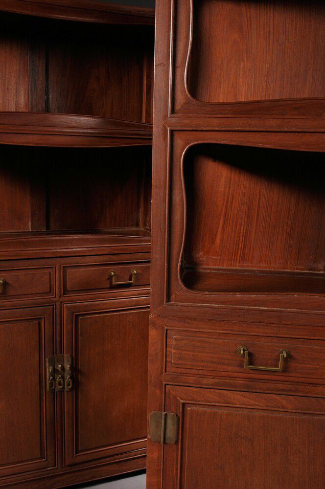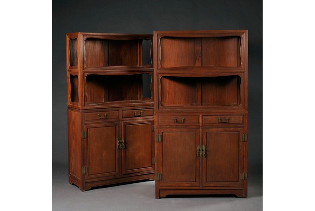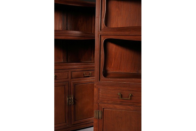 Each upper sections with two shelves supported by squared corner posts and framed with curvilinear spandrels, wooden backboard; lower sections with two drawers and below these two doors, one interior shelf, a simple beaded apron at the bottom, brass hardware.
