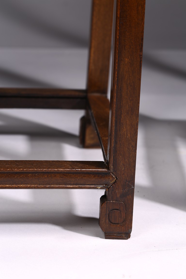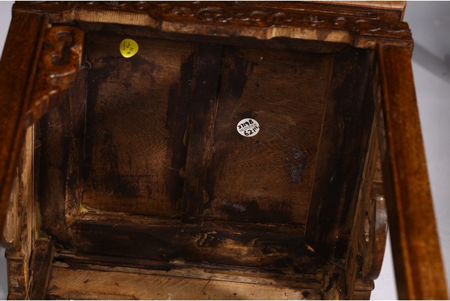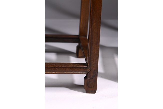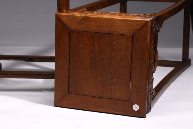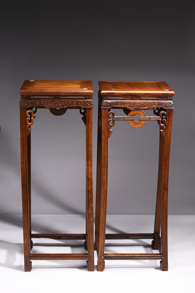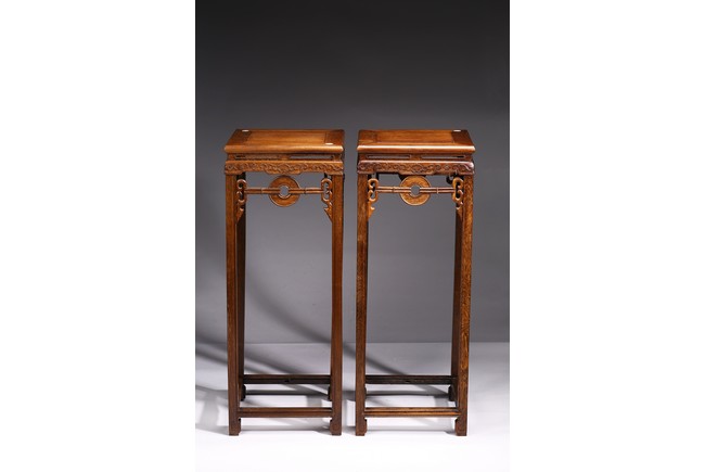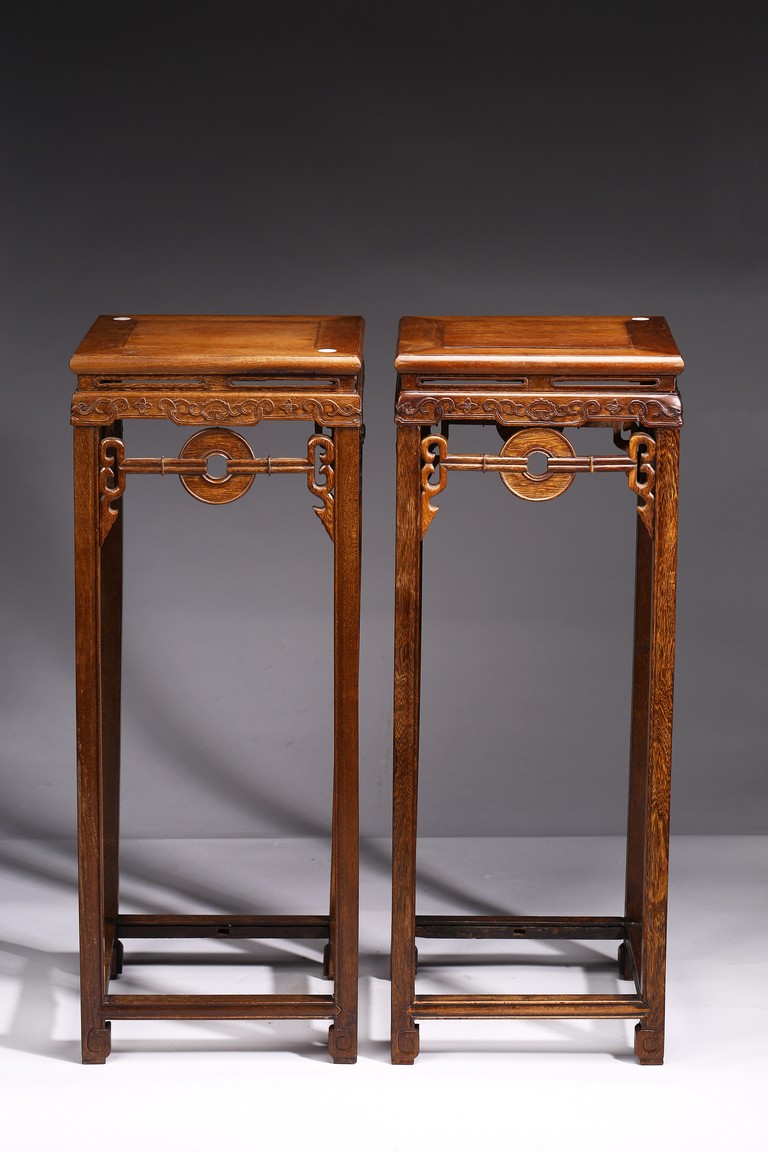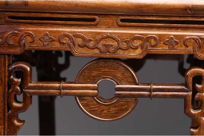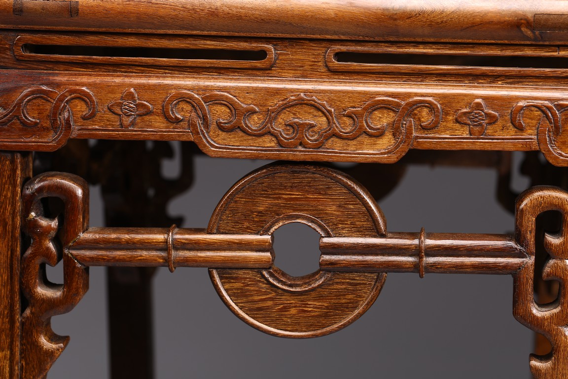 Each top panel set in curved edge frames, carvings of vines on aprons, openwork panels with coin motif, base stretchers, beaded legs ending in incised scrolls. Qing Dynasty period.