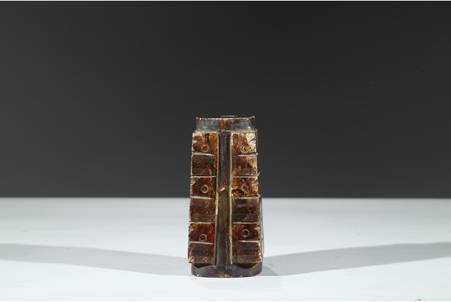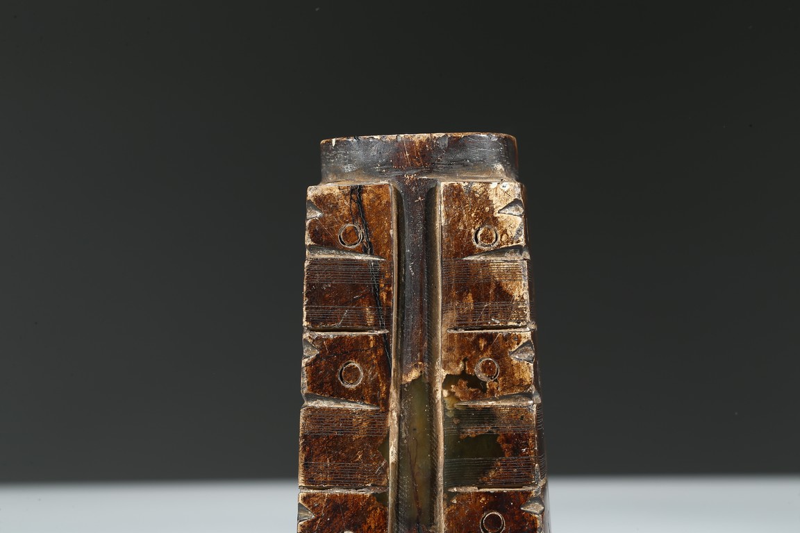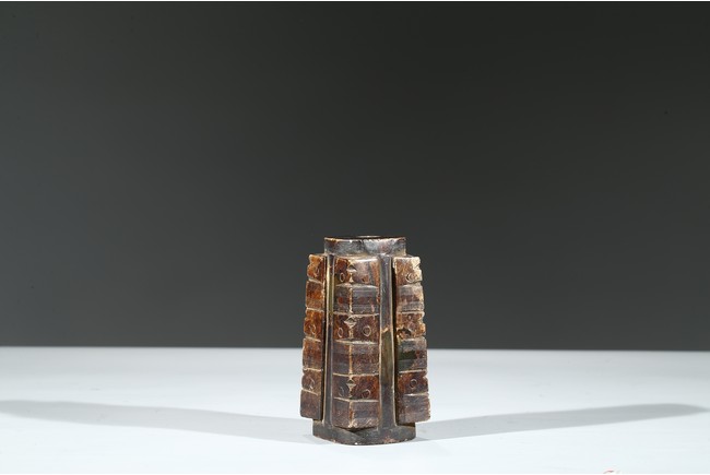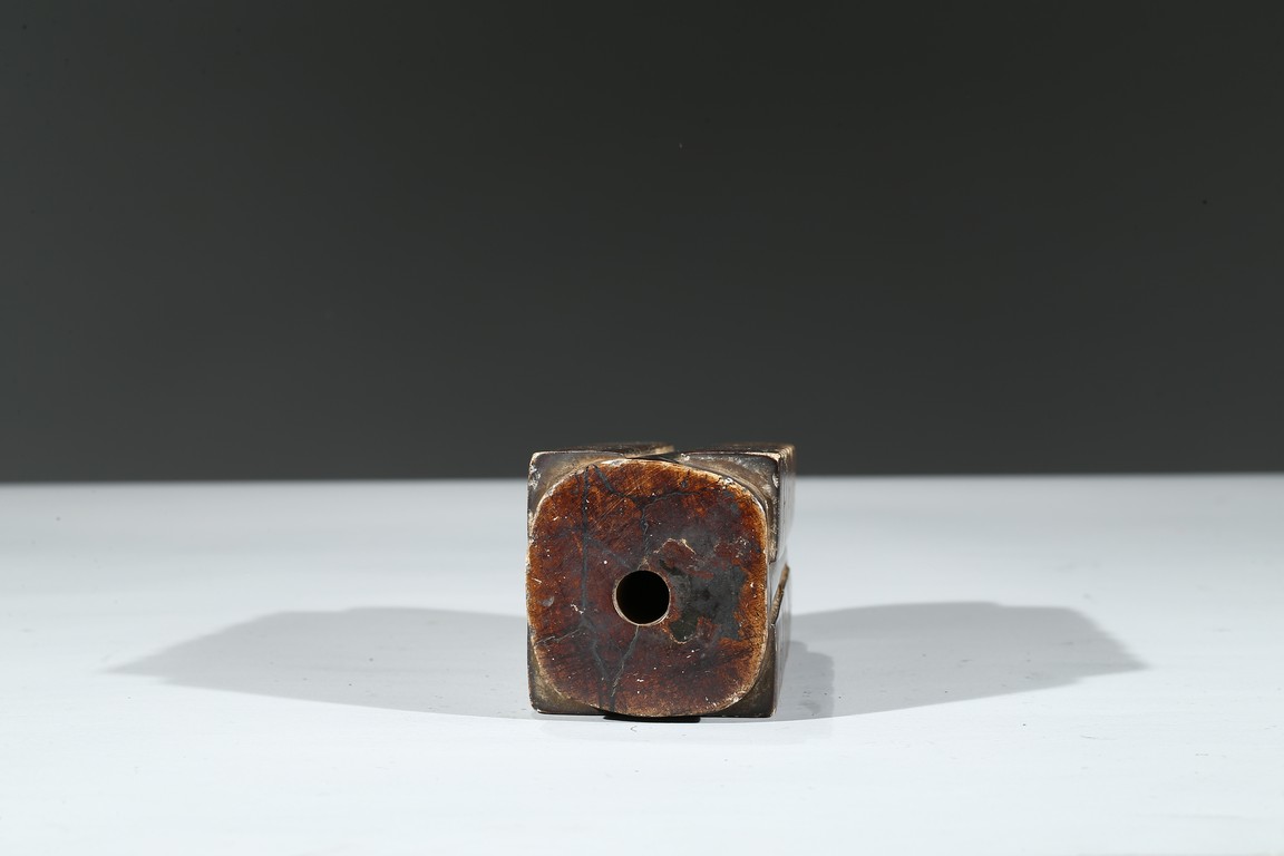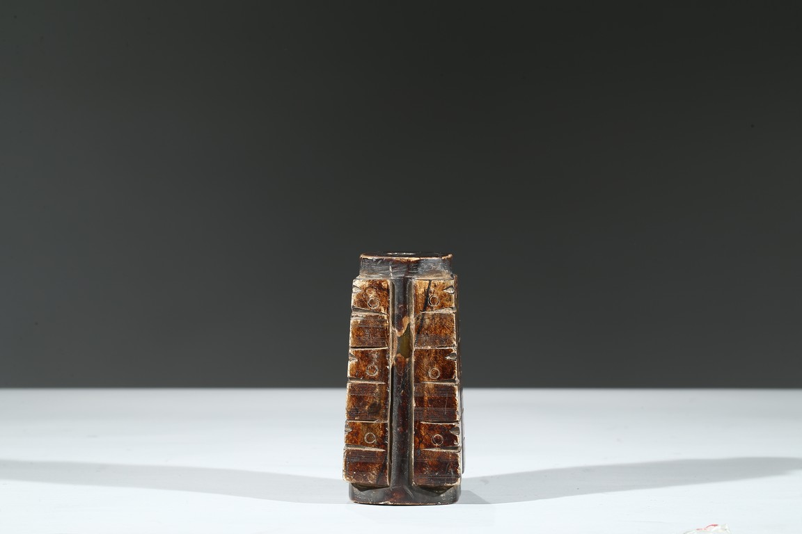 Of trapezoid shape, with three registers of taotie masks, carved with a cylindrical apertures extending from top to bottom.