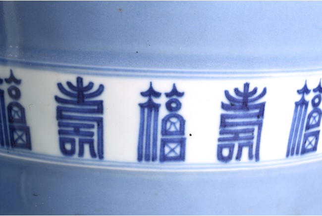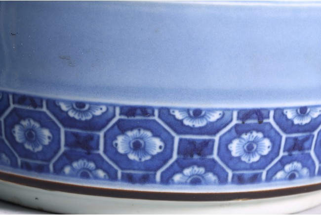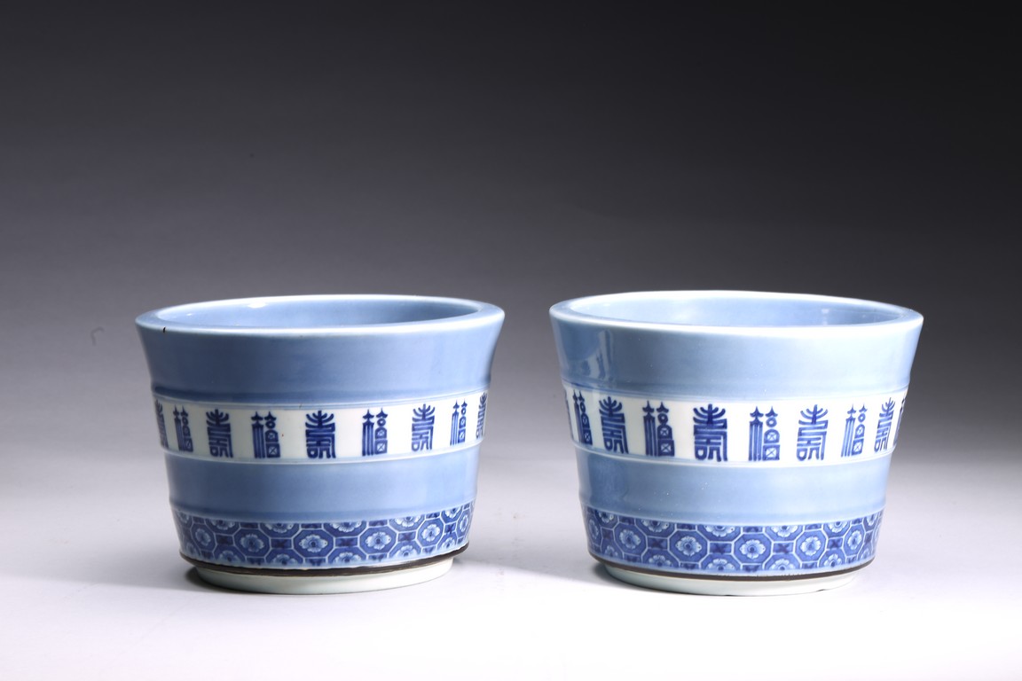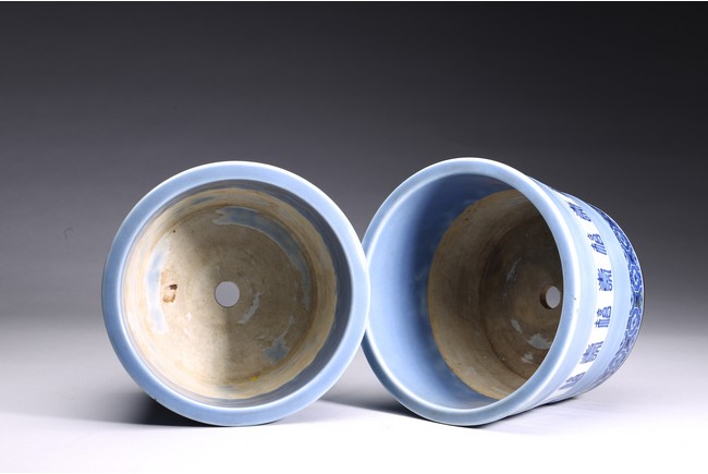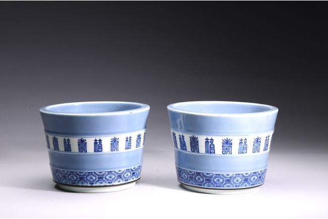 本件器物呈圓形,口沿略微外翻,造型委婉有剛性,做工精緻富有力度。盆身以天藍釉為主體,釉色厚潤,局部開光青花描繪“壽字紋”“梅花紋”。字體各異,規整且不繁亂,在天藍釉映襯下立體感更為強烈。成對保存,實屬不易。