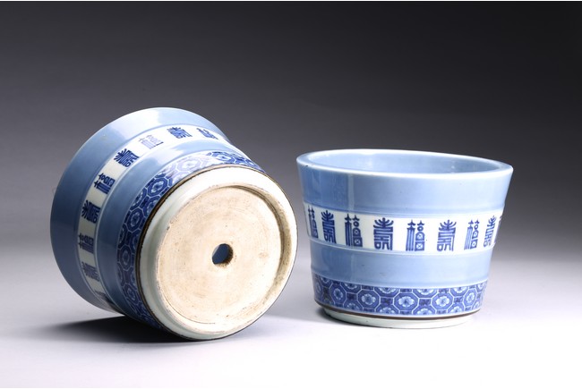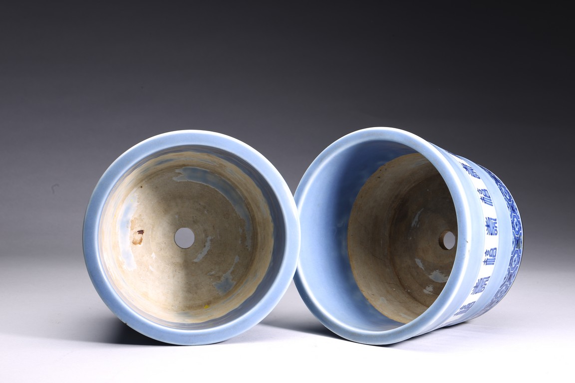 Each jardiniere finely enamelled in blue and white around the body with alternating stylized characters 'fu' and 'shou' encircling the center, the lower body with a band of geometric pattern, base unglazed and drilled with a hole. Republic period.