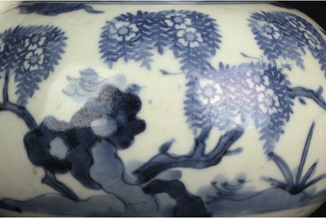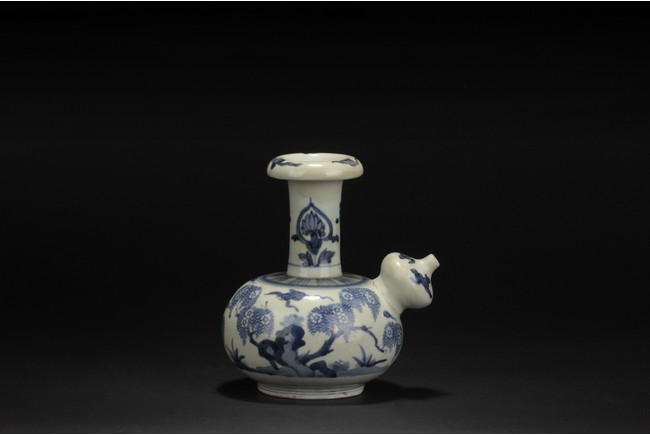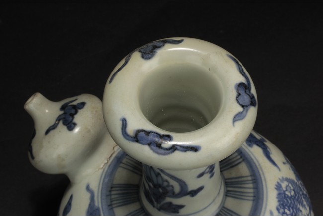 Of globular form with long straight neck and everted rim, the body painted with blossoming flowers, clouds, and viewing stones, the gourd form mouth and rim painted with cloud patterns, and the neck with similar themed flower patterns. Includes Hong Kong Art Craft Merchants Association Certificate of Antiquity No. B 197-1, dated May 1st, 1971, stating the vase is over 100 years old. Qing Dynasty period.