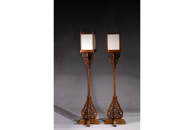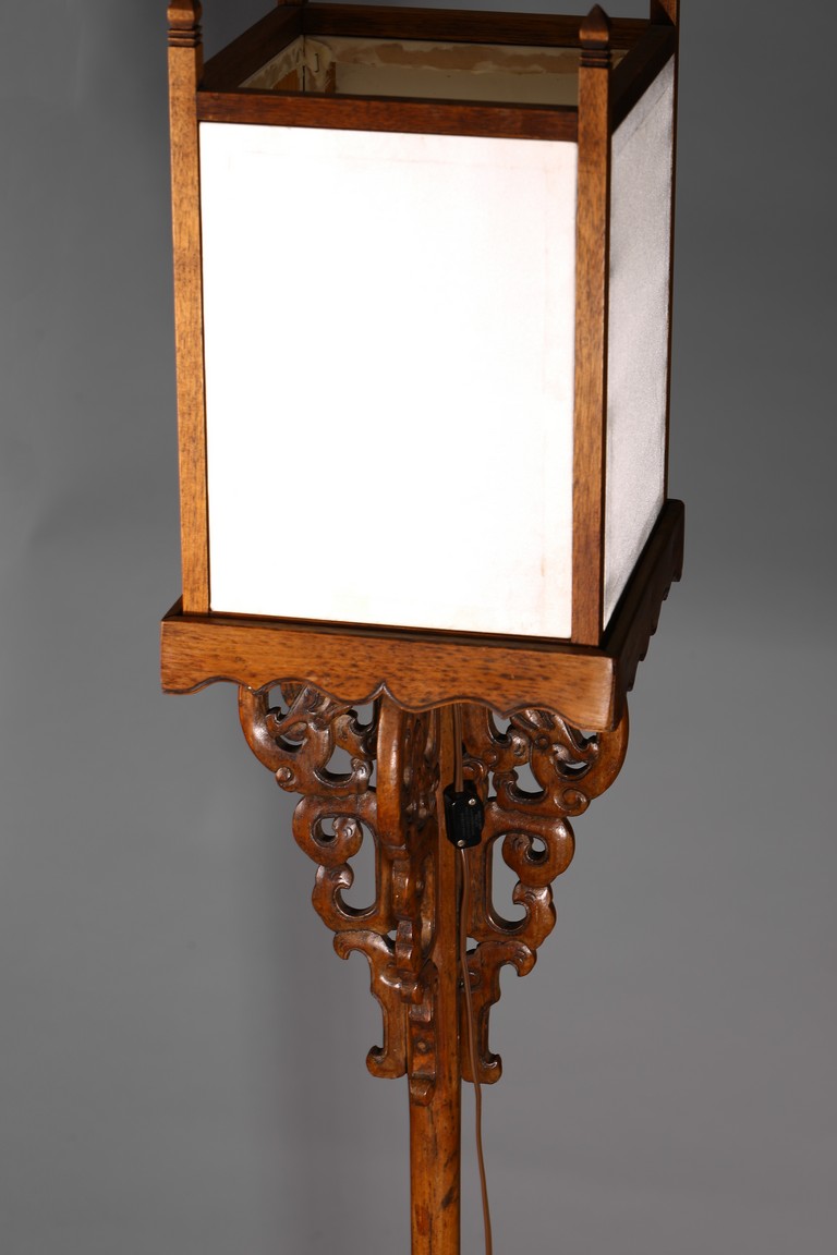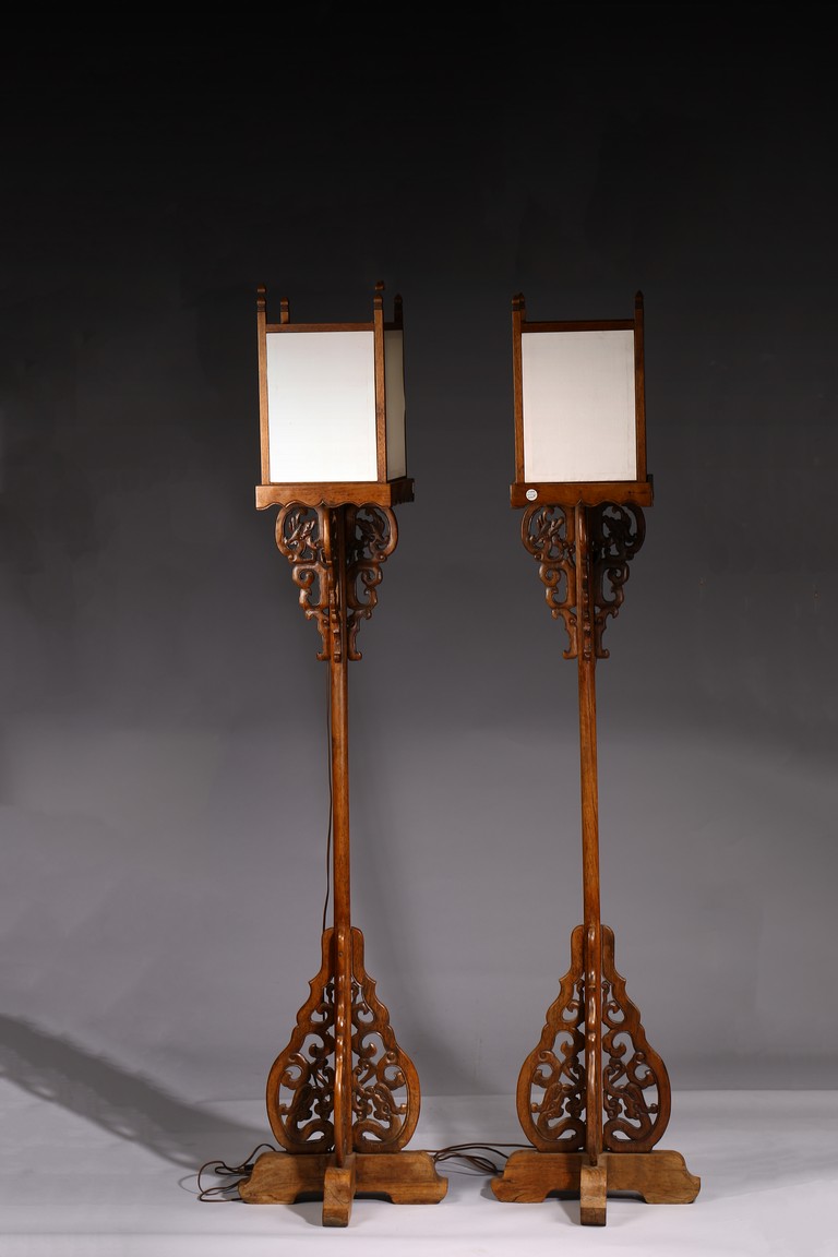 Each candle stand set above four openwork spandrels with dragon motifs attached to an upright pole, two crossed shoe feet topped by conforming dragon motif spandrels, silk panels set into squared frames form the shade, fittings for electricity are removable. Qing Dynasty period.