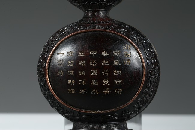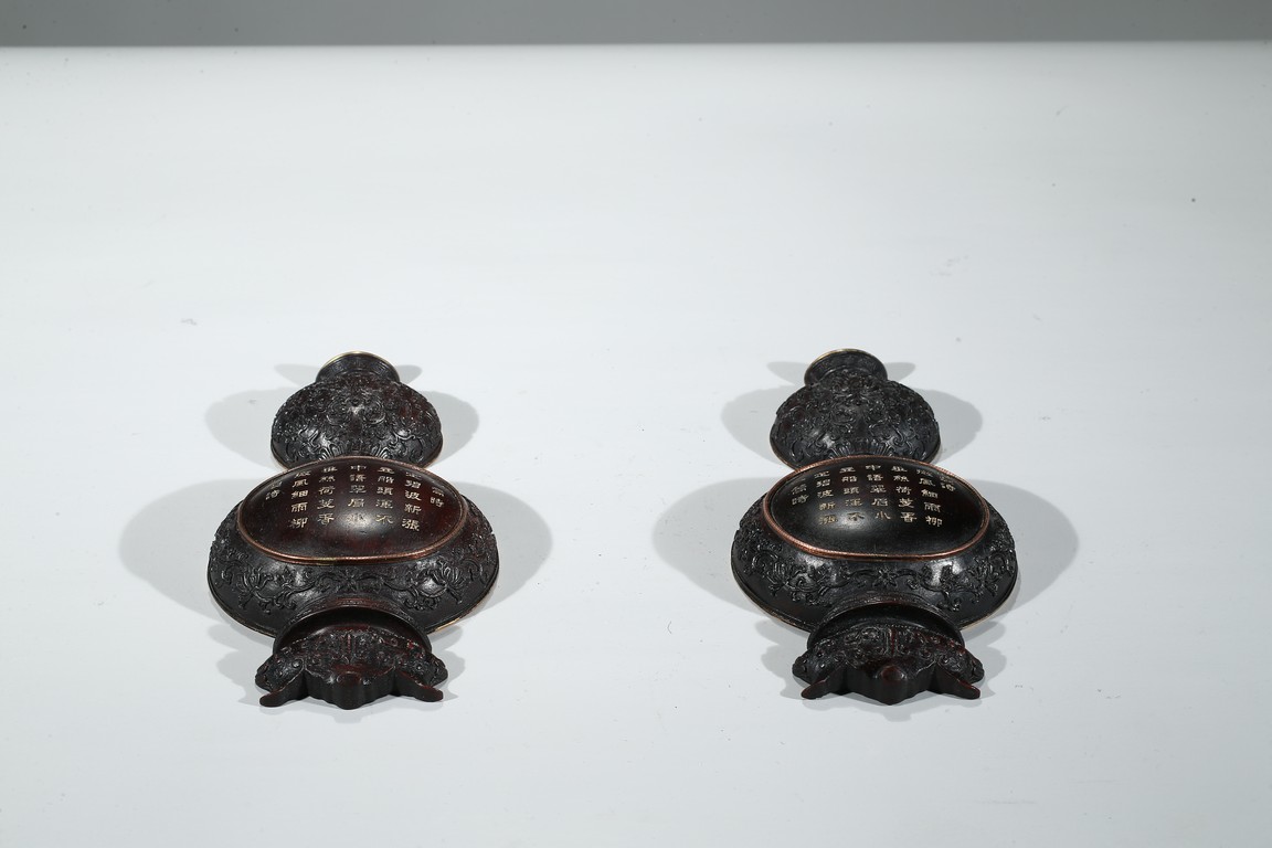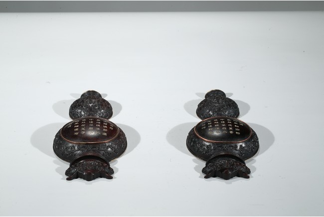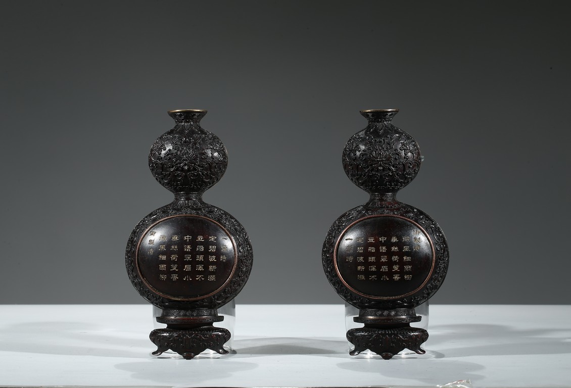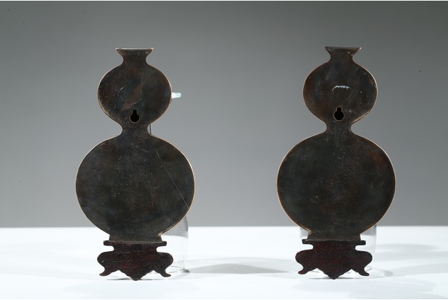 葫蘆形,整體半剖,背面平整有穿,繫繩懸掛所用。壁瓶是專為懸於牆壁上或掛於轎中設計的瓶式,又稱「掛瓶」或「轎瓶」。此對葫蘆壁瓶,雕刻纏枝花卉紋、迴紋,線條流暢圓潤,刀工精湛細緻,嚴謹工整、一絲不苟。置掛於壁,滿室生輝。