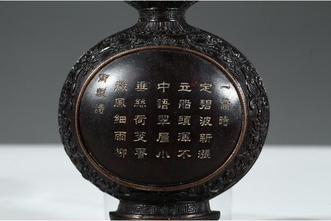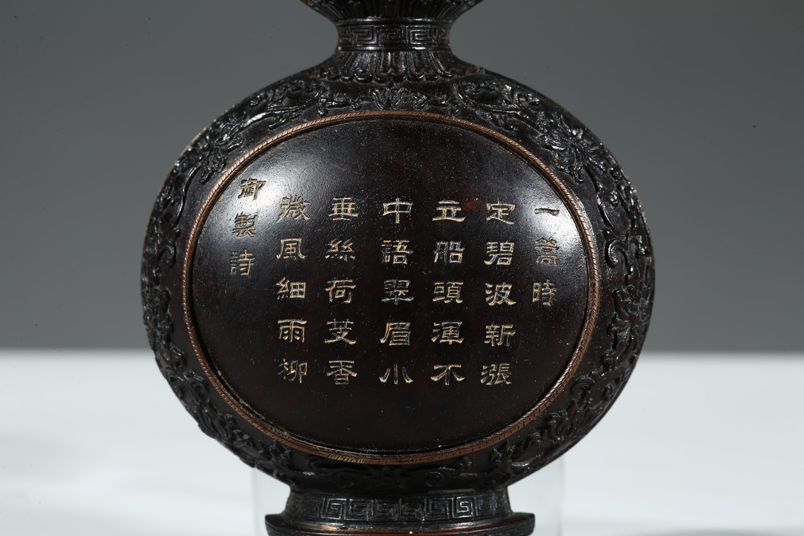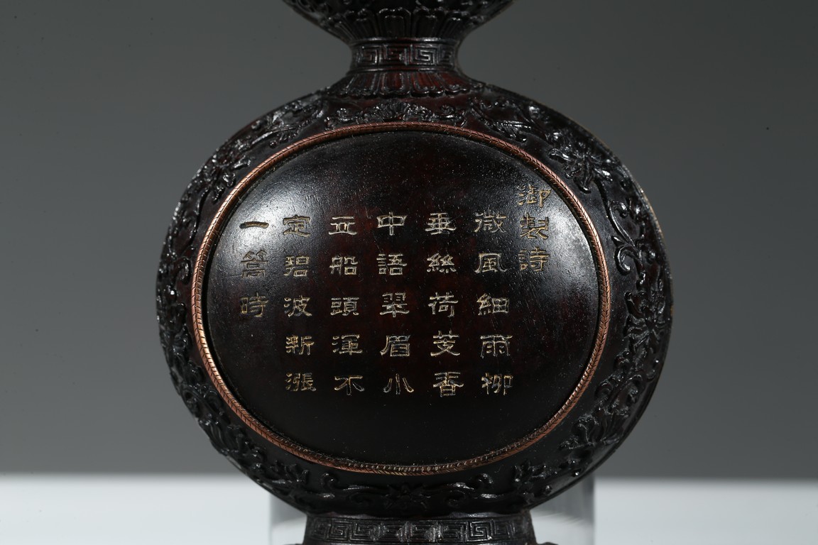 Of double gourd form, the lower lobe inscribed in gilt with Imperial poem enclosed within a circular panel, all reserve on ground of dense lotus scrolls.