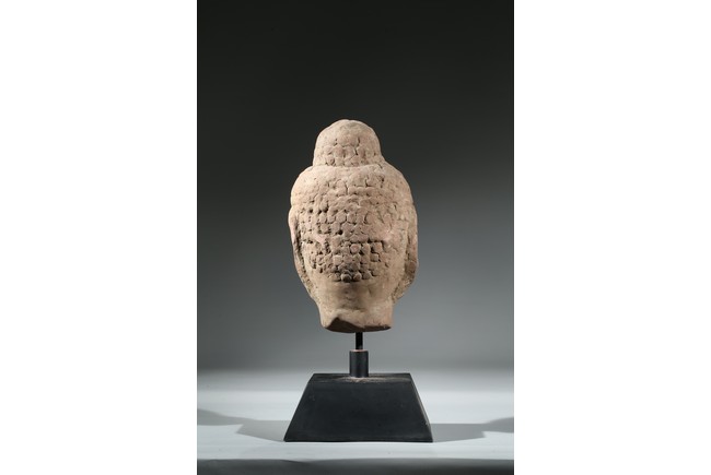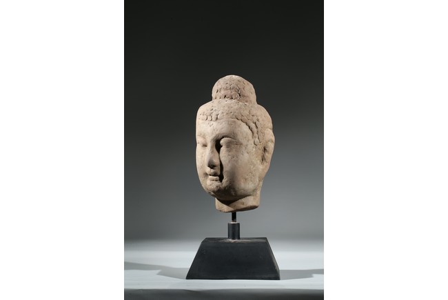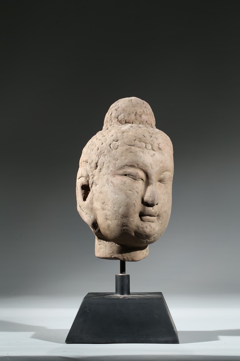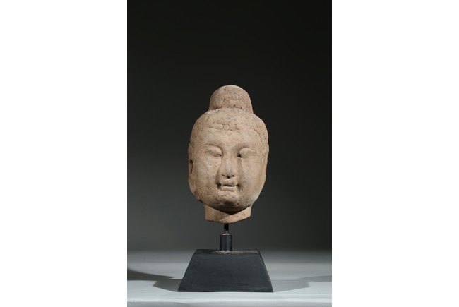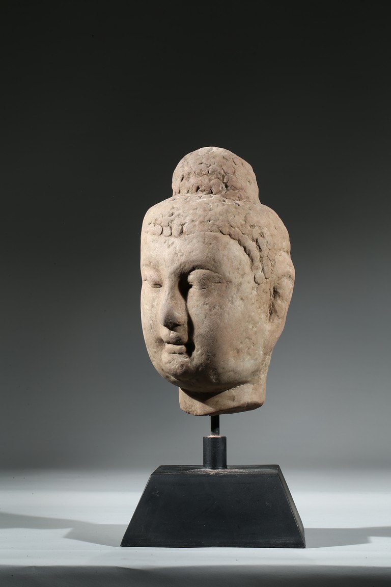 此尊佛頭像雕鑿工藝精細,結構嚴謹。面部豐腴,面目修長,向兩側上挑,眼瞼微開,作俯視狀,鼻挺唇厚,嘴角微帶笑意,下顎圓滿,雙耳垂肩,呈雍容閑靜之感。