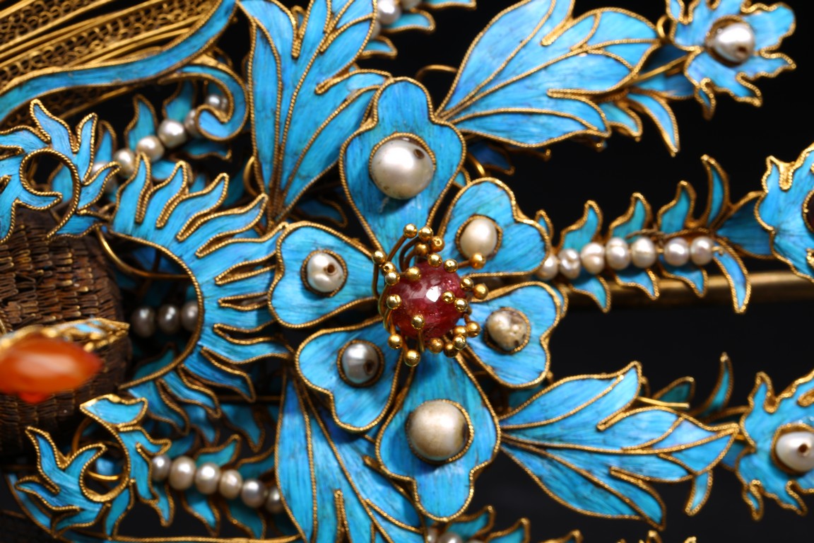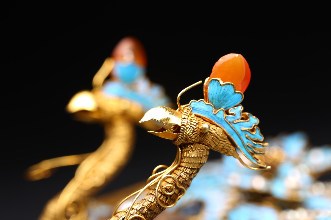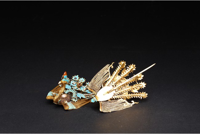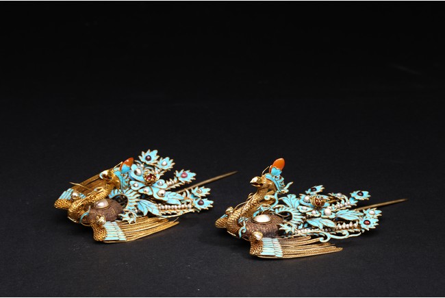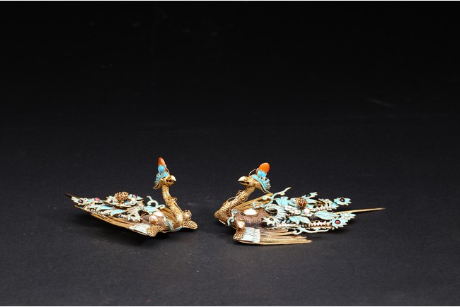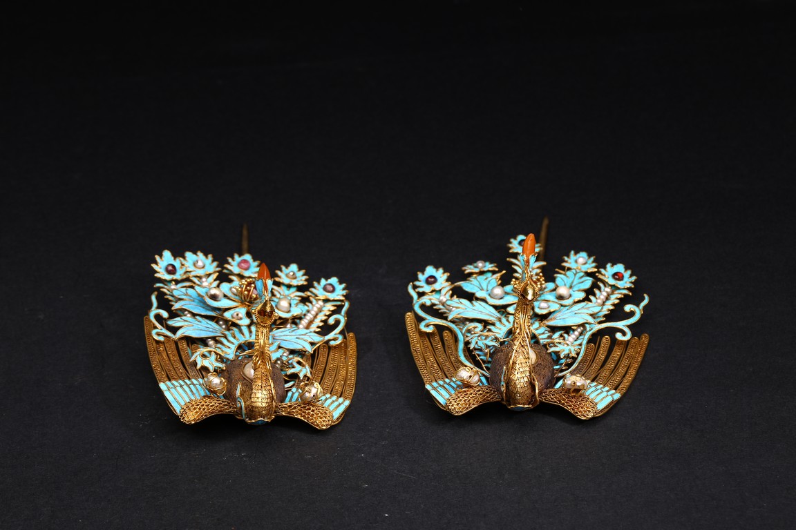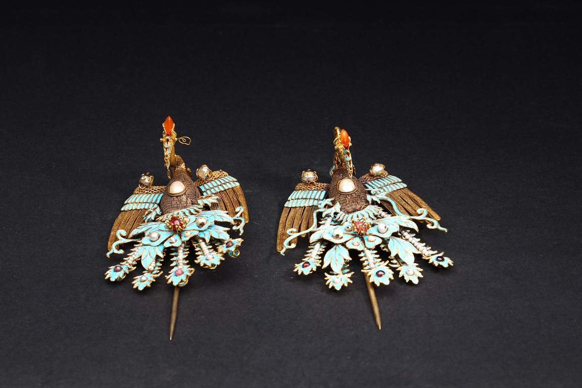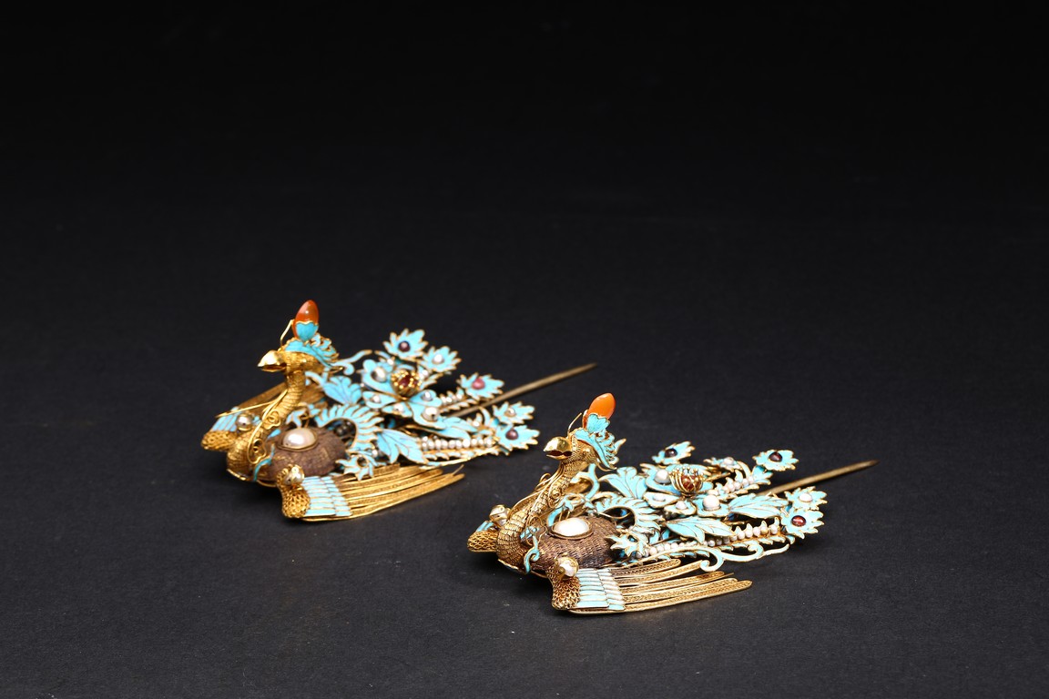 Each hair ornaments shaped as phoenix and inlaid with pearls embellished on gilt silver filigree.The kingfisher feathers are of a vibrant turquoise blue tone. Qing Dynasty period.