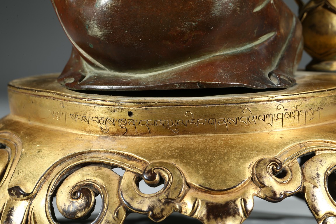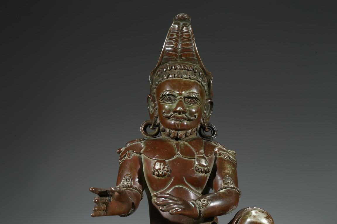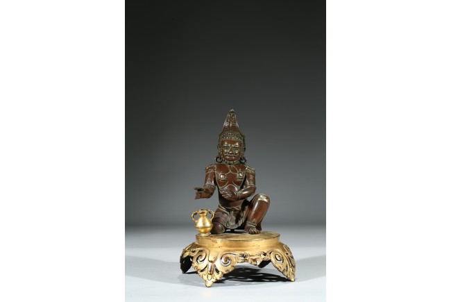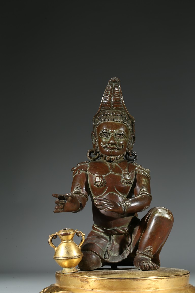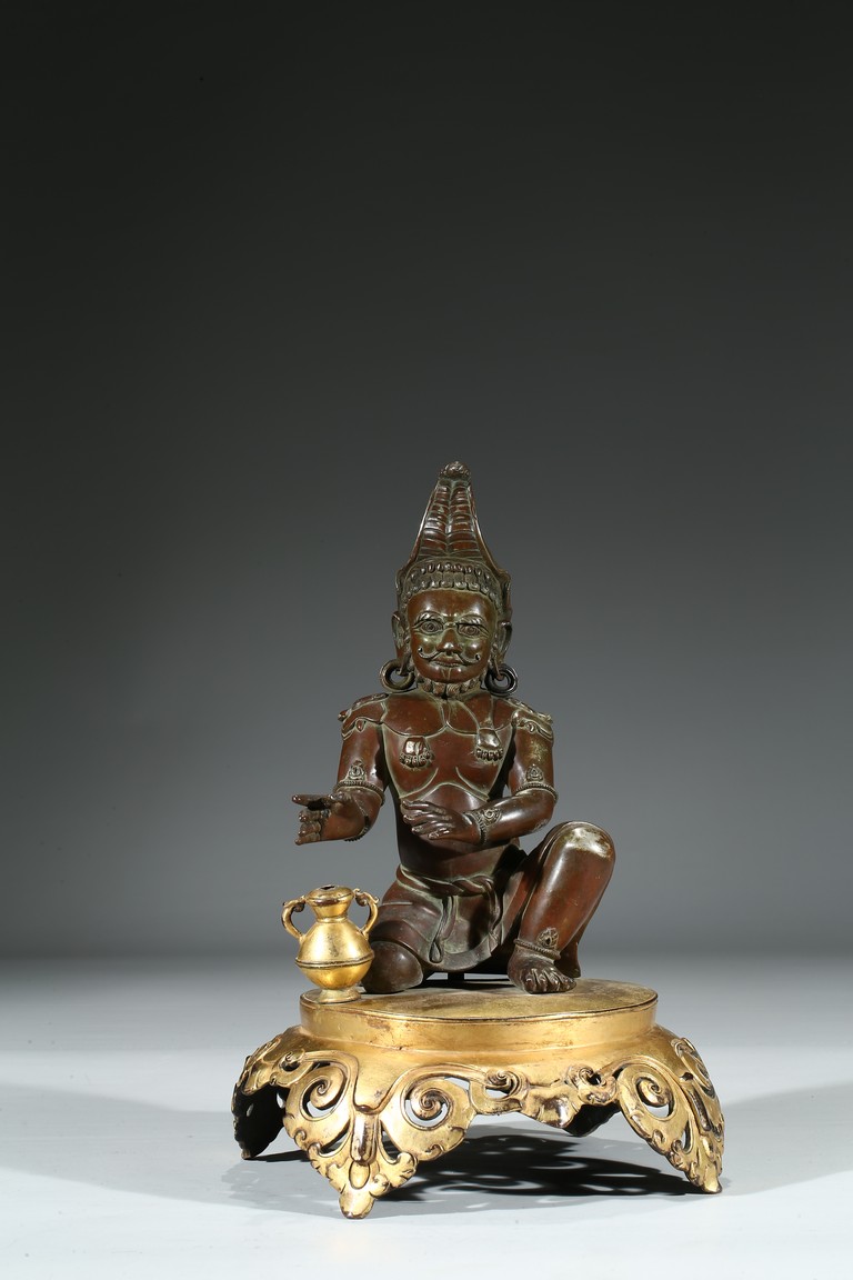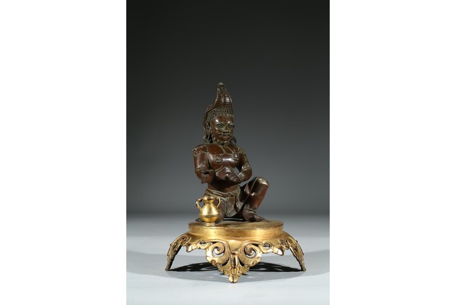 The figure cast with foreign features, with broad nose, bulging eyes and beard, shoulder covered with animal skin, kneeling with one leg raised, arms raised with hands reaching a vase to his right, all supported a round base, back with Tibetan inscription. Qing Dynasty period.