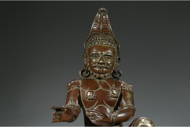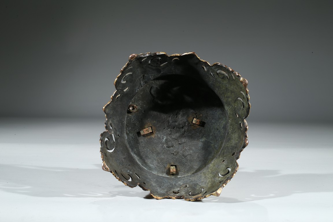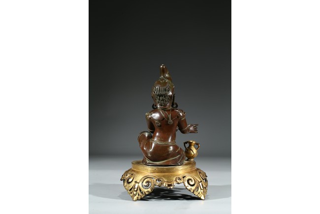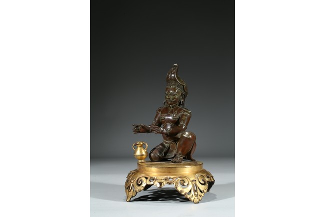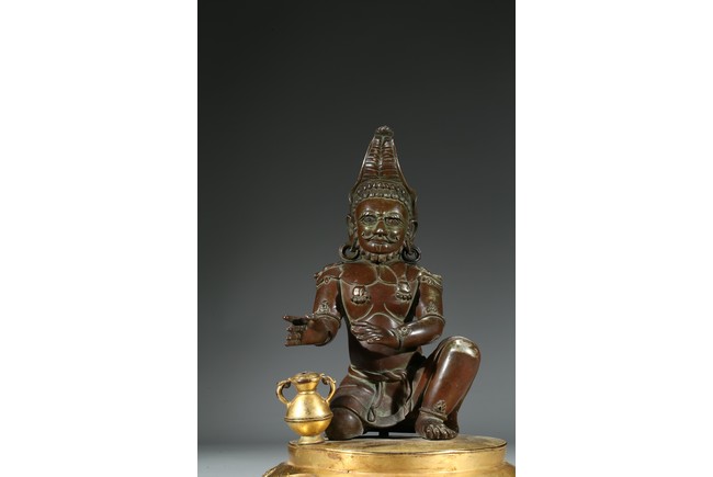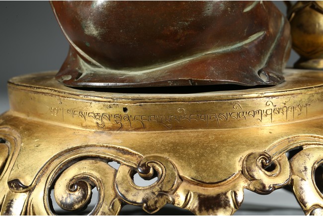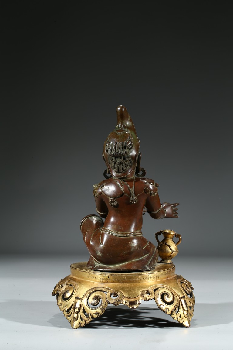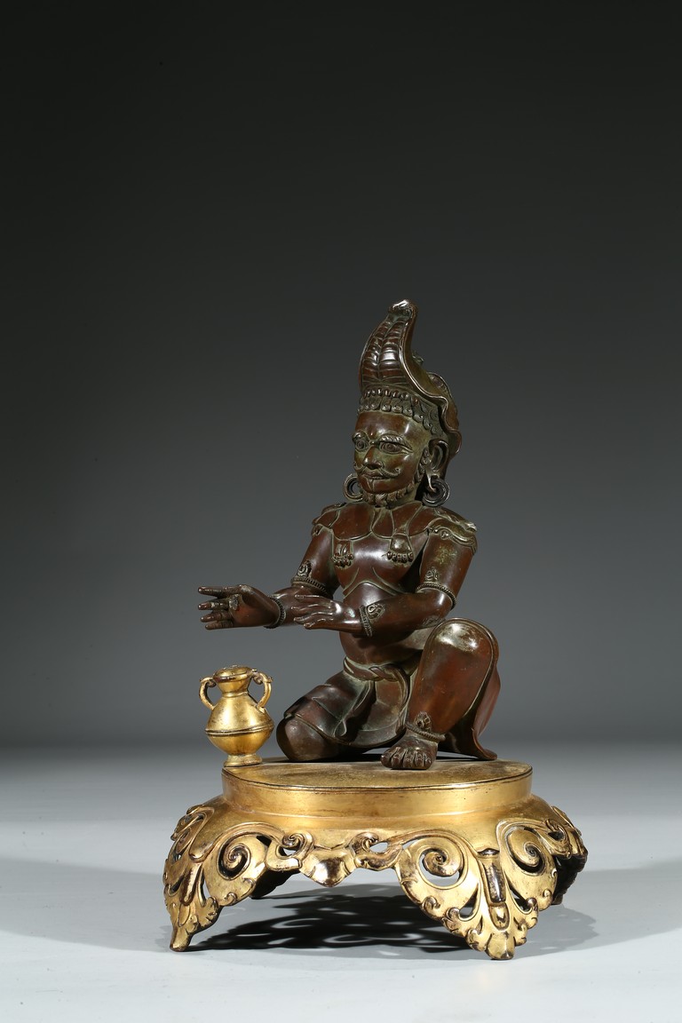 此拍品所表現的是西域對中原的臣服和進貢的場景,以銅塑成胡人跪地獻寶物。胡人形象粗獷怪異,頭戴高帽,上身近乎赤裸,下身略施衣帶,作小蹲狀跪拜於寶瓶之後。採用大量西方中世紀雕塑藝術寫實風格,又融合中國傳統紋飾,造型,花費大量精力刻畫面部鬍鬚,衣物褶皺,飄帶的隨風靈動,使衣物層次分明,將外國使臣不畏艱辛,風塵僕僕前來獻寶的造型刻畫得活靈活現,背部鏨刻藏文,實為不可多得的藝術精品。