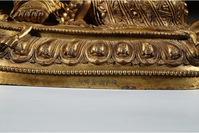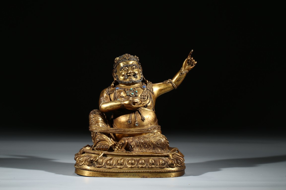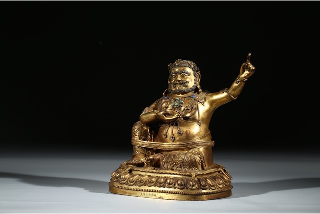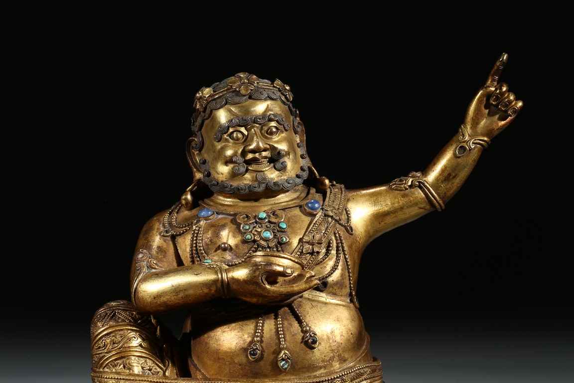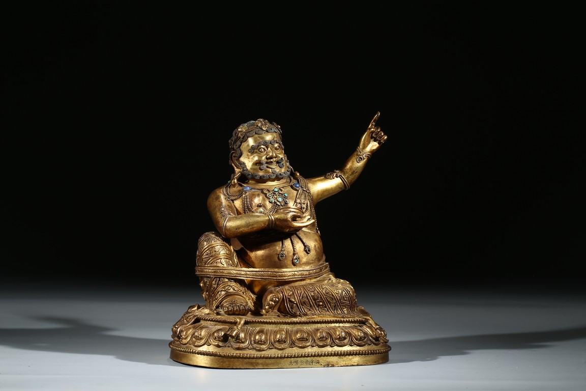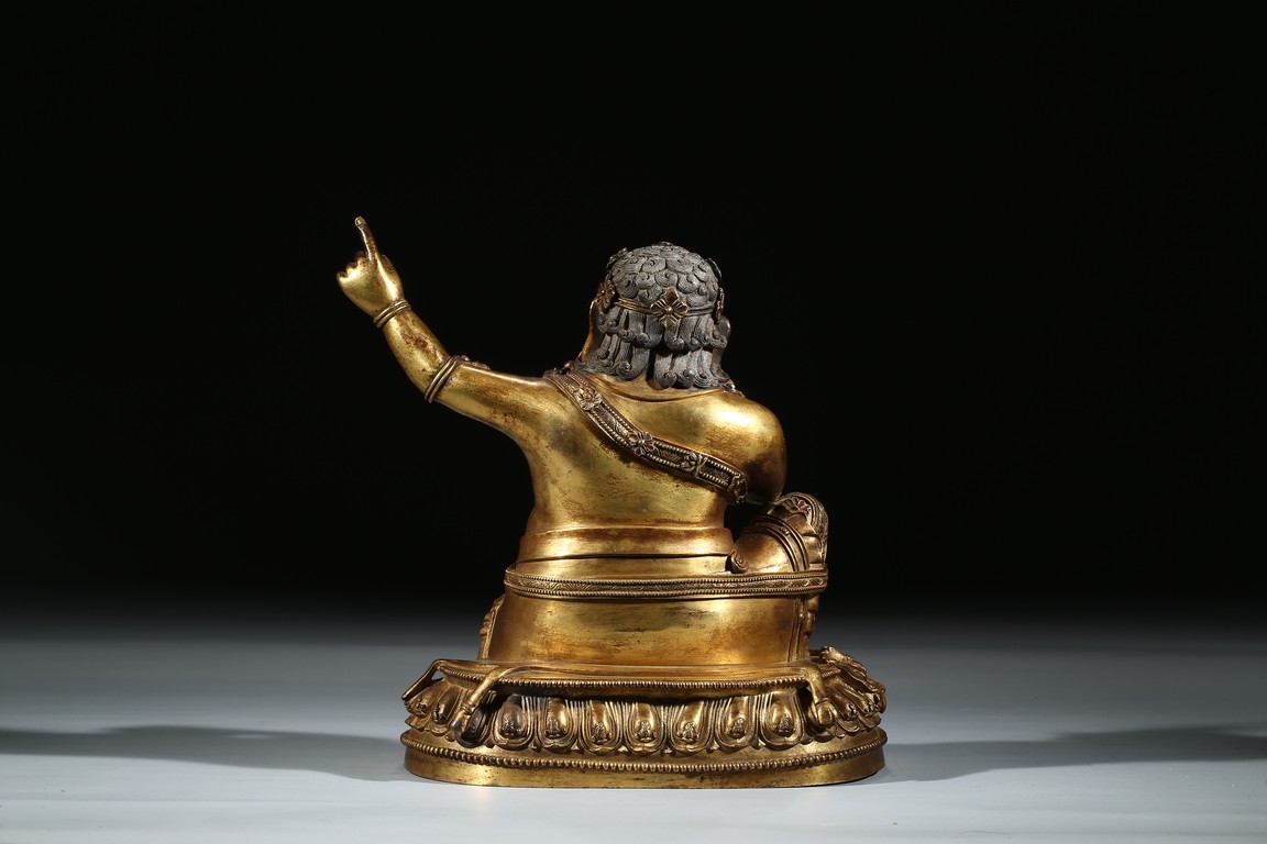 The bearded figure is modelled seated on a deer skin over a lotus stand, and is wearing long robes adorned with elaborate semi-precious stone inlaid jewellery and headdress. He is holding one hand aloft and the other holds a scull cup. The front of the stand incised with six character Xuande mark. Ming Dynasty or later.