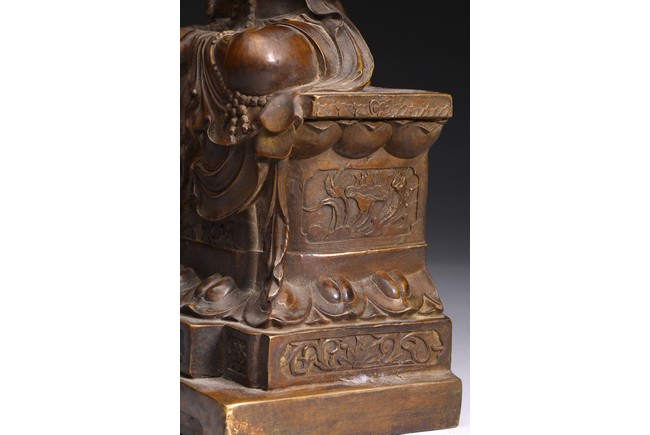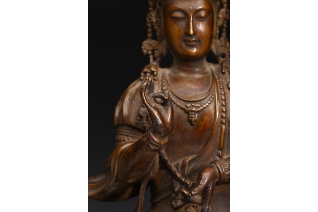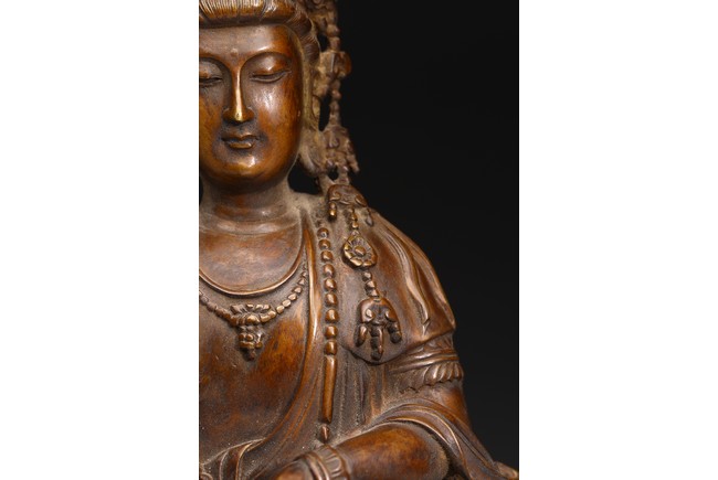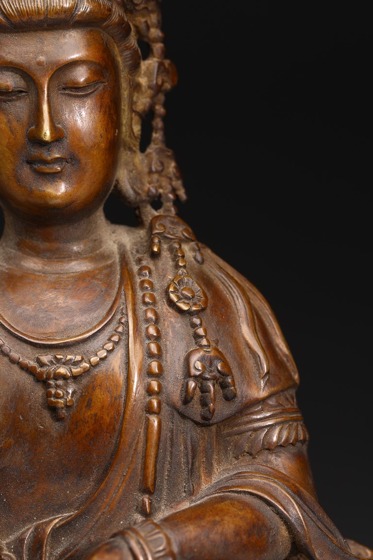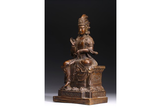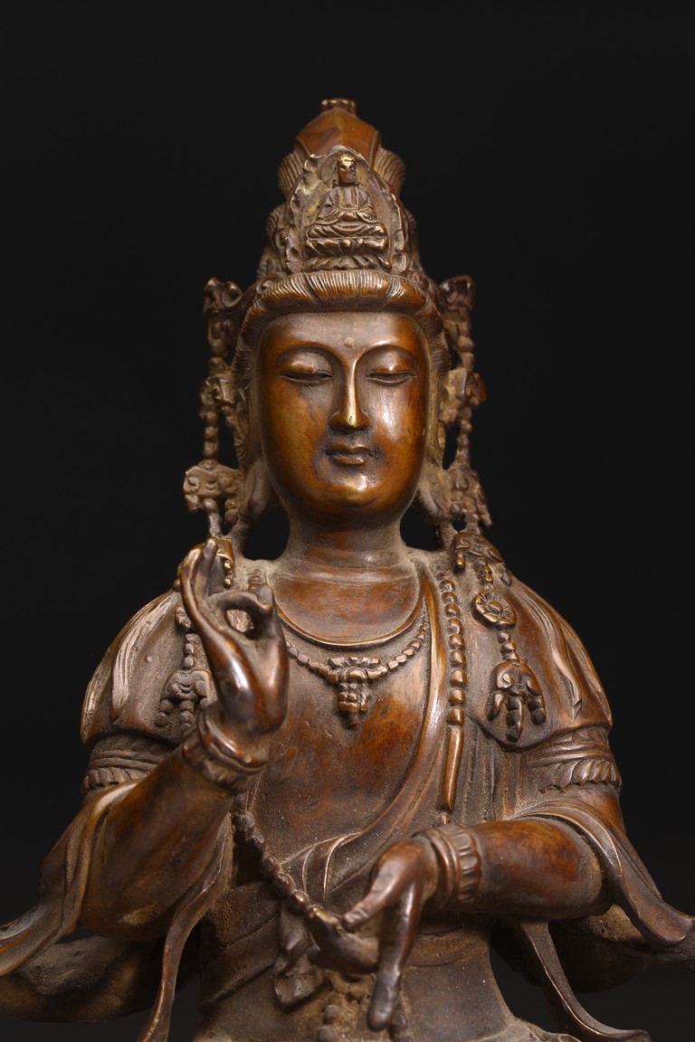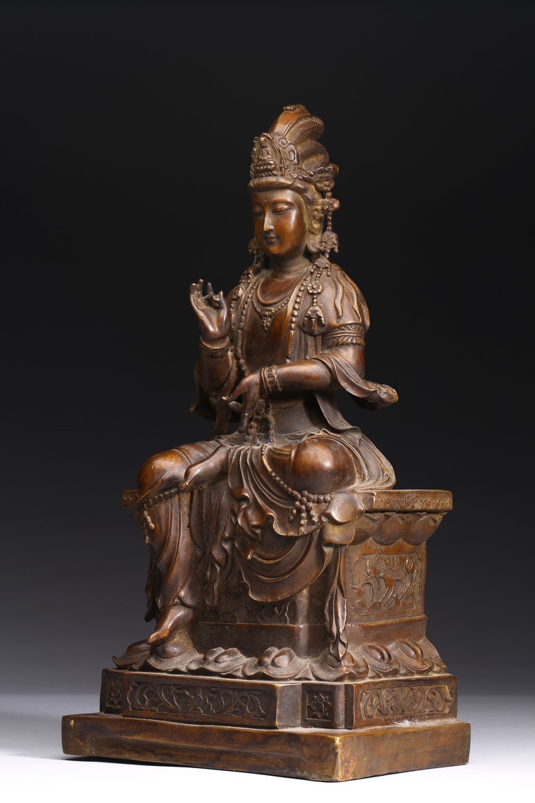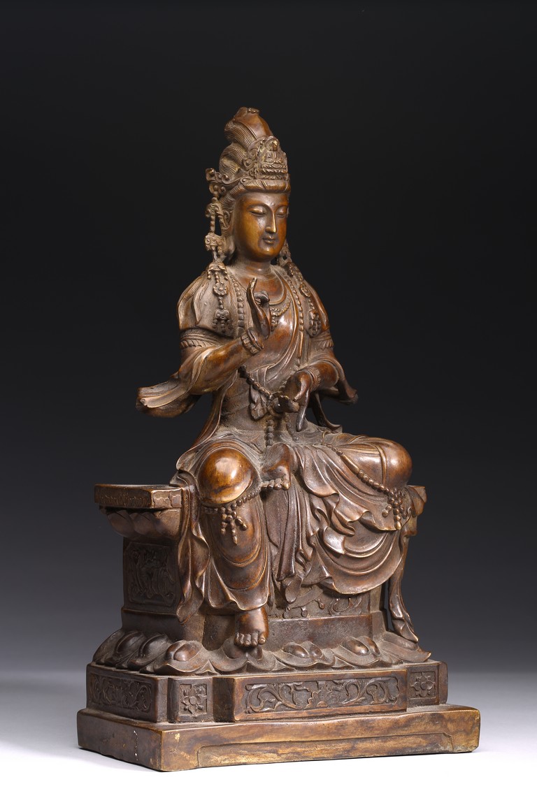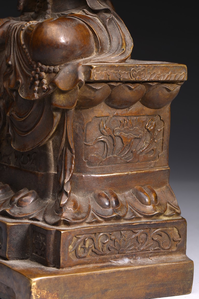 The bronze cast bodhisattva is shown seated in royal pose on a plinth, wearing elaborate jewelry, the elongated face with serene expression and framed by elaborate crown.