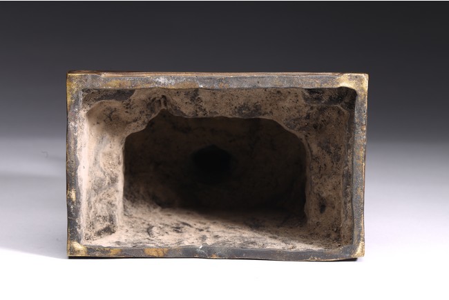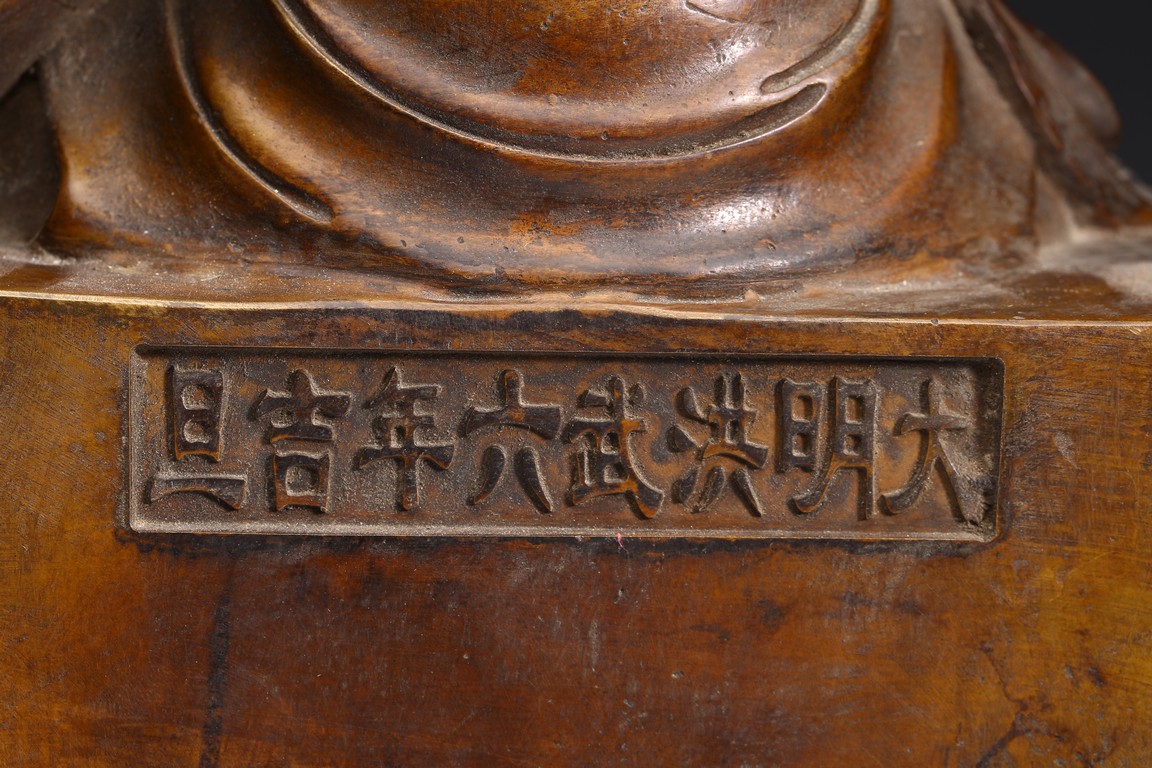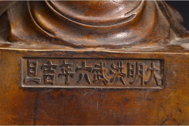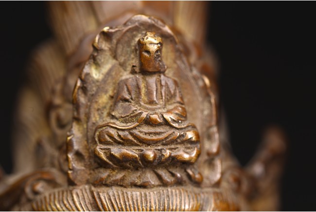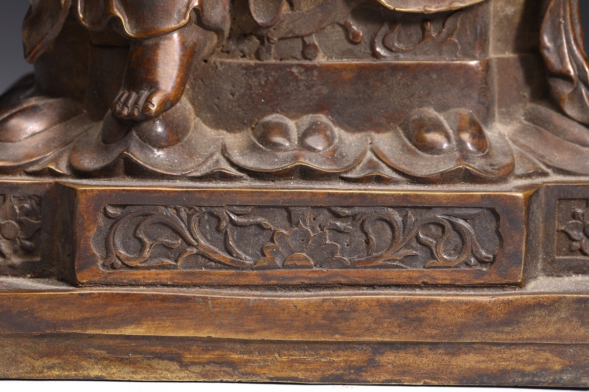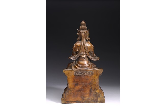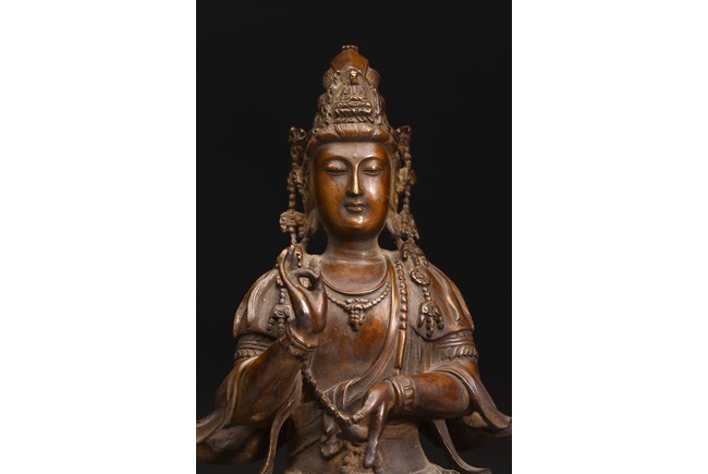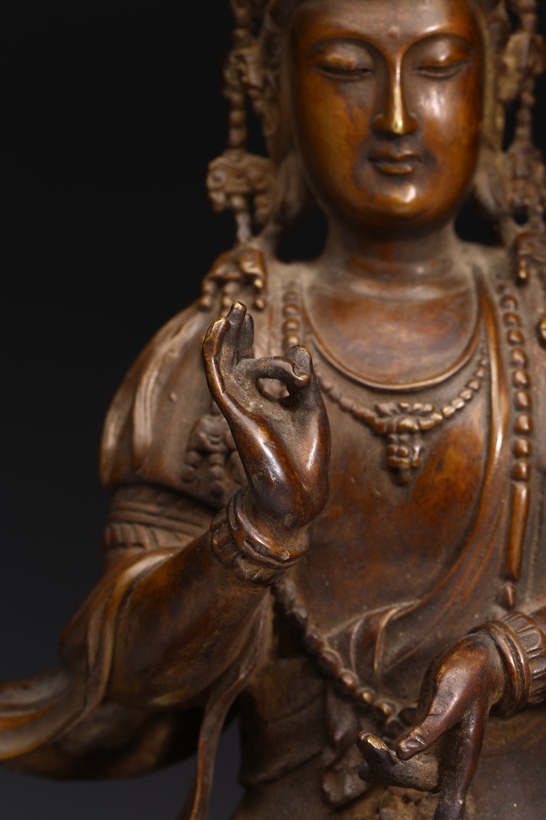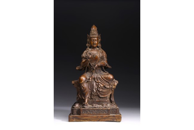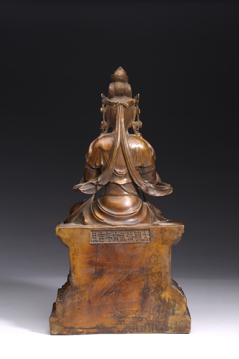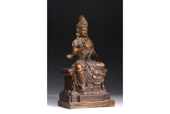 The bronze cast bodhisattva is shown seated in royal pose on a plinth, wearing elaborate jewelry, the elongated face with serene expression and framed by elaborate crown.