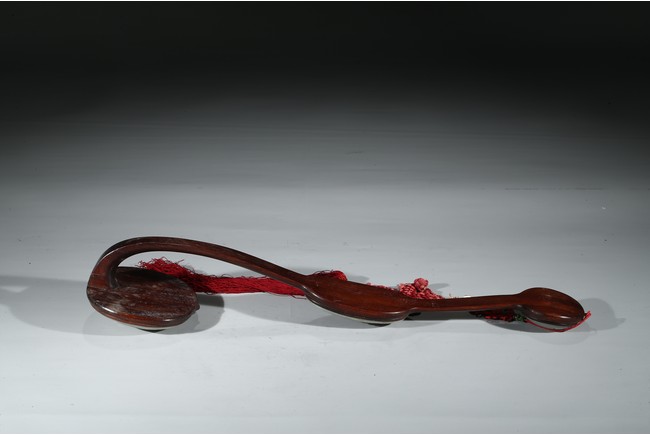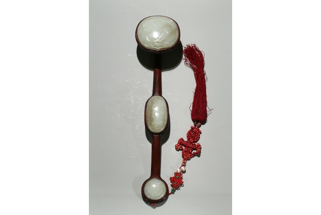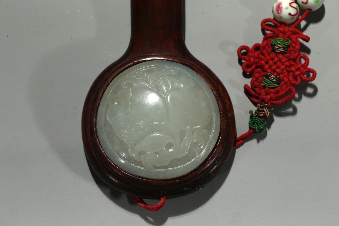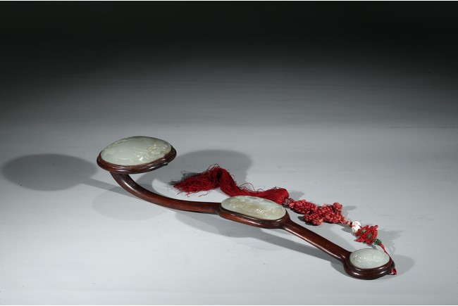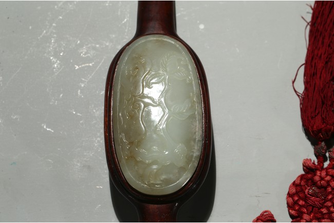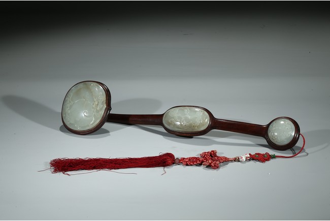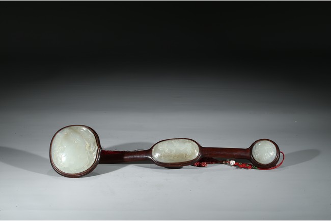 The plain rosewood scepter inlaid with three white jade plaques, the largest carved with leafy peaches, the middle oval plaque carved with fingered citron, and the third carved with pomegranate. Qing Dynasty period.