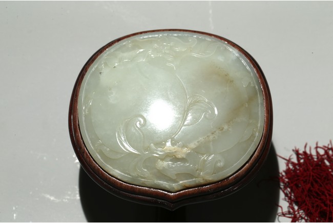 Provenance: Property from a private collection, San Francisco 本件如意造型雍容而端莊,曲線婉轉而流暢,結構嚴謹而和諧,工藝嫻熟而精湛,風格大多呈現為華麗精巧,一木連作,三處鑲玉嚴絲合縫,渾然一體。首部裝嵌浮雕蟠桃紋玉,腹部裝嵌佛手紋玉,尾部套嵌石榴紋玉,木柄光素無紋,韻味十足。 來源:三藩市私人藏家收藏