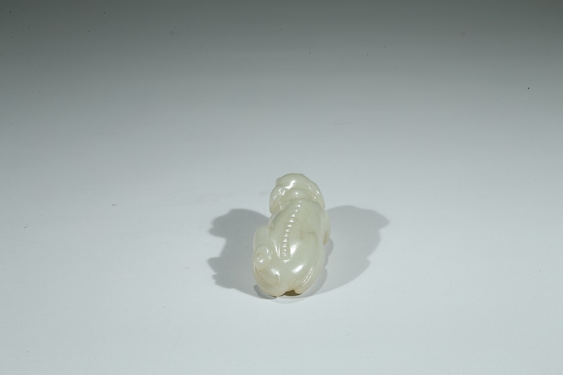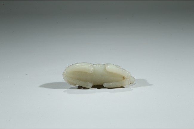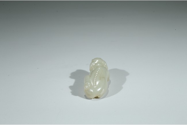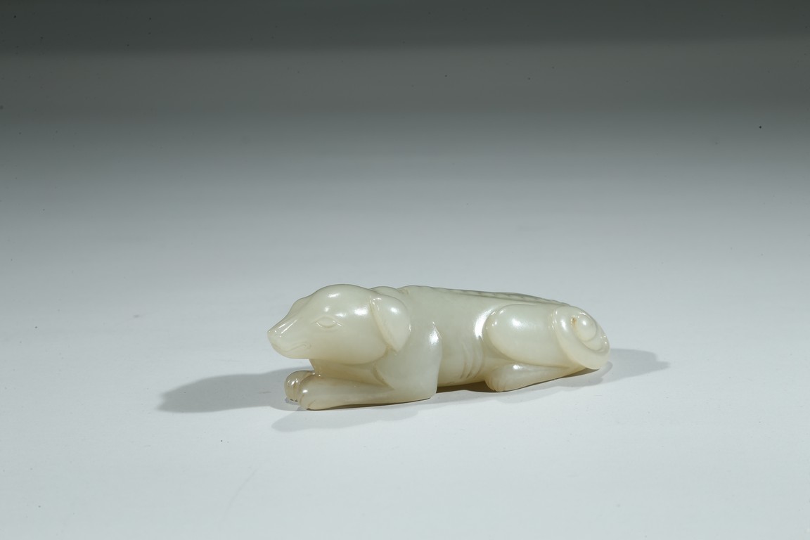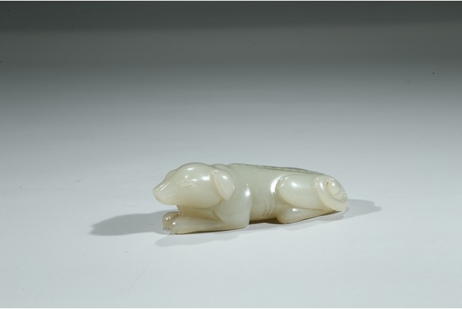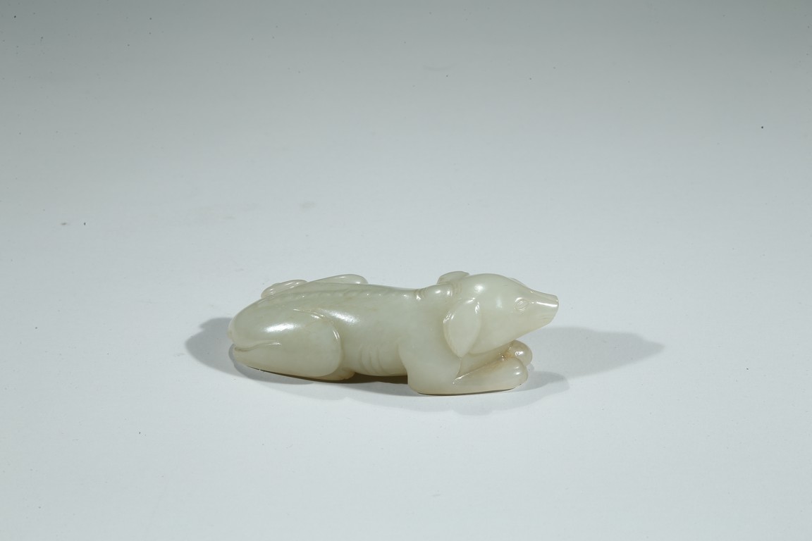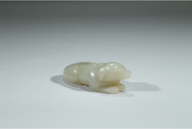 Carved in the form of a recumbent dog with its limbs tucked underneath, tailed curled to one side, floppy ears. Ming Dynasty period.