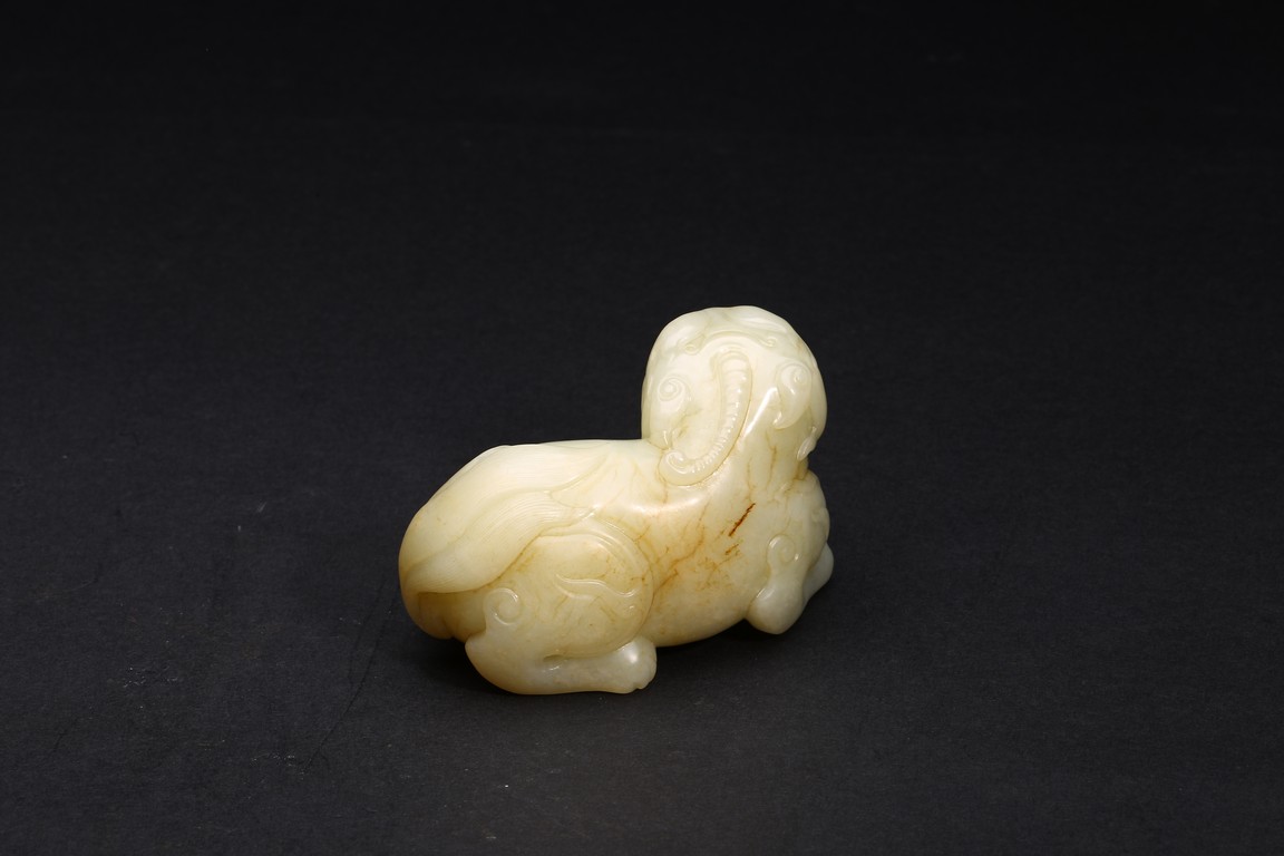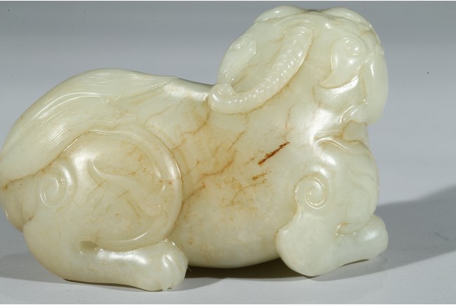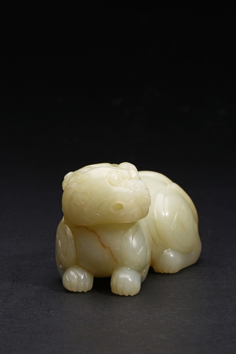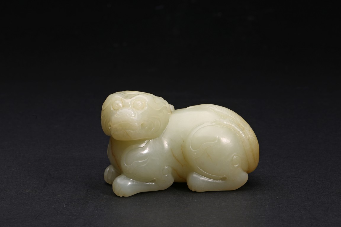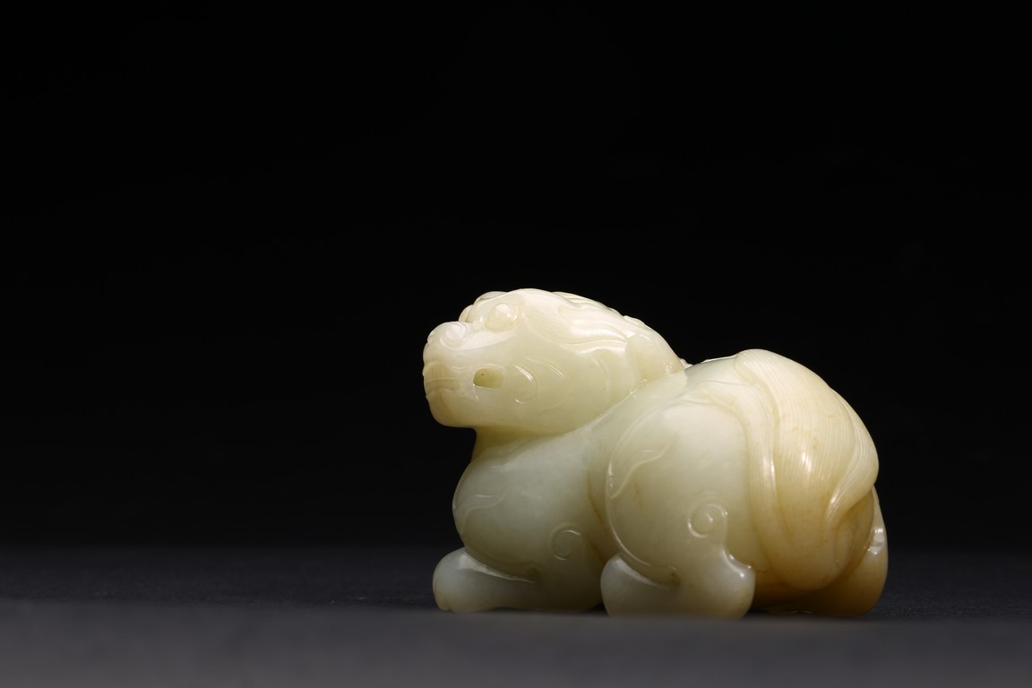 The mythical beast shown seated and worked in the round, detailed with winged haunches and thick bushy eyebrows, the stone is of white tone with russet veining. Qing Dynasty period.