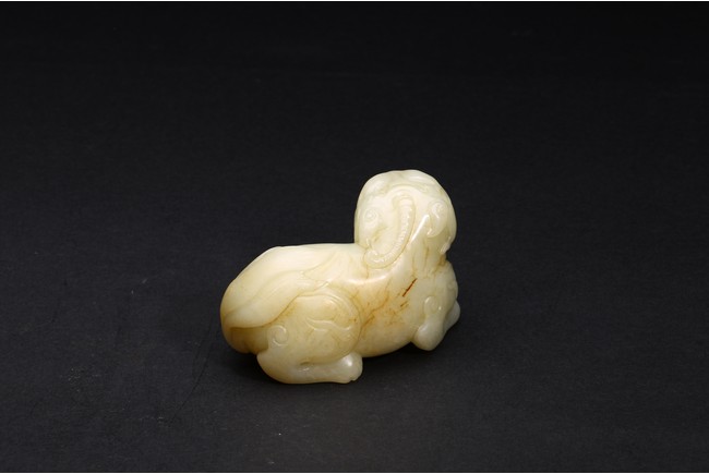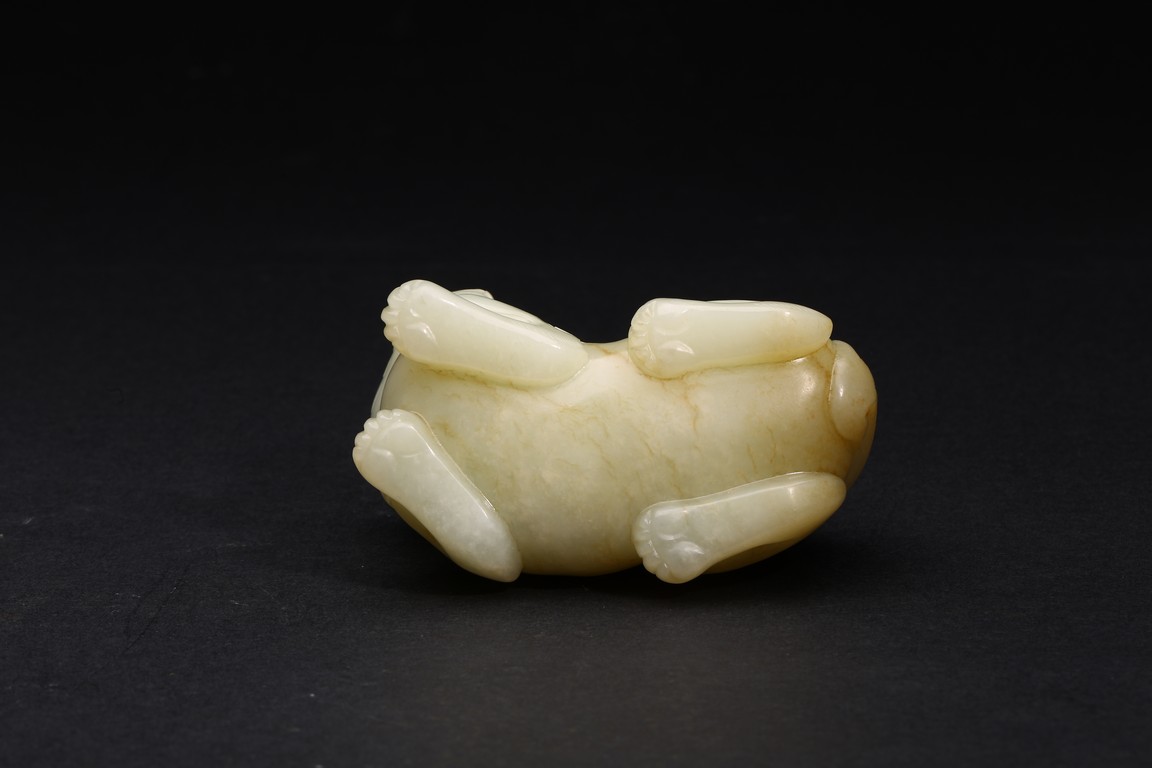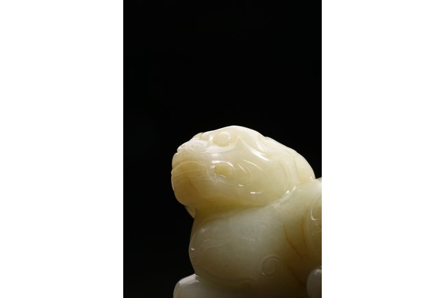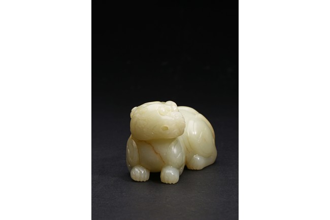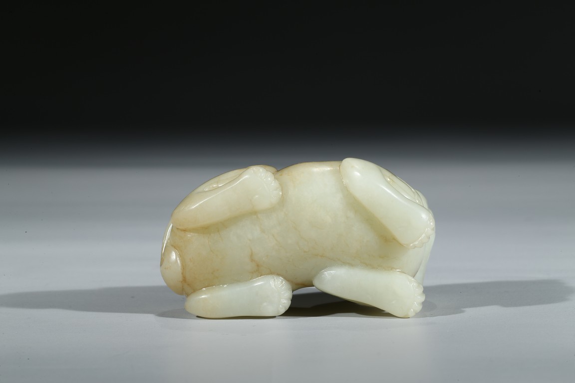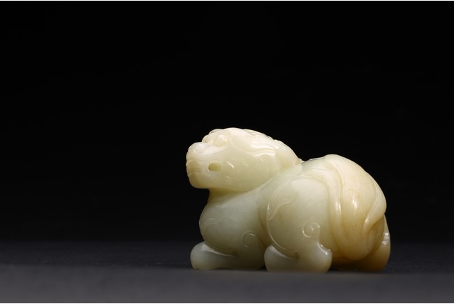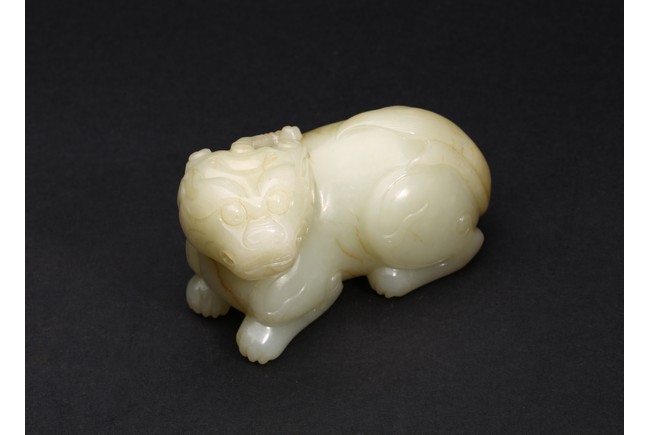 The mythical beast shown seated and worked in the round, detailed with winged haunches and thick bushy eyebrows, the stone is of white tone with russet veining. Qing Dynasty period.