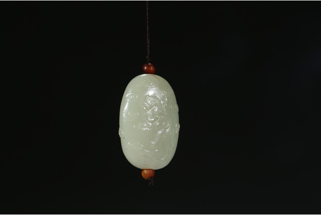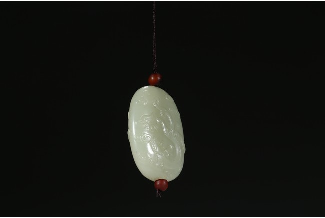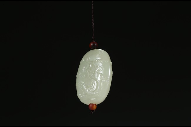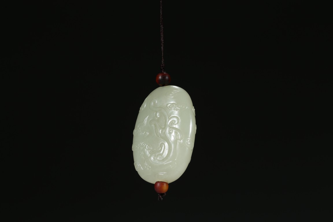 The pendant carved in relief to depict a sinuous chilong on both sides amidst auspicious clouds, the stone is of well polished white tone. Qing Dynasty period.