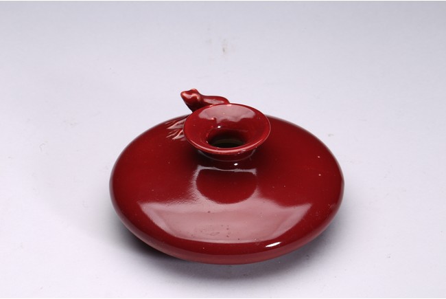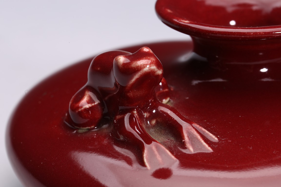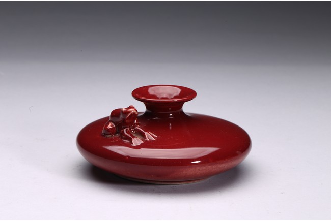 Of compressed globular form, the body carved with a frog in high relief, overall suffused with attractive red glaze.